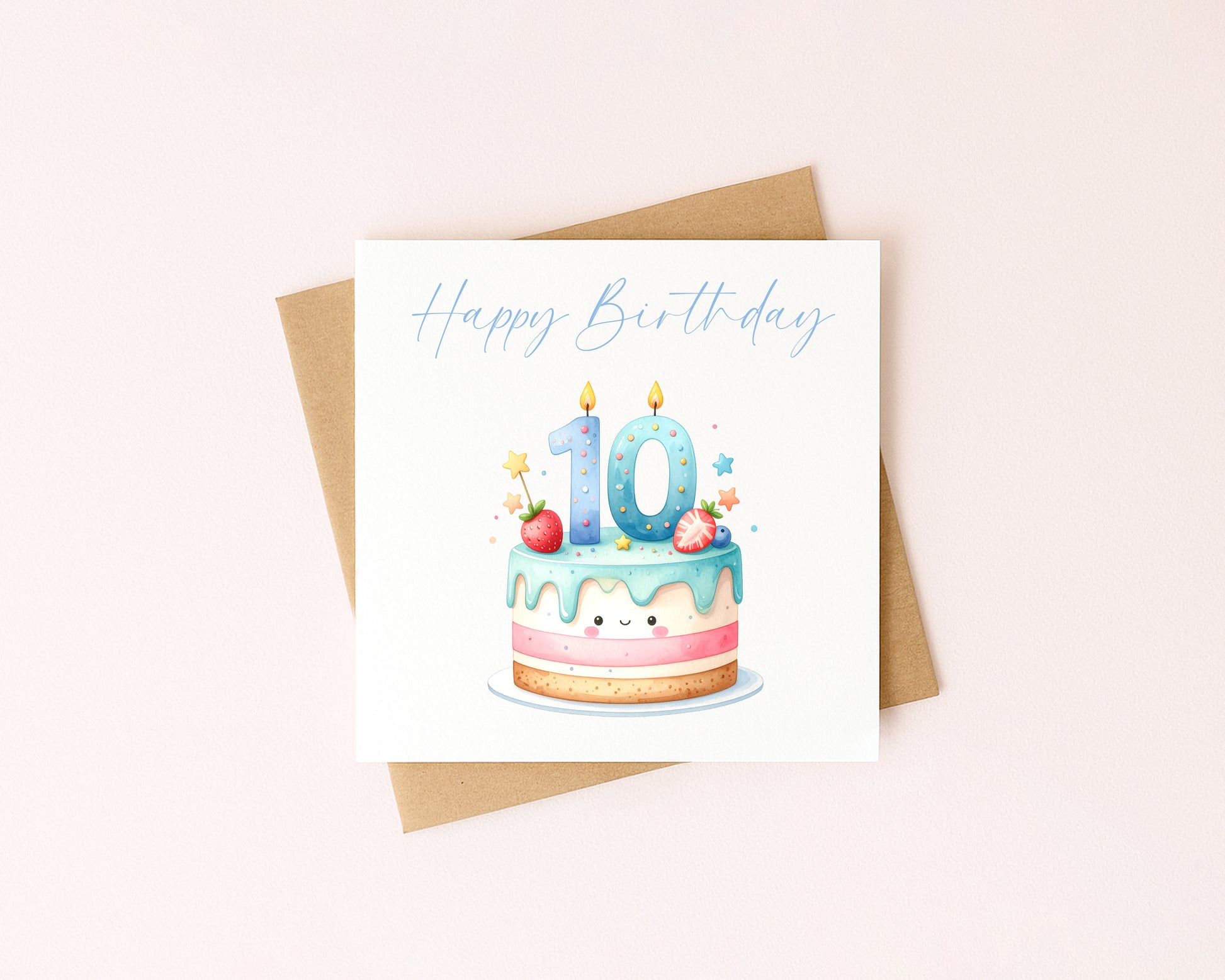 10th Birthday Card Blue Pink Yellow Cake Number 10 with Envelope