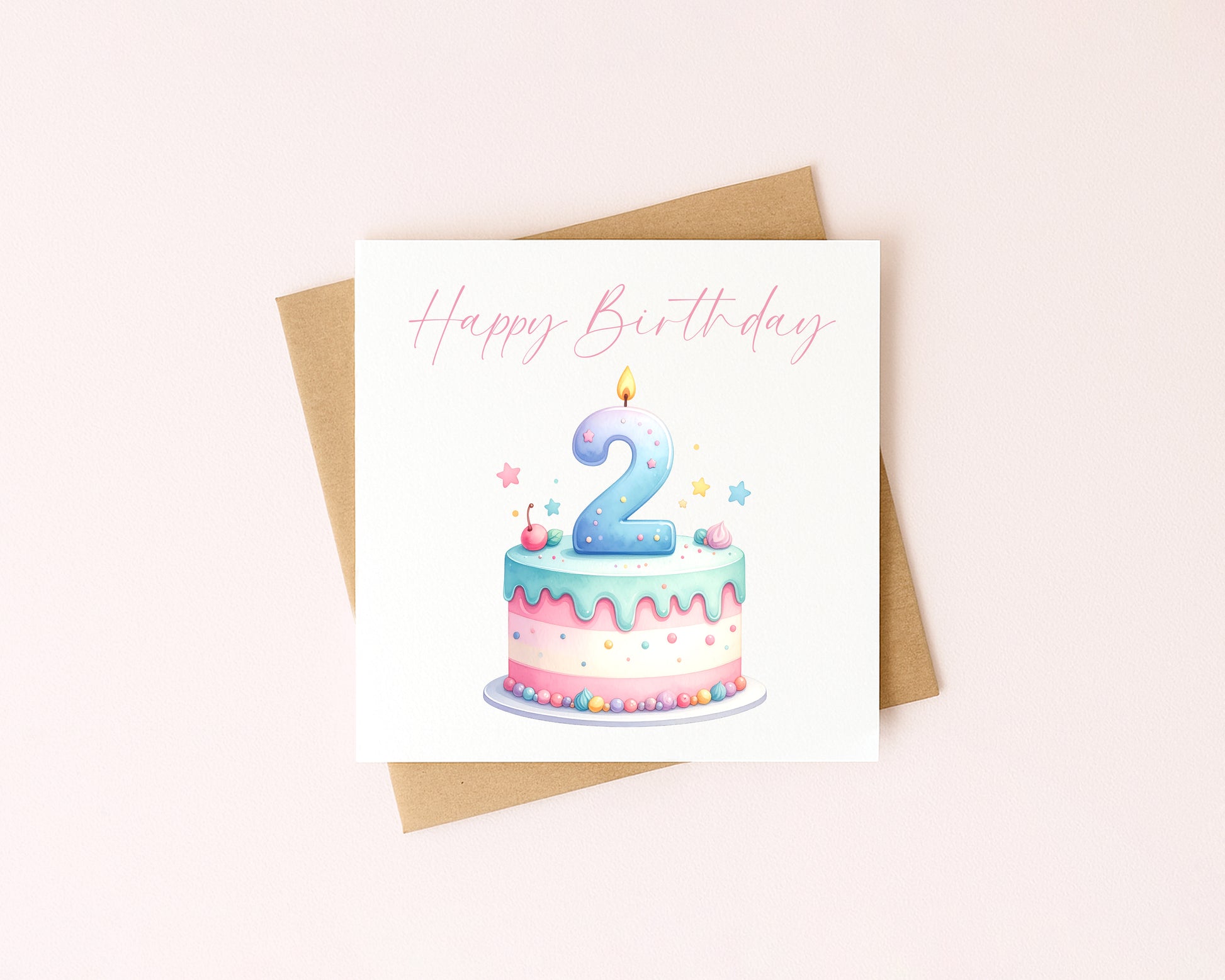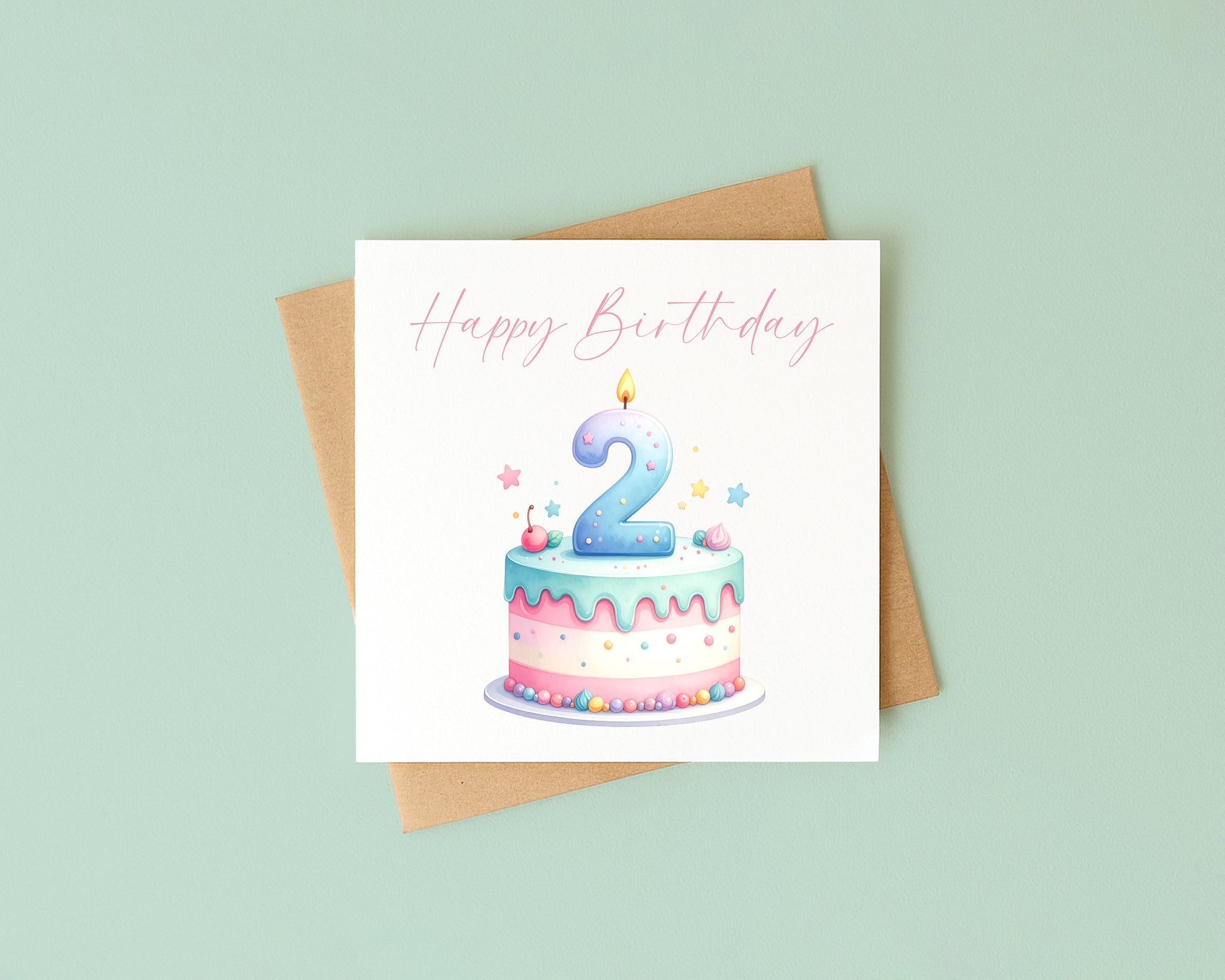 2nd Birthday Card Pink, Blue, & Green Cake Number 2 with Envelope. Makes the perfect card to gift to someone on that significant or sentimental birthday!