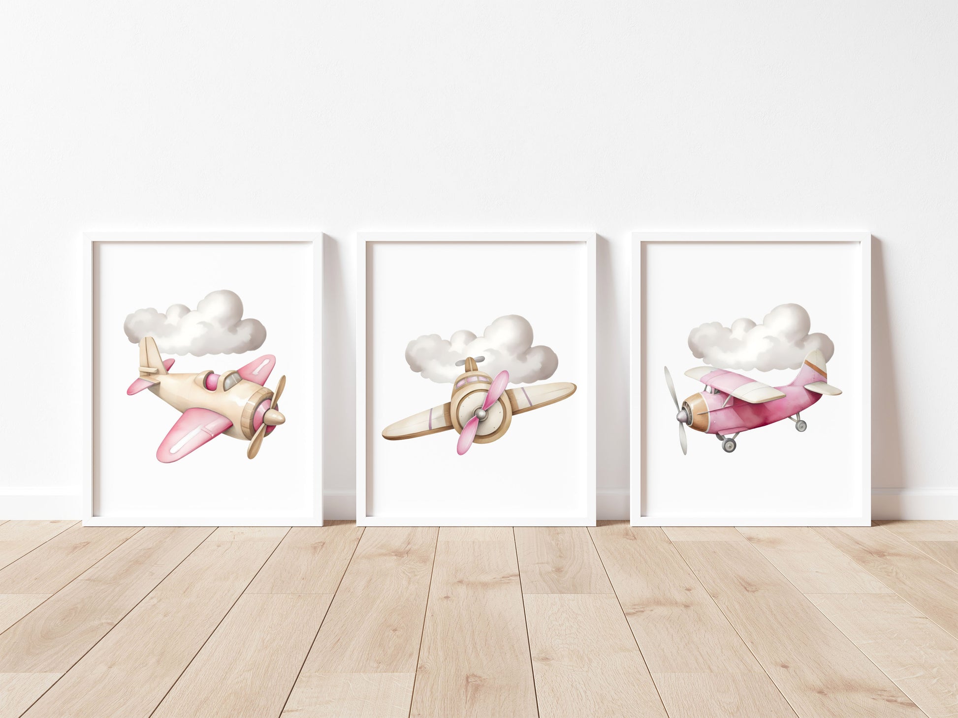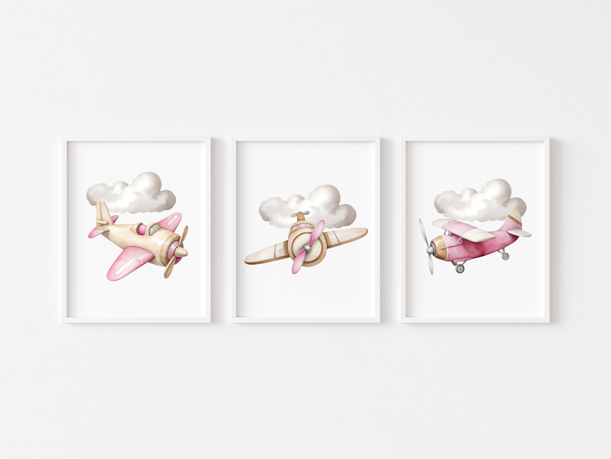 Air transport print set, aviation aeroplane pink beige girls transport wall art (unframed)