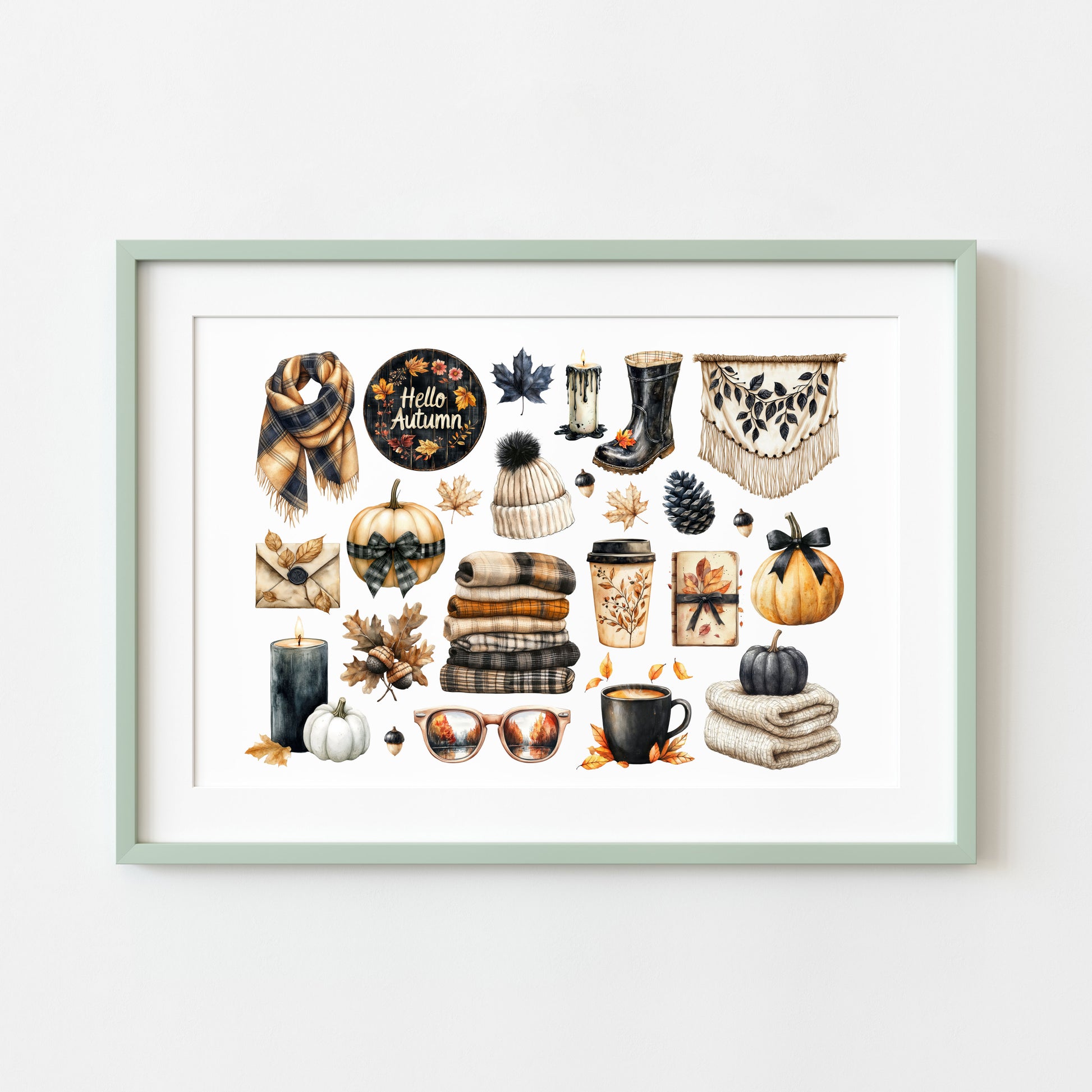 Autumn Favourites Black & Orange mood board art print Watercolour Seasonal Wall Art (unframed)