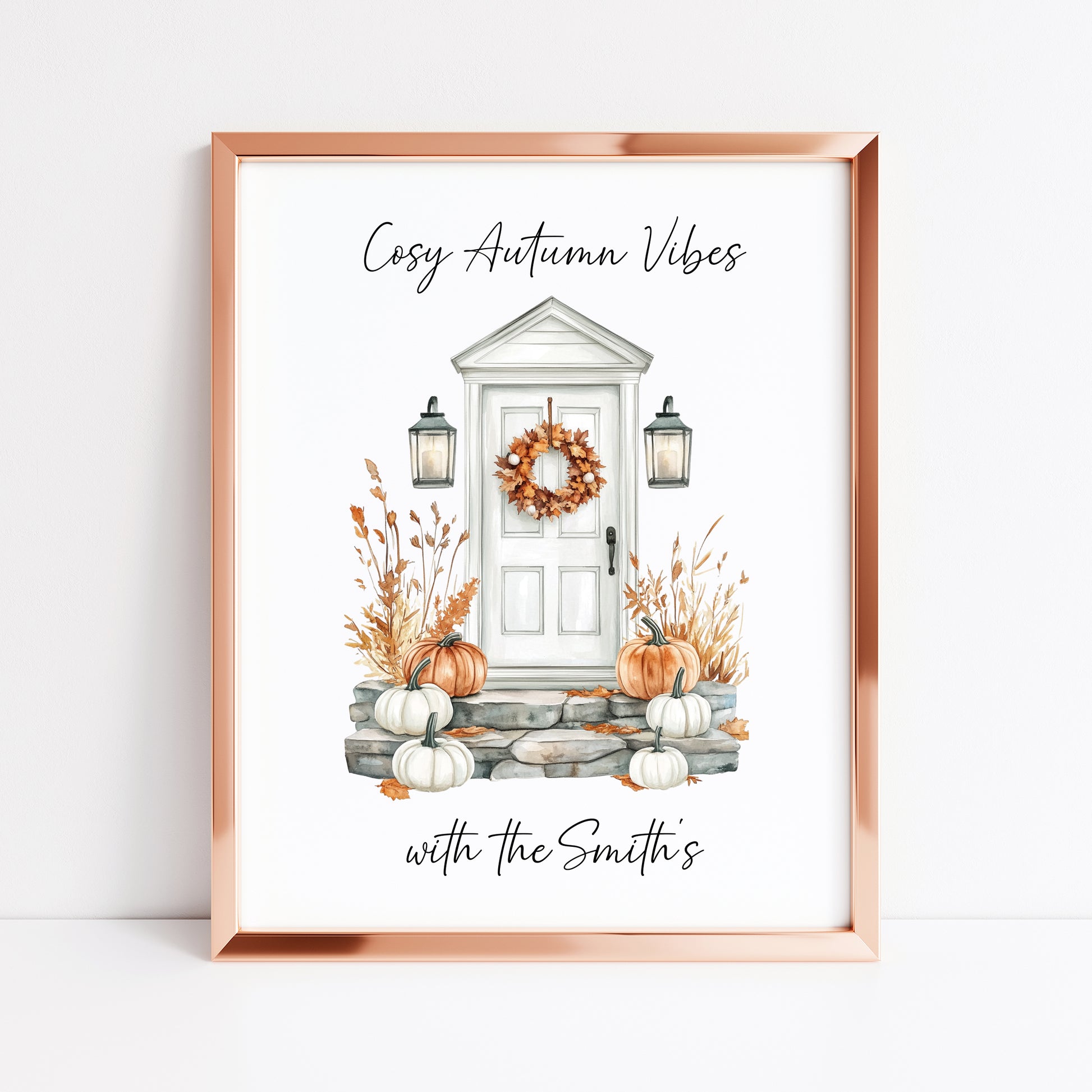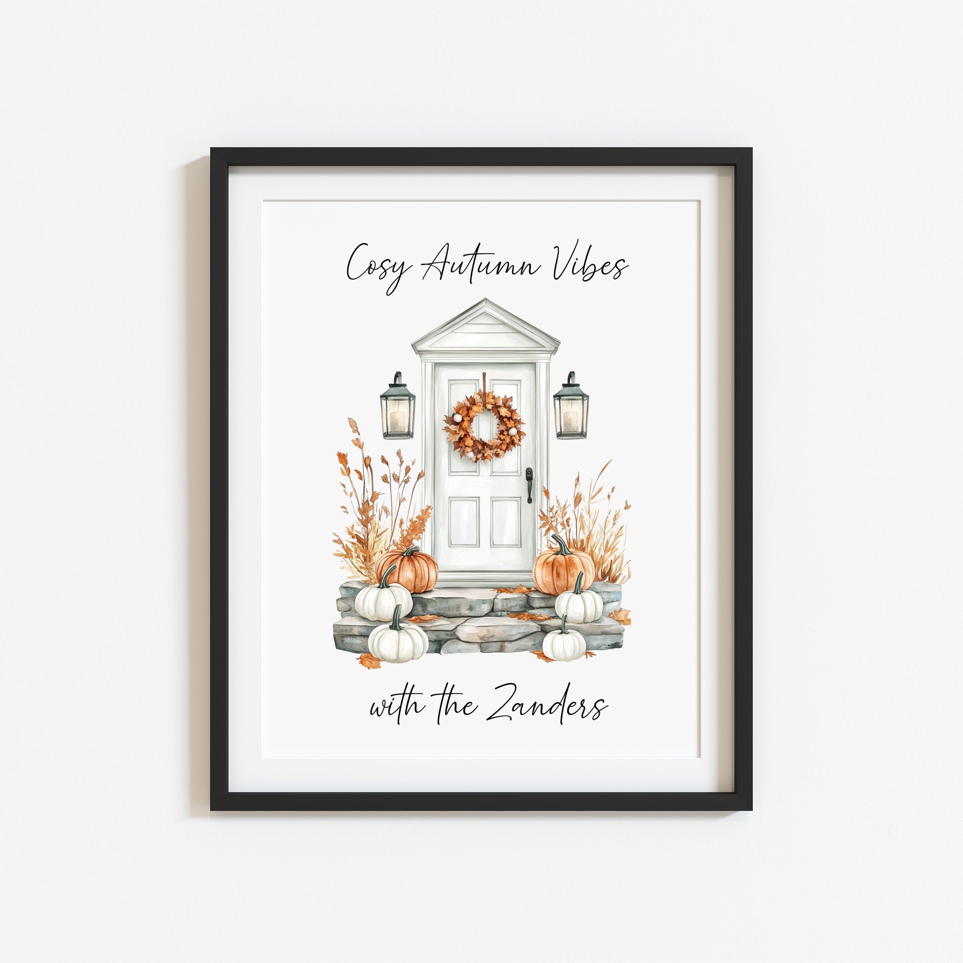 Autumn print, Cosy Autumn vibes with personalised family name Autumn unframed wall art poster print, autumn decor autumn home front door art