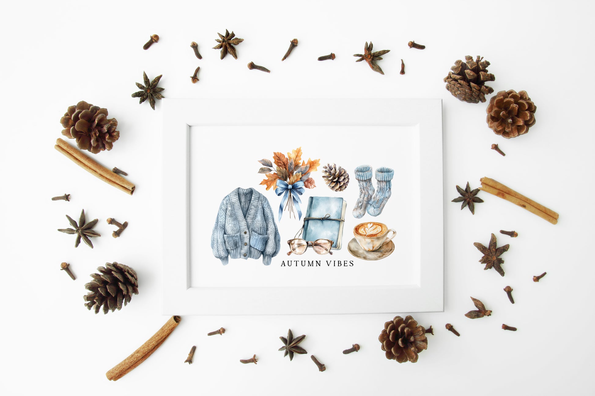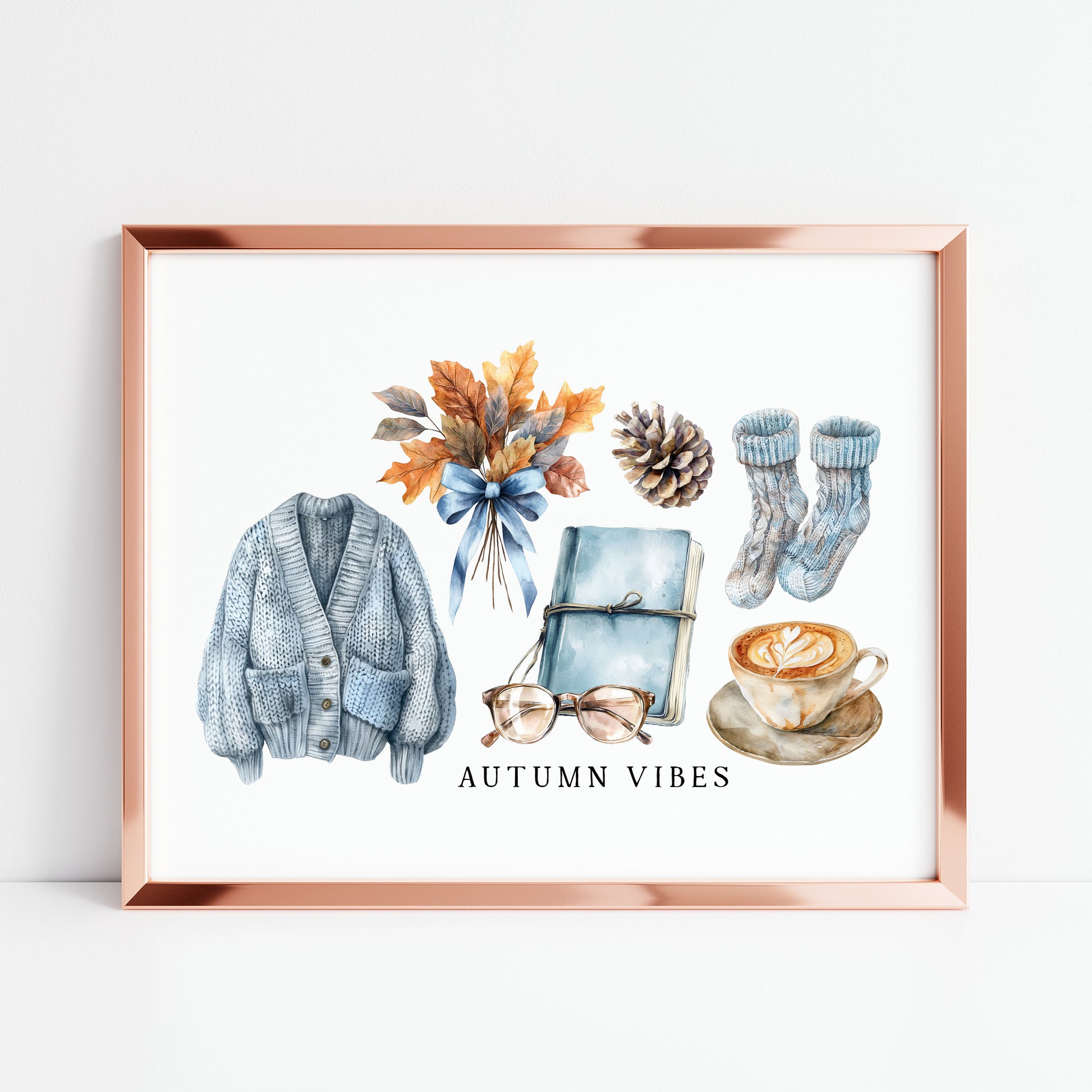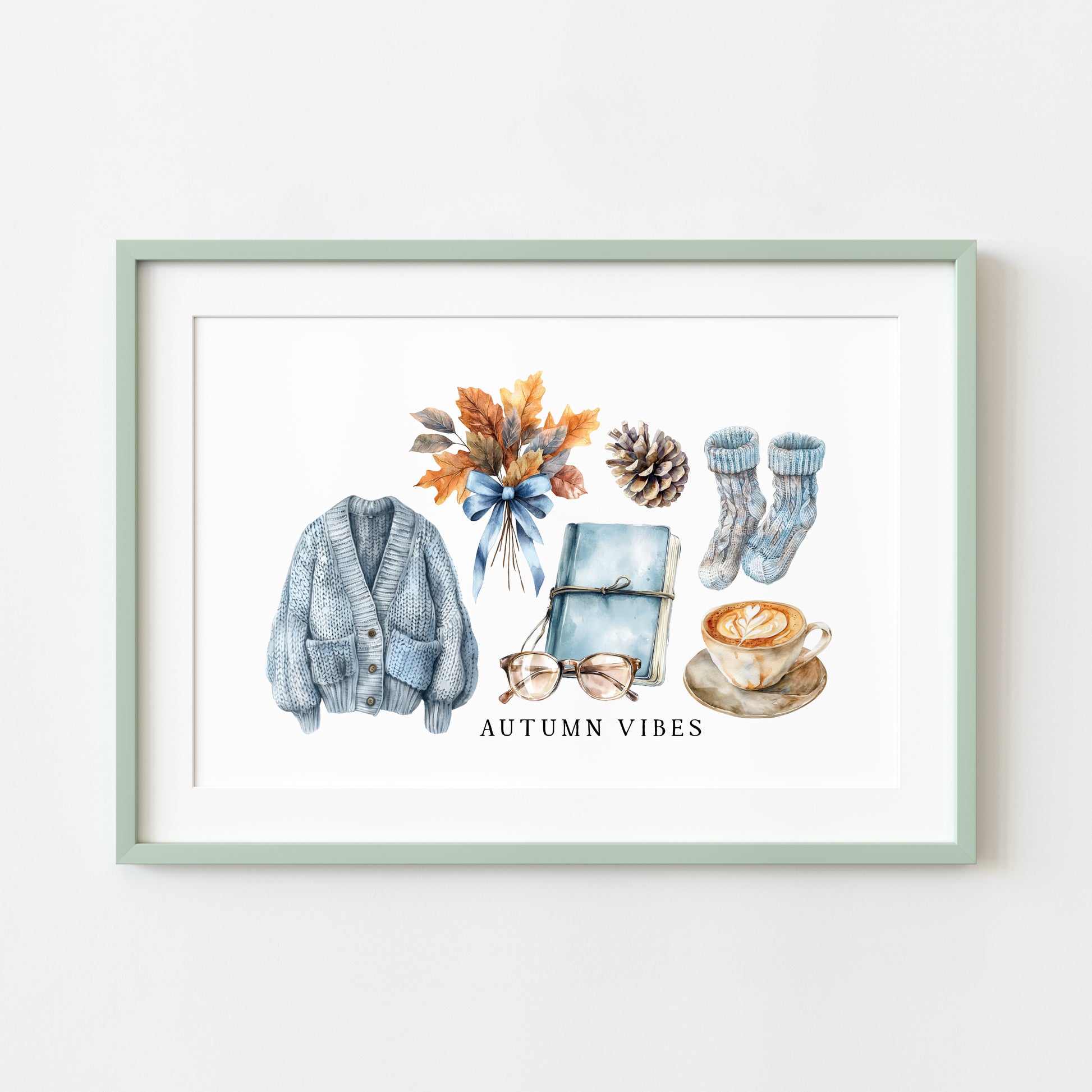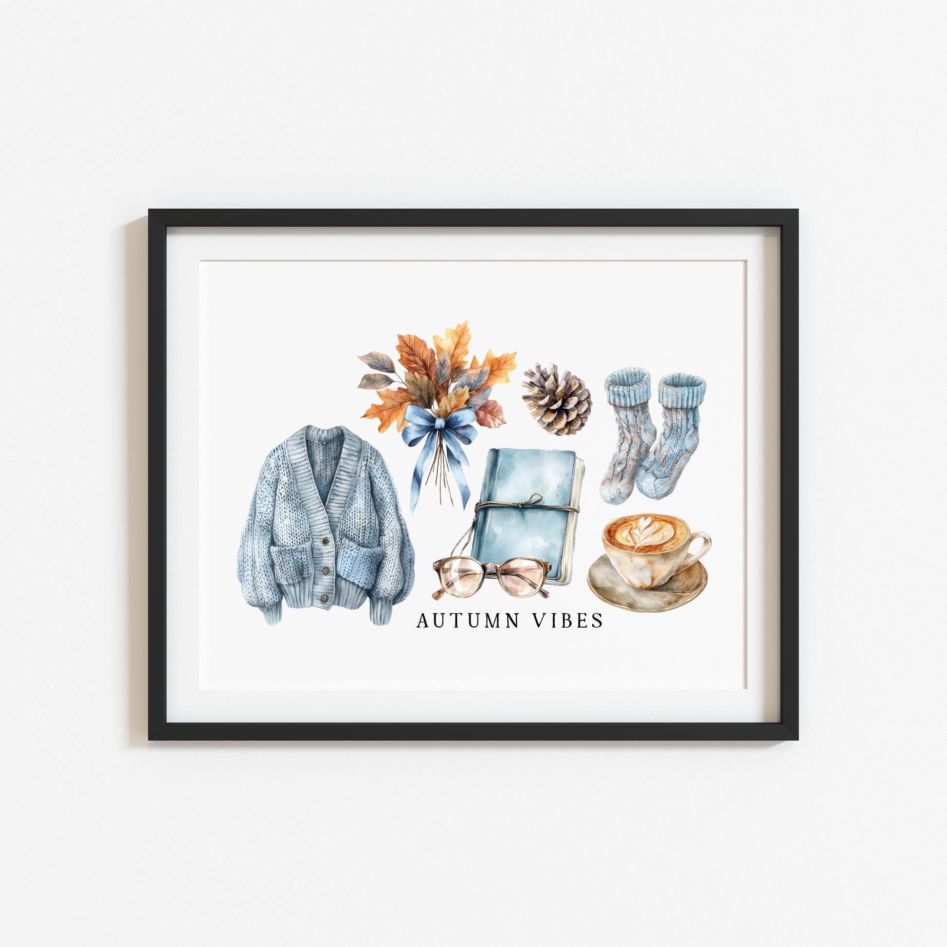 Autumn Vibes, blue cardi jumper acorns pumpkins coffee cosy Autumn landscape unframed wall art poster print, autumn home decor autumn decor