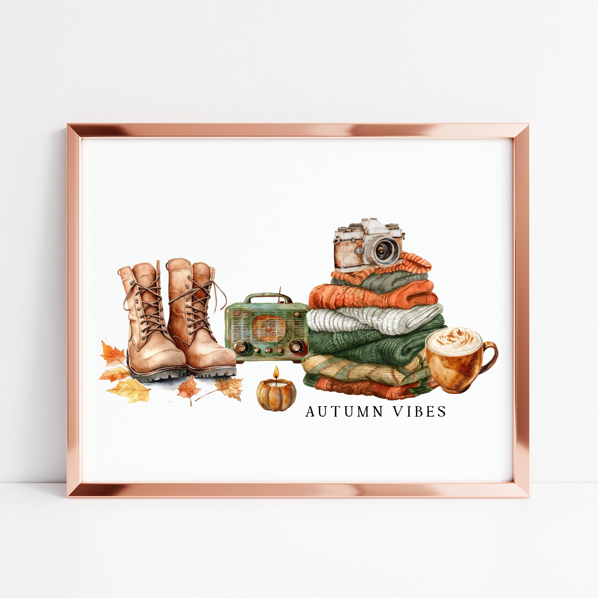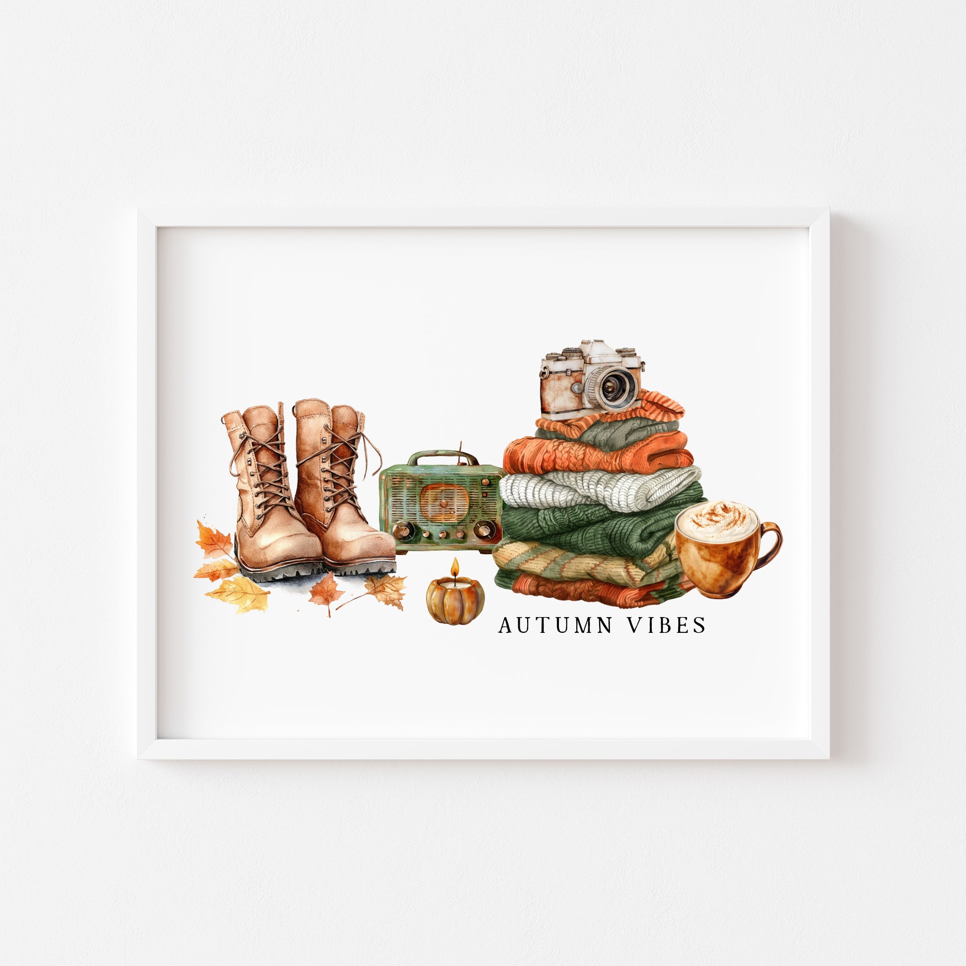 Autumn Vibes, jumper stack orange green pumpkins coffee cosy Autumn landscape unframed wall art poster print, autumn home decor autumn decor