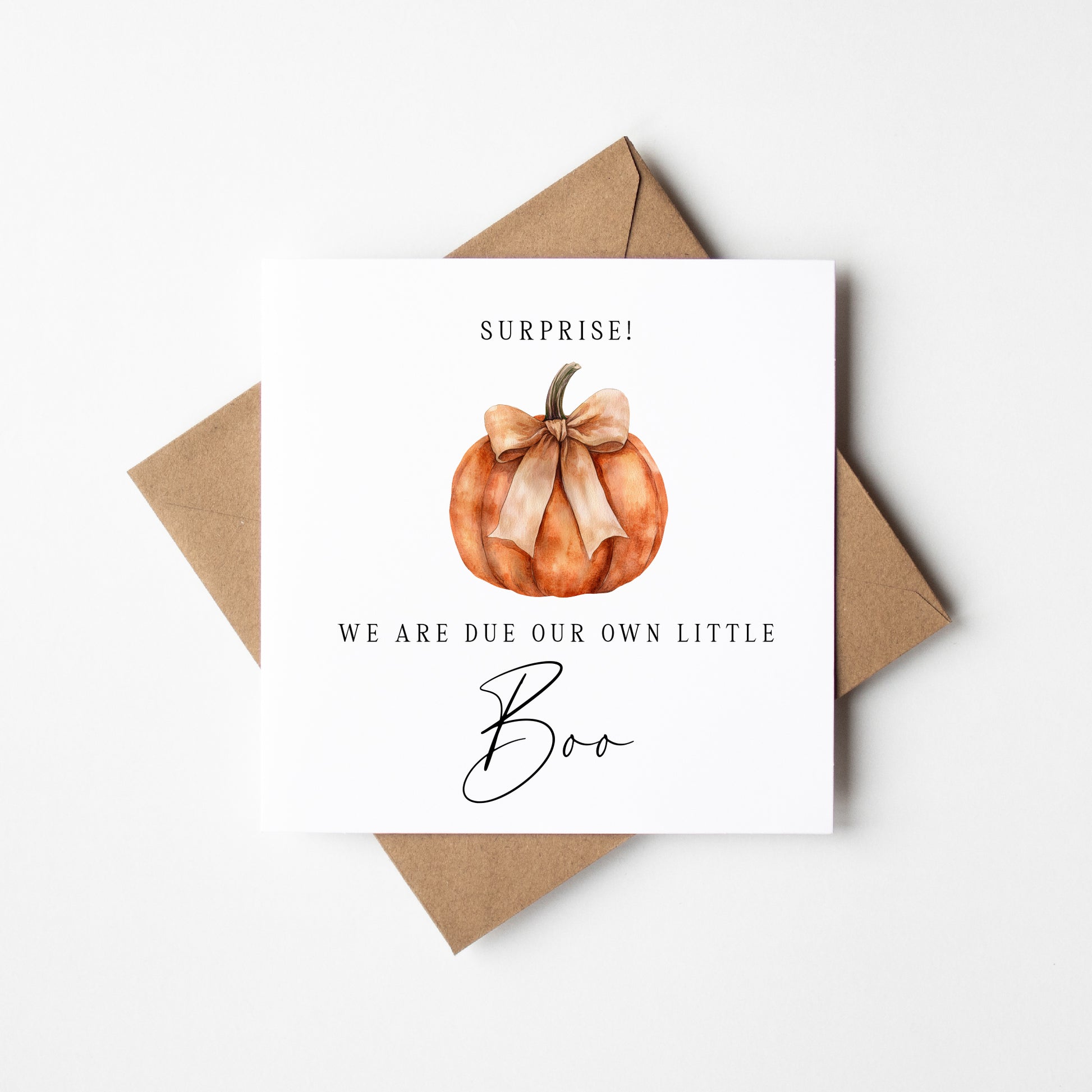 Baby Boo due, Surprise fall pumpkin Autumn seasonal surprise baby announcement card with envelope, new baby due, pumpkin baby boo due card