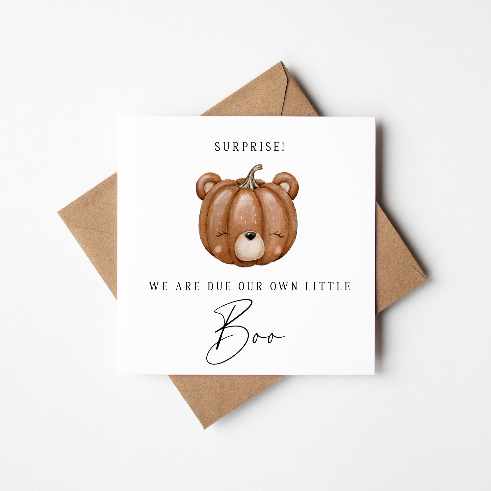 Baby Boo due, Surprise fall pumpkin Autumn seasonal surprise baby bear announcement card with envelope, new baby due, baby boo due card