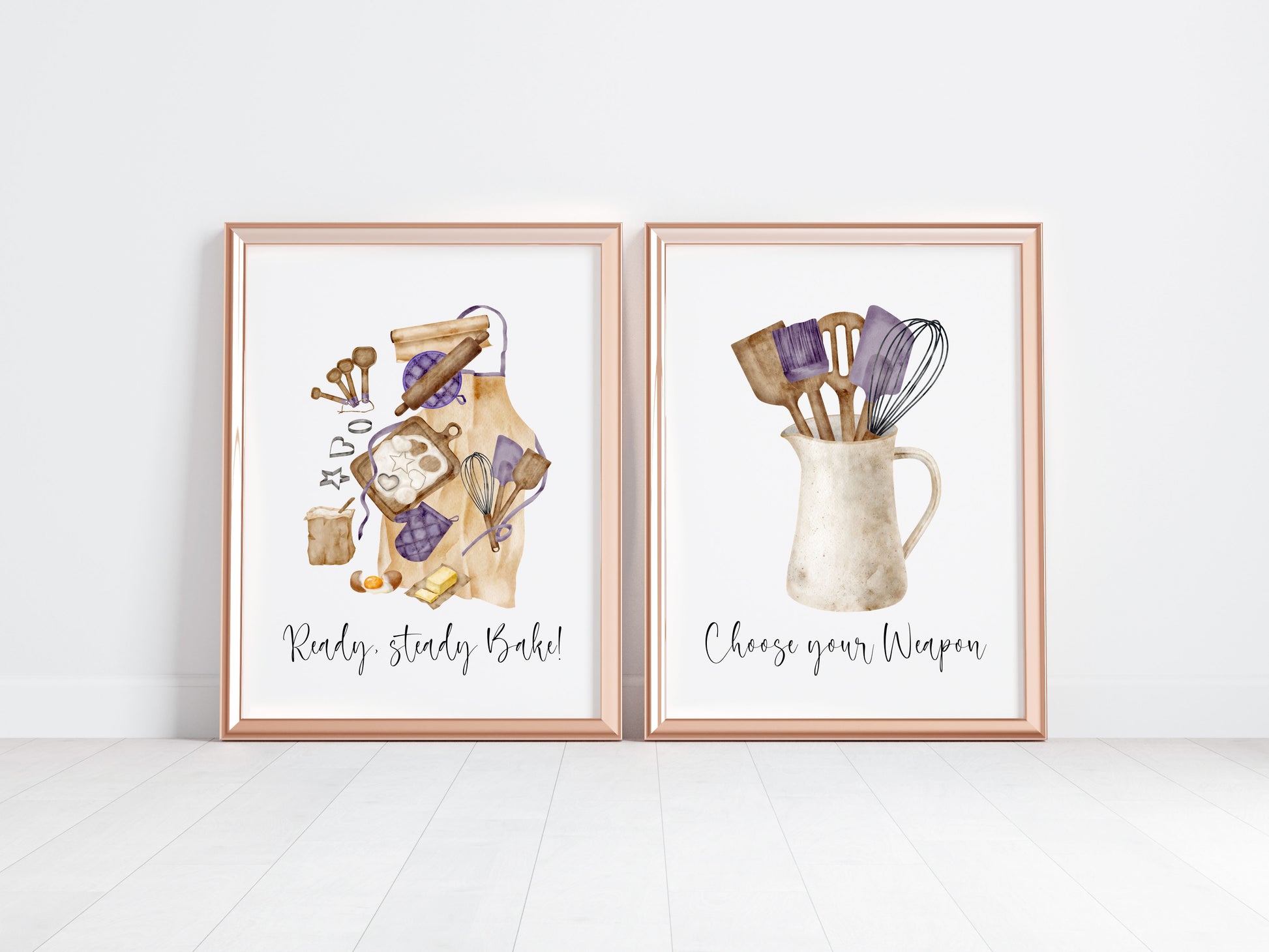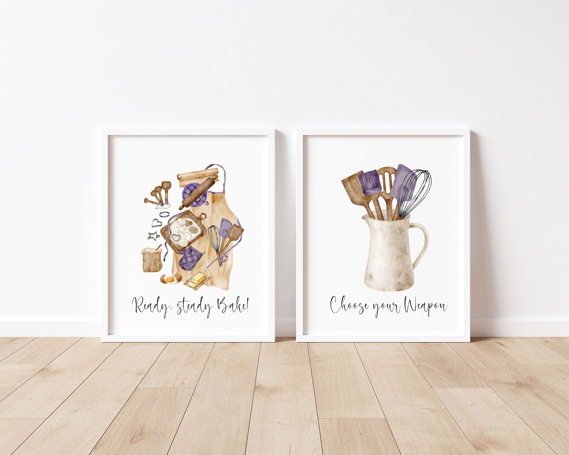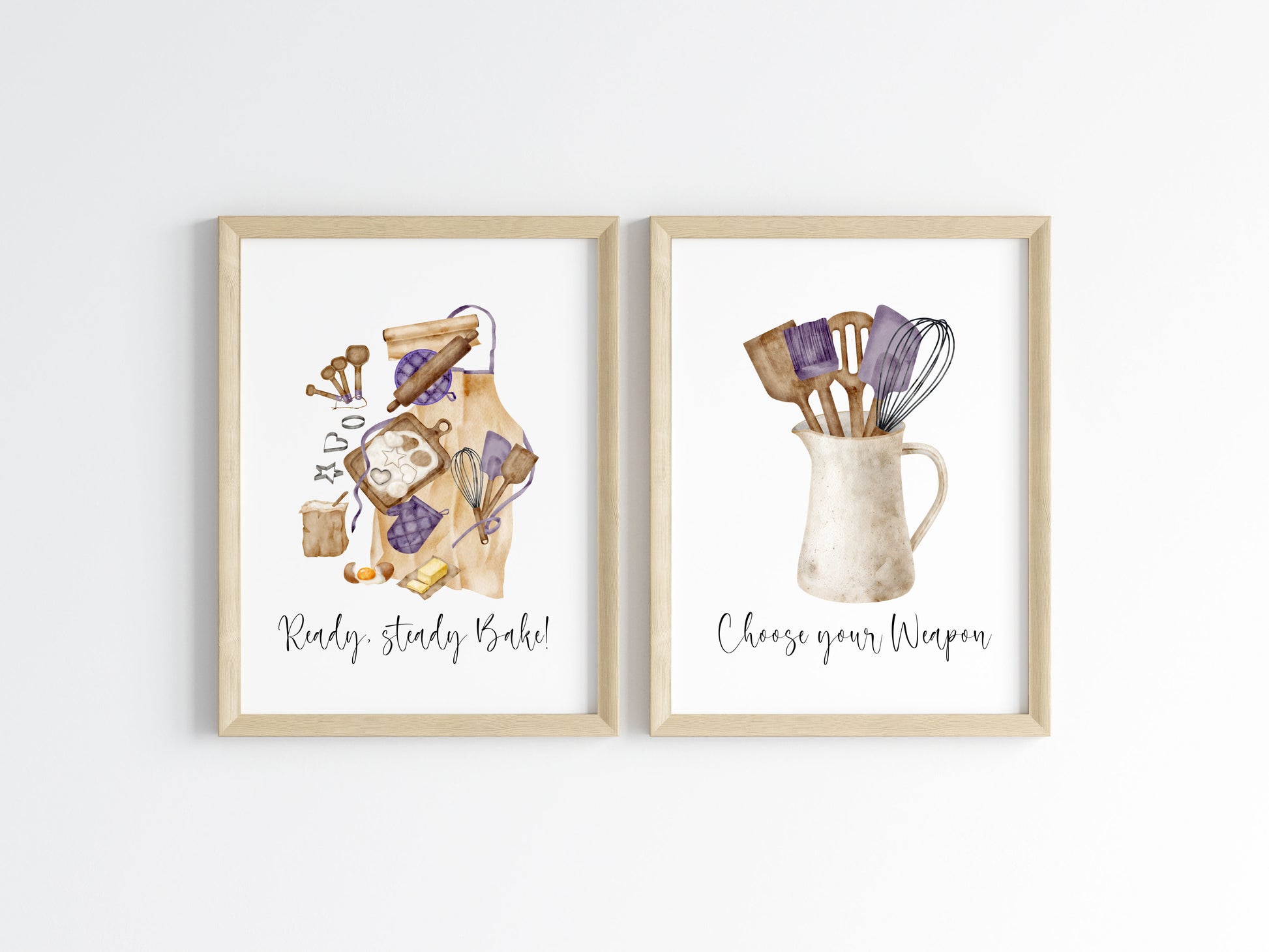 Baking prints, Ready steady bake, choose your weapon purple baker utensils set of 2 Kitchen unframed wall art poster prints. Perfect for framing and styling in your kitchen area, or makes a great gift for that baker friend!