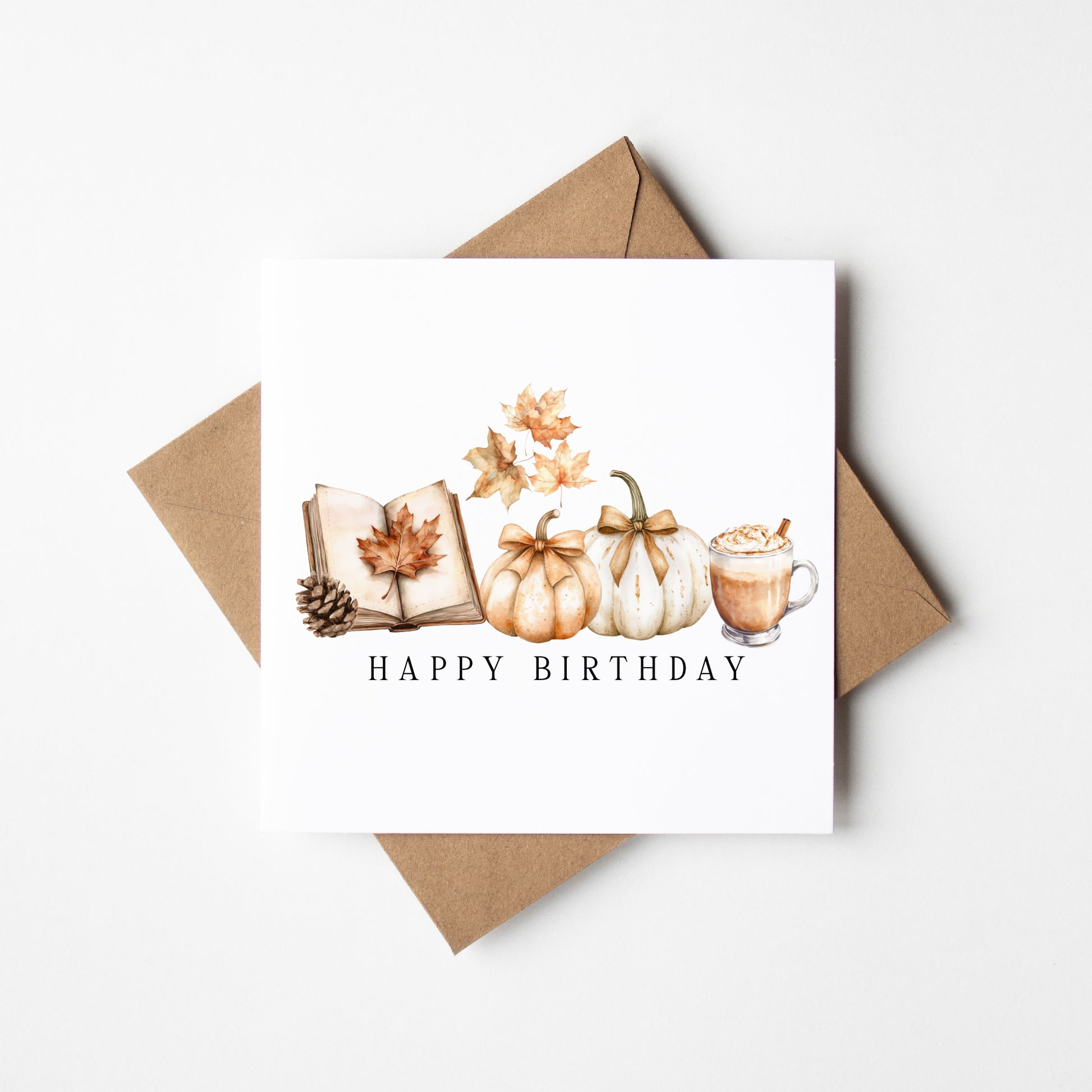 Birthday card, Cosy Autumn fall pumpkin books comfy October books treats seasonal fall birthday card unique birthday card with envelope