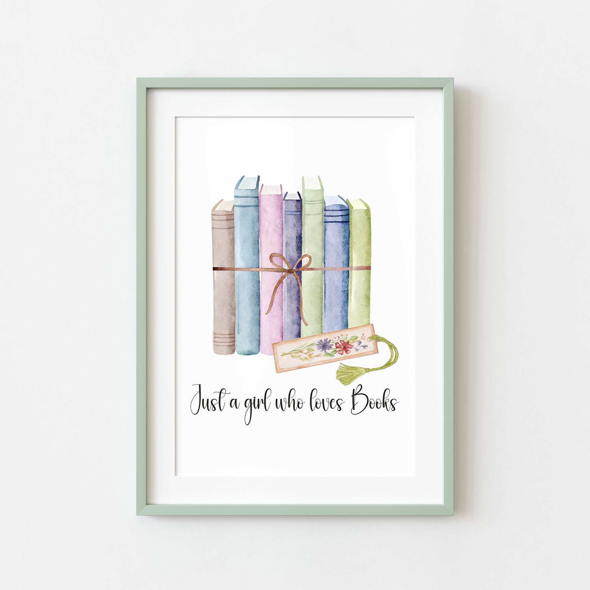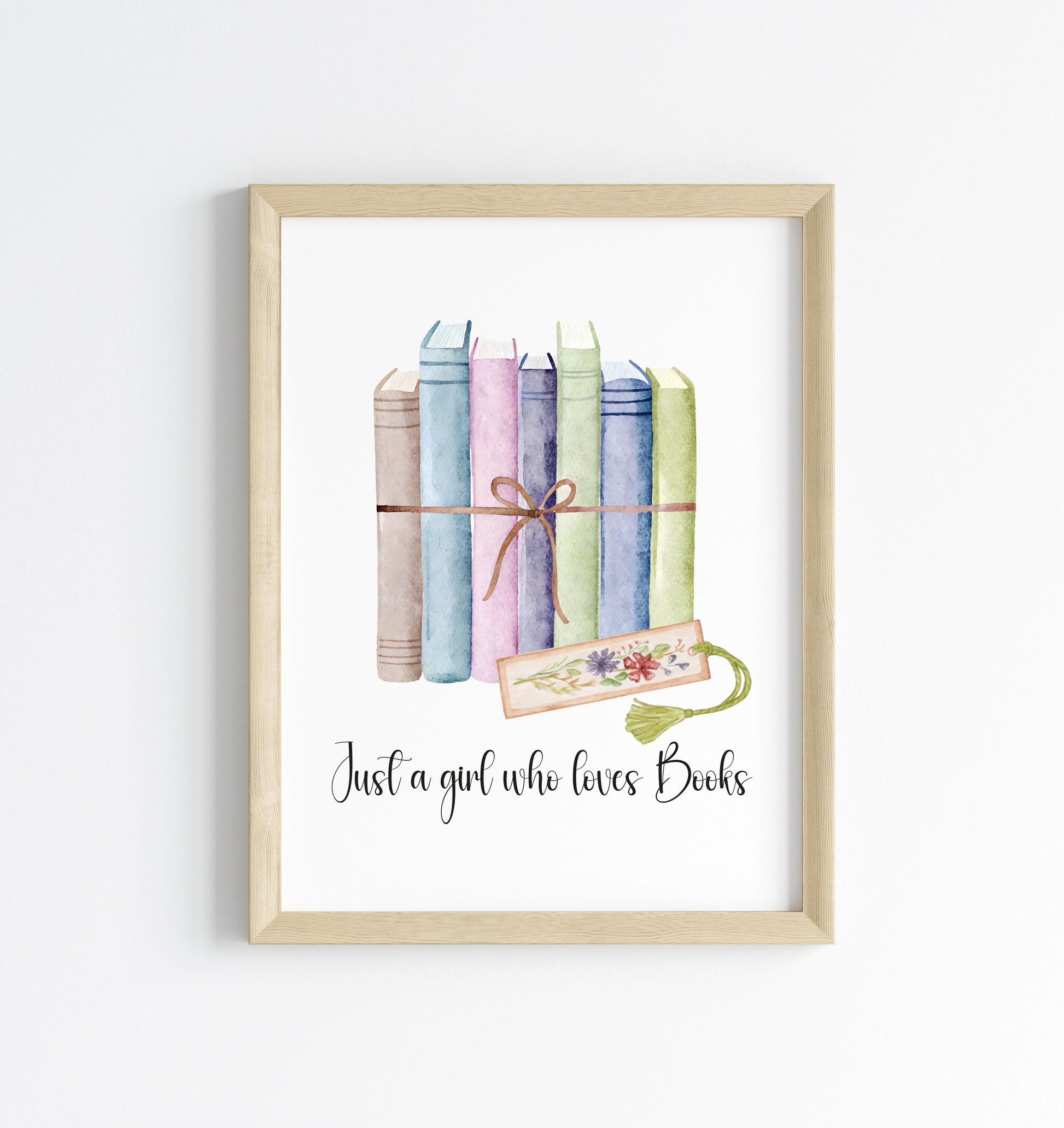 Book print, Just a girl who loves books, ribbon wrapped books & book mark reading Lover Wall Art (unframed)