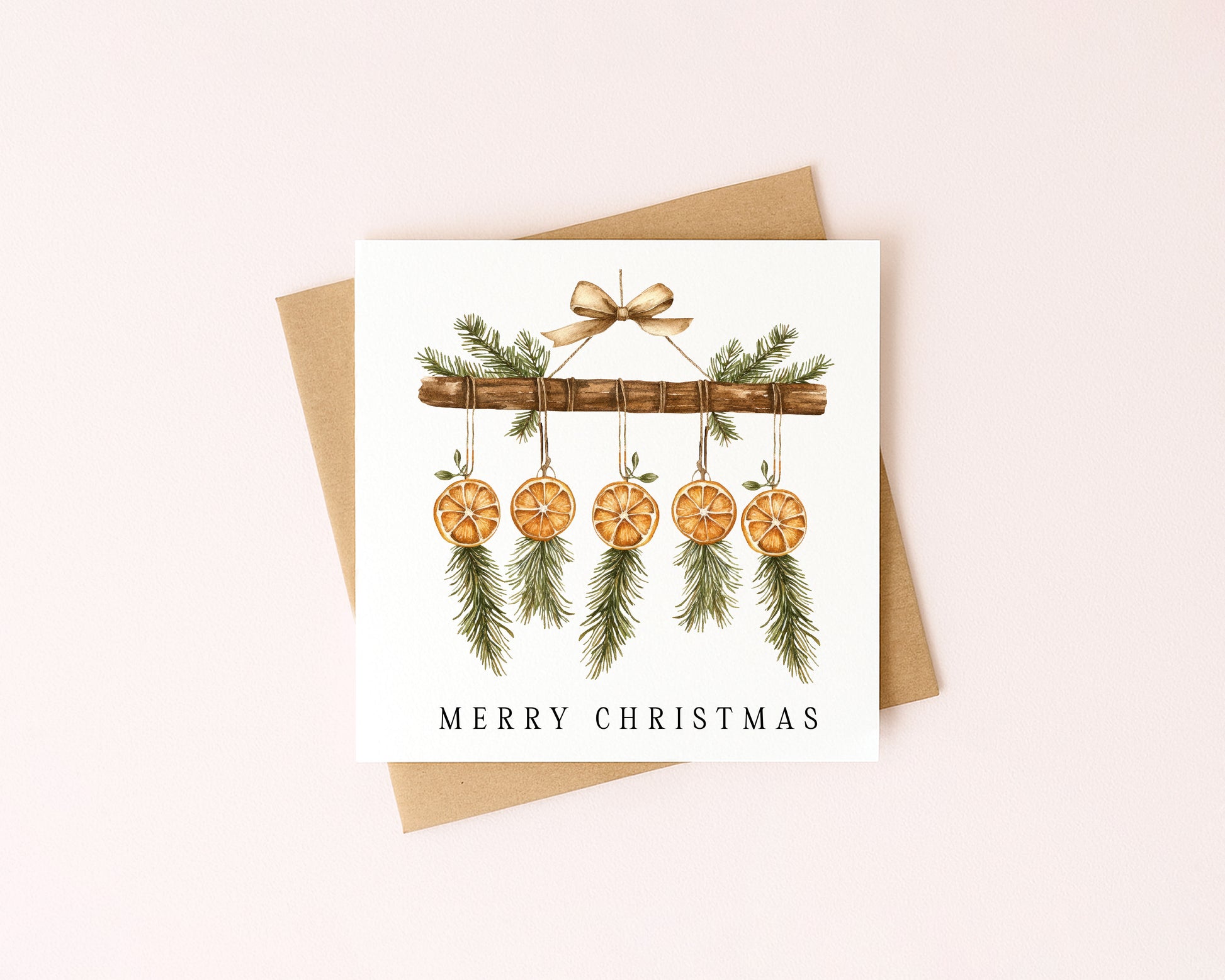 Christmas Card watercolour festive dried fruit orange & beige hanging decoration with envelope