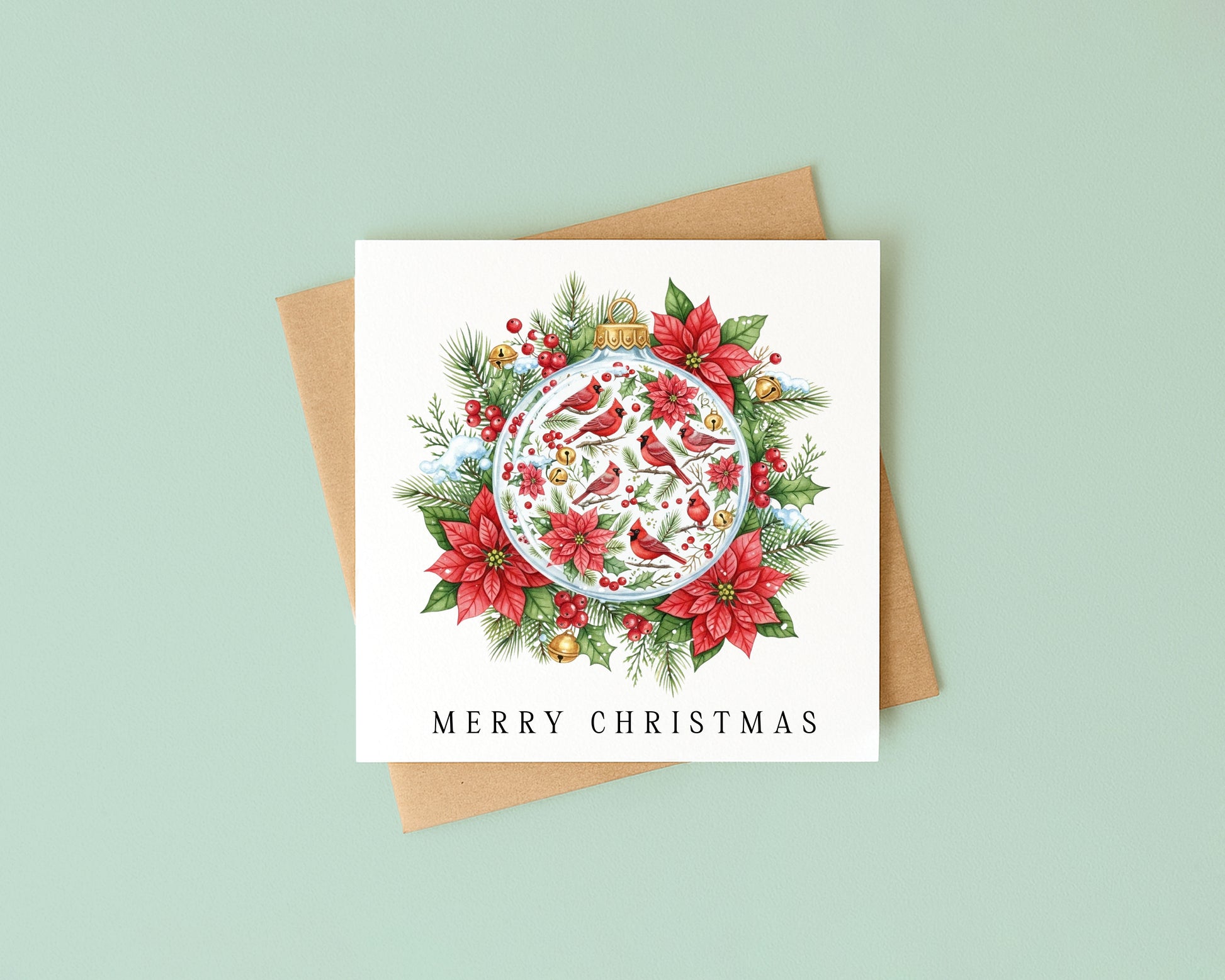 Christmas Card watercolour festive floral bright bauble decoration red & green with envelope