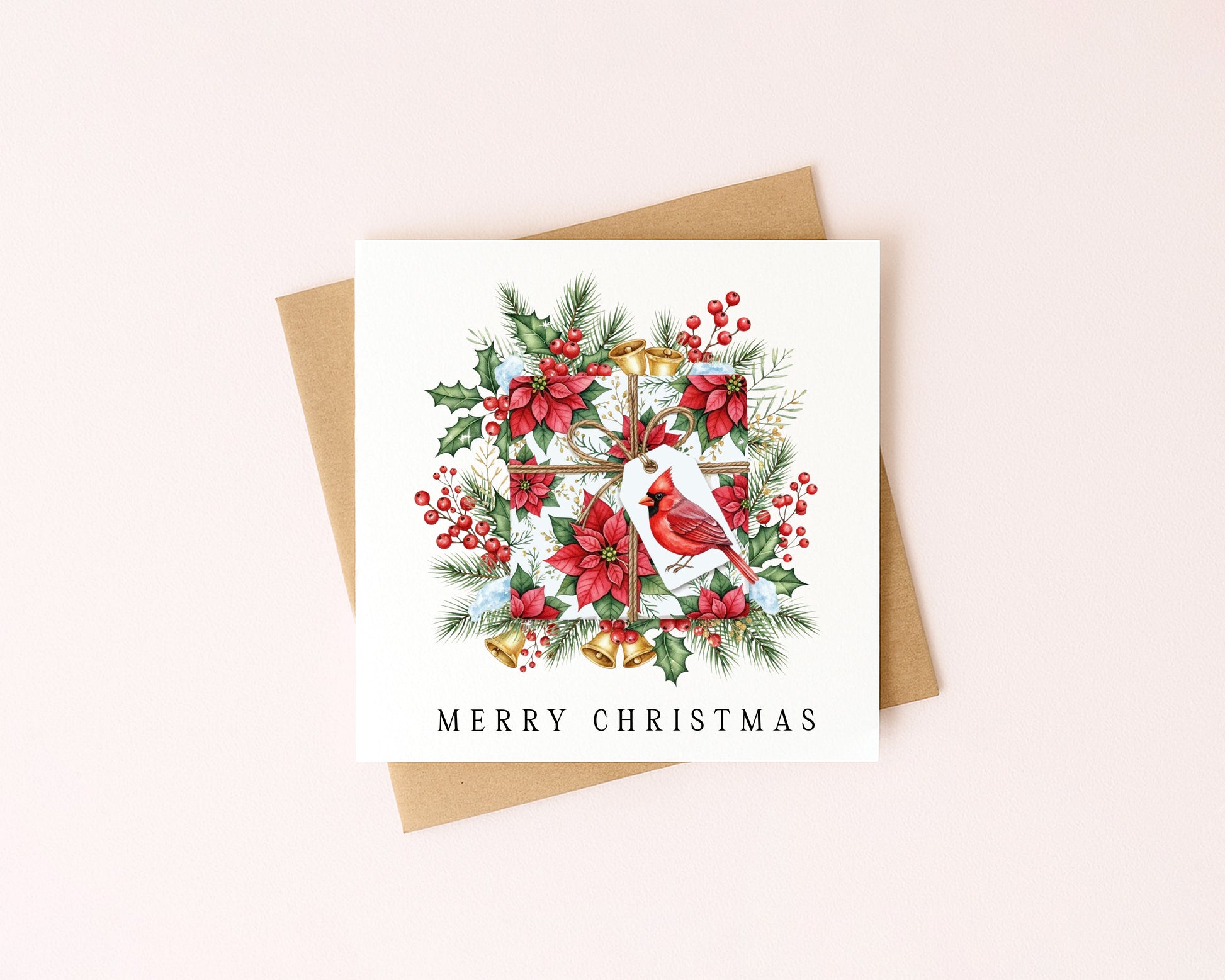 Christmas Card watercolour festive floral bright present decoration red & green with envelope