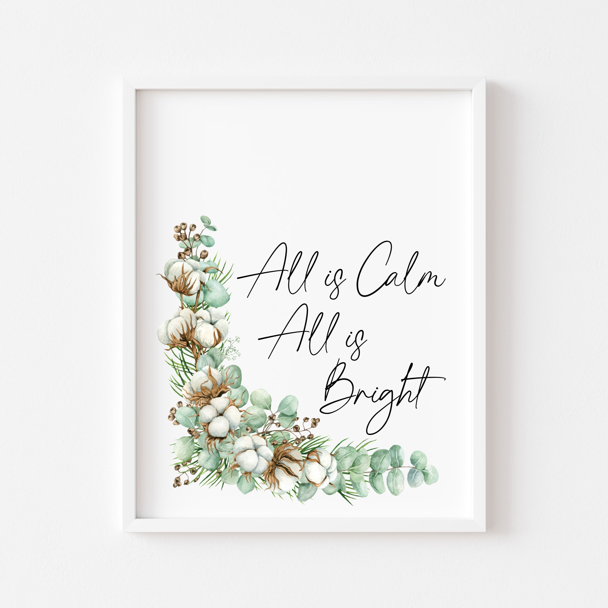 Christmas print All is calm, all is bright watercolour pinecones and cotton wreath unframed seasonal wall art poster