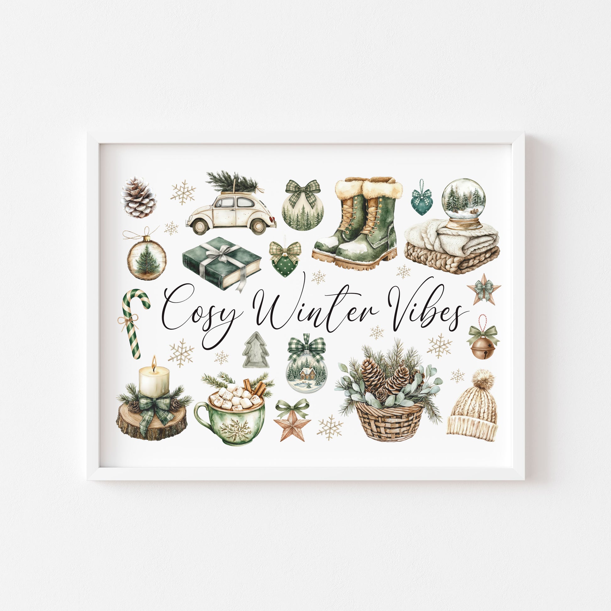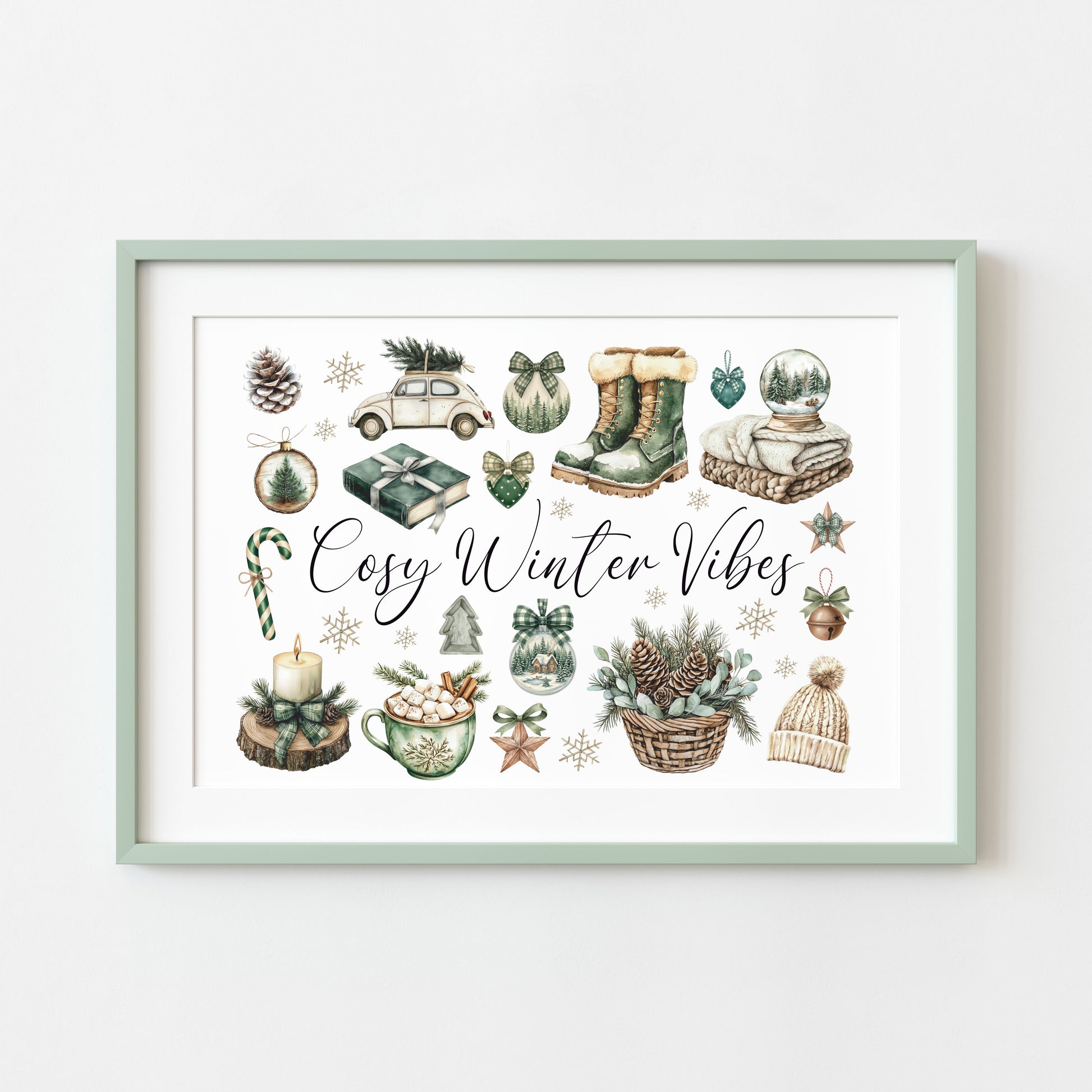 Christmas Print Cosy Winter Vibes festive green & beige watercolour Wall Art (unframed)