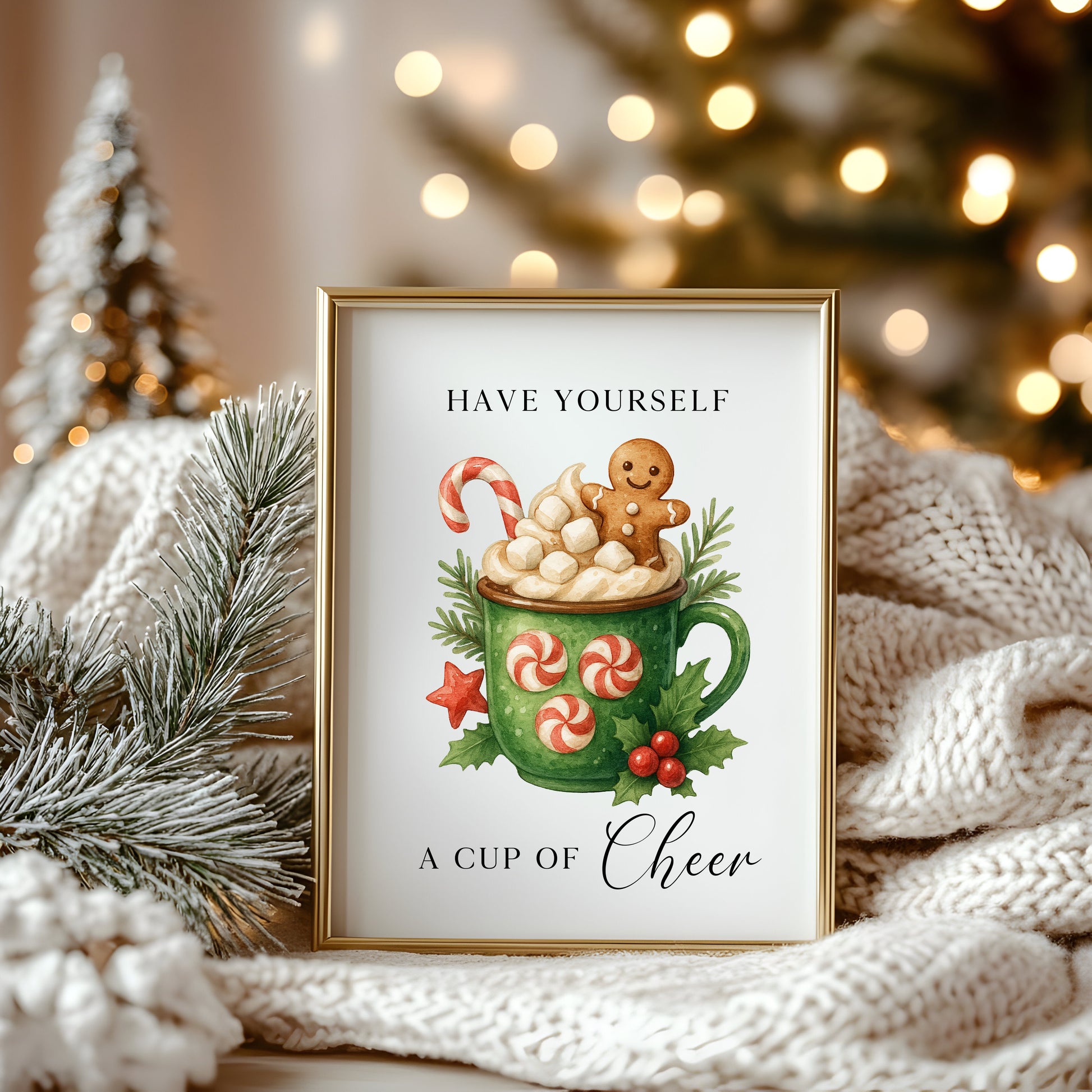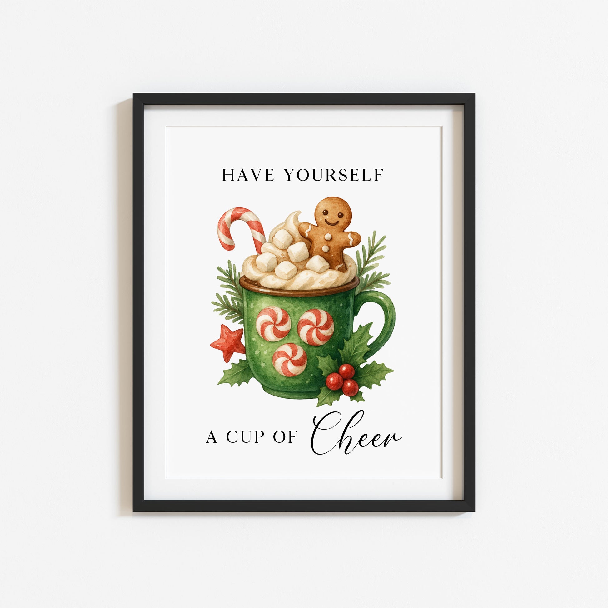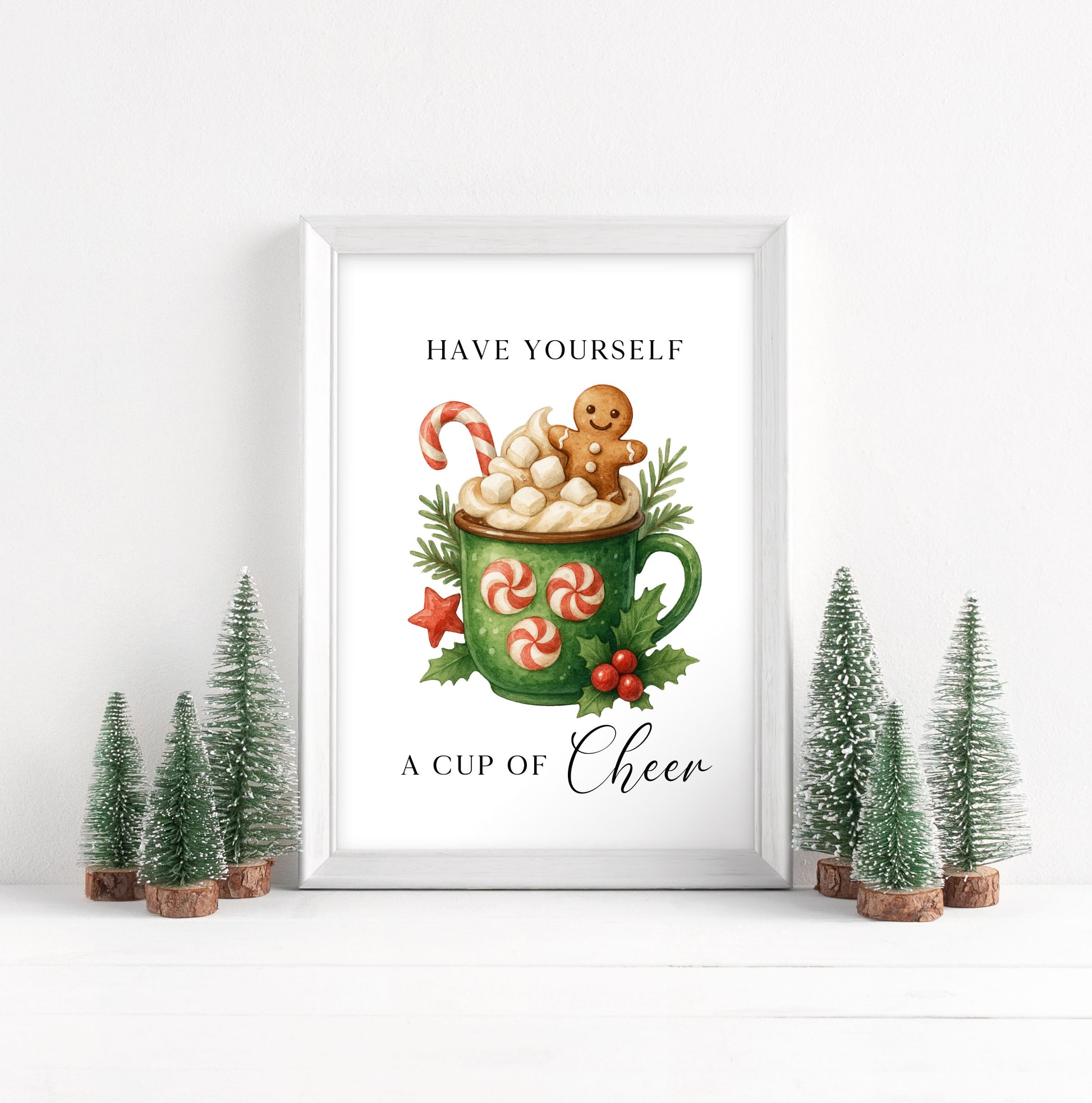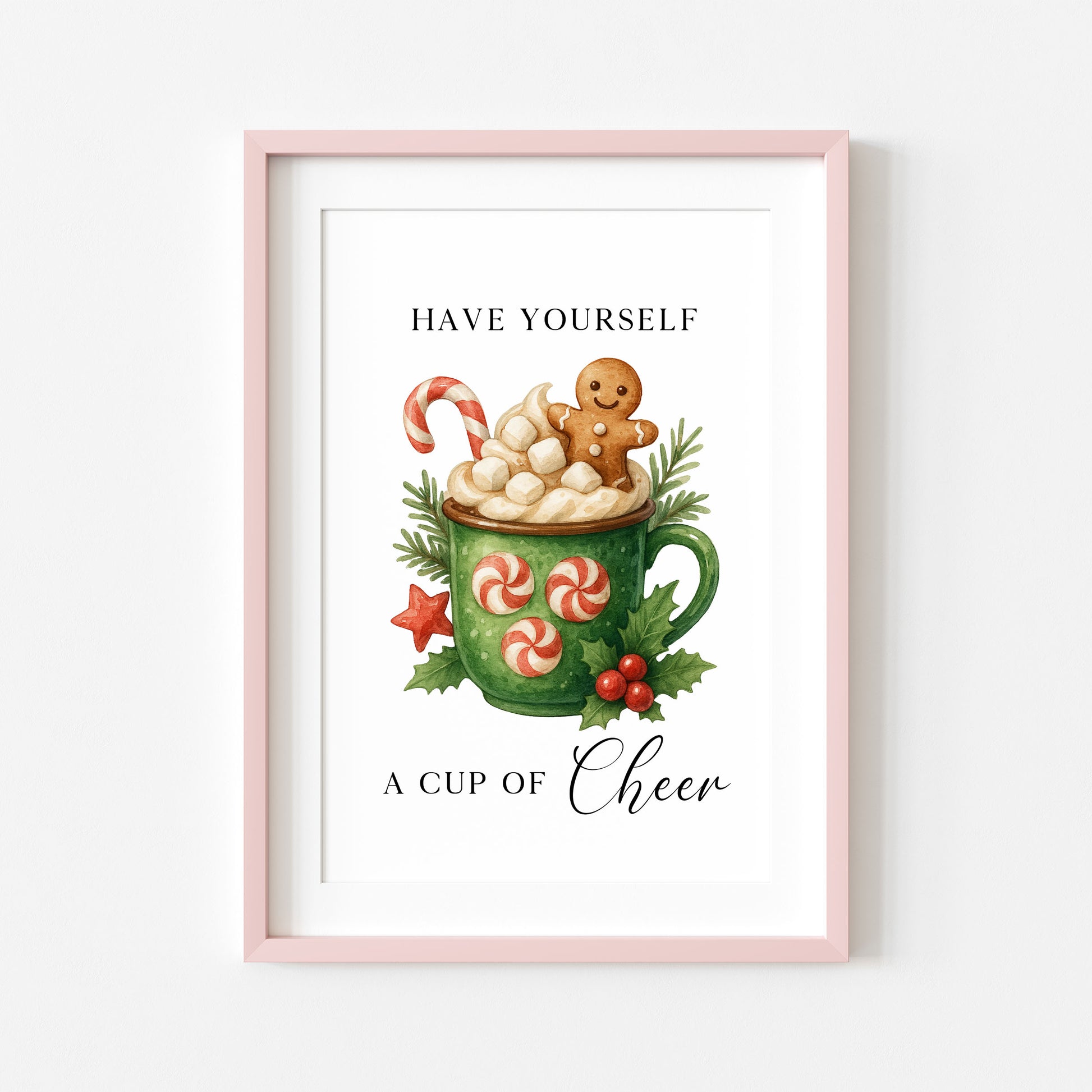 Christmas Print Cup of cheer vintage Red & Green watercolour hot drinks Wall Art (unframed)