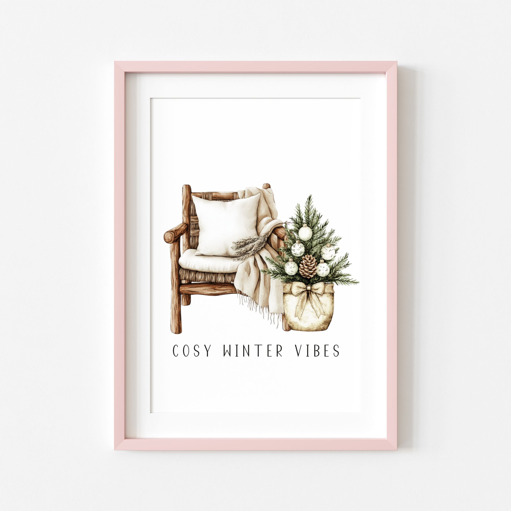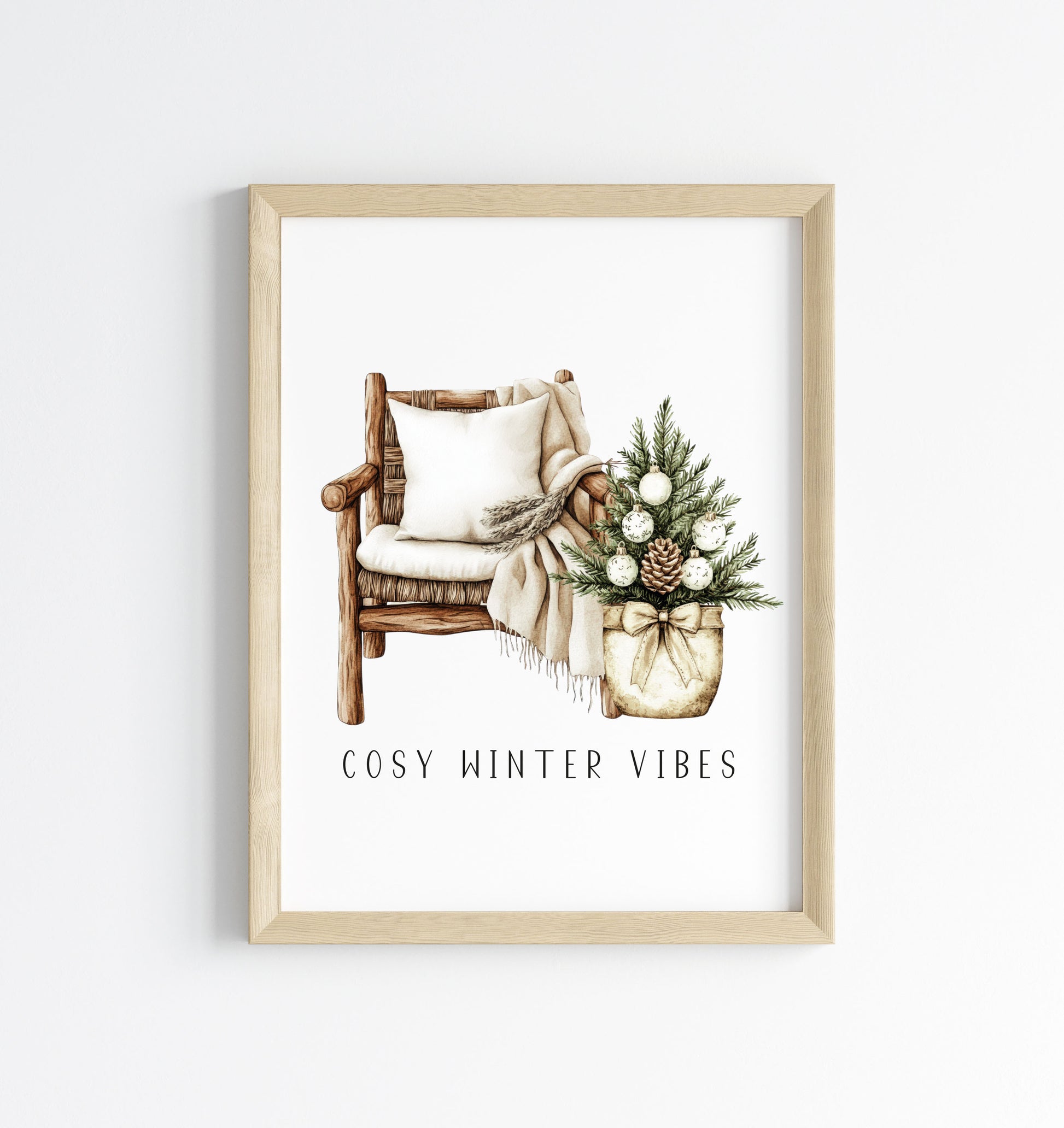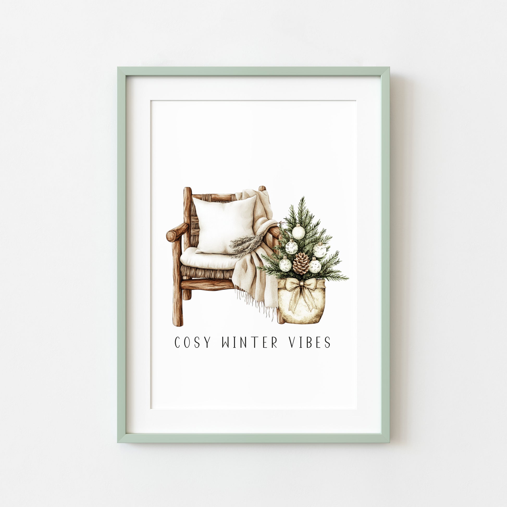 Christmas Print Watercolour Beige white Green Xmas Tree cosy chair Wall Art (unframed)