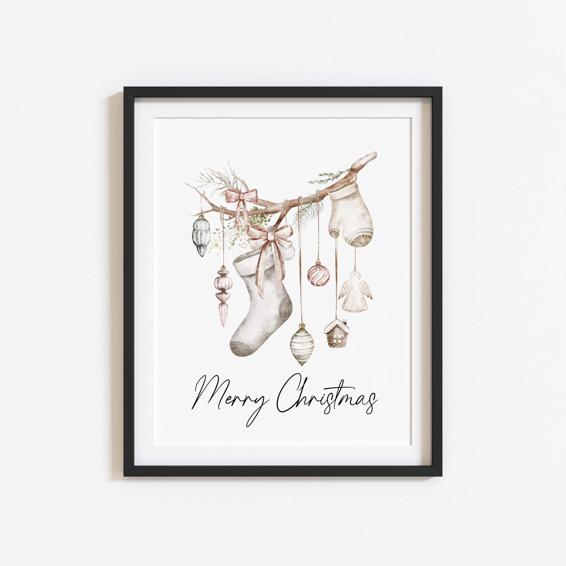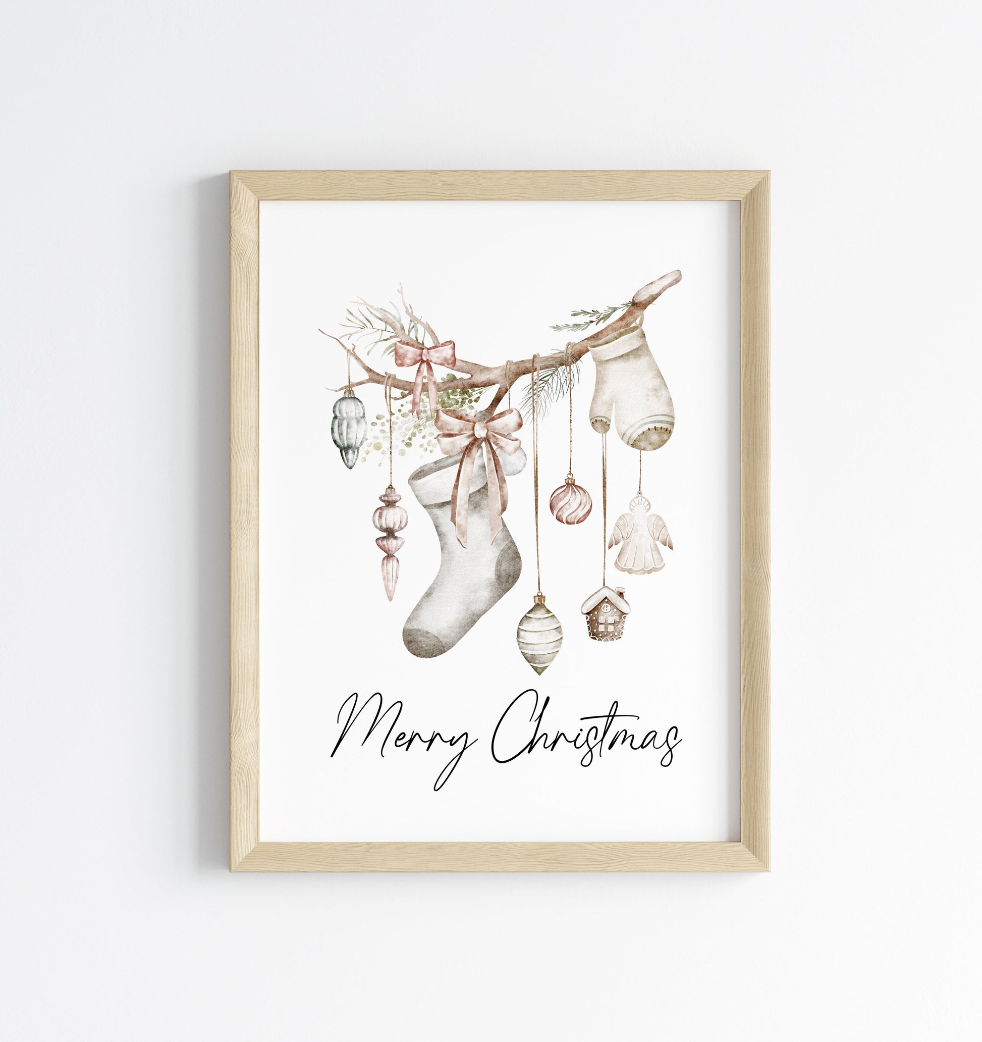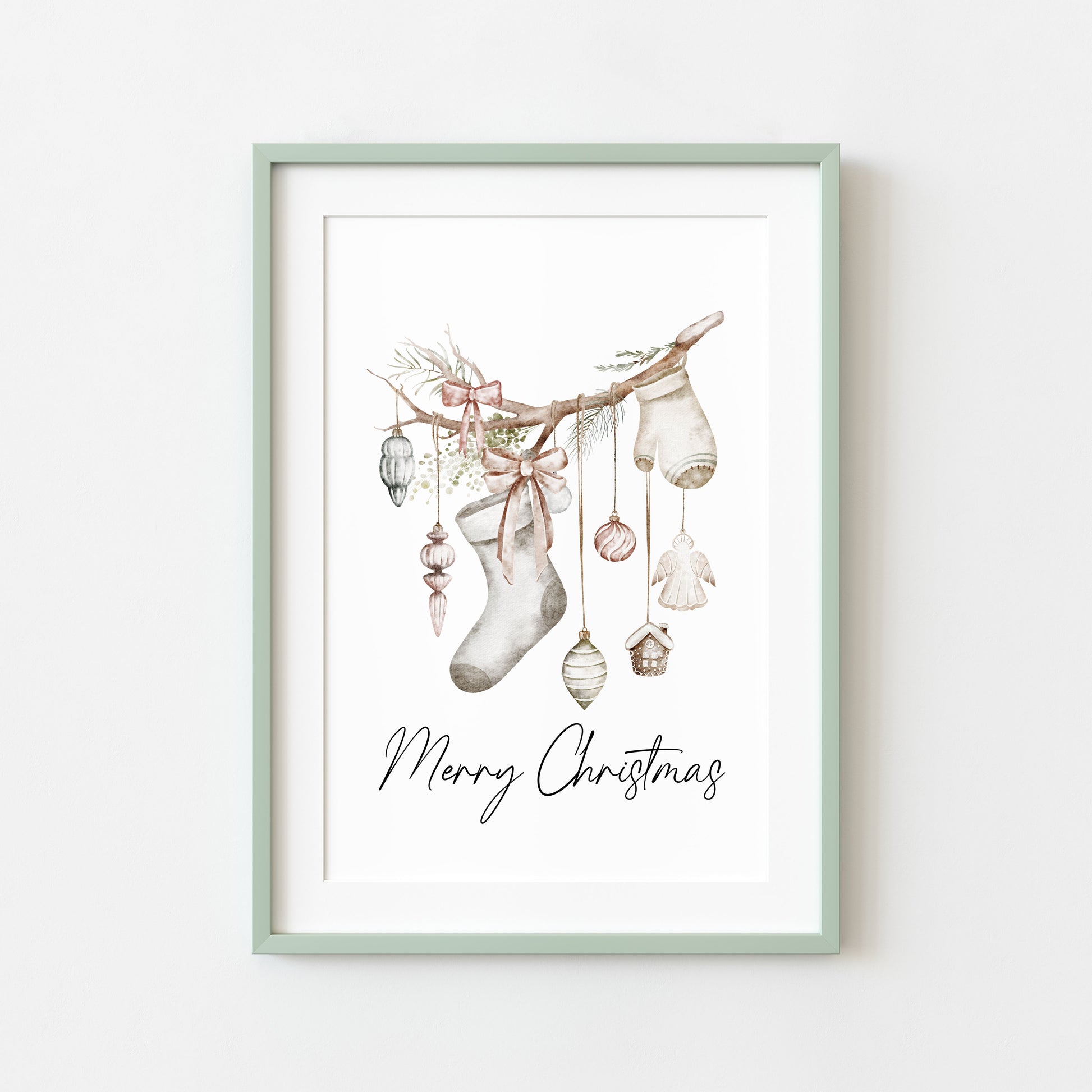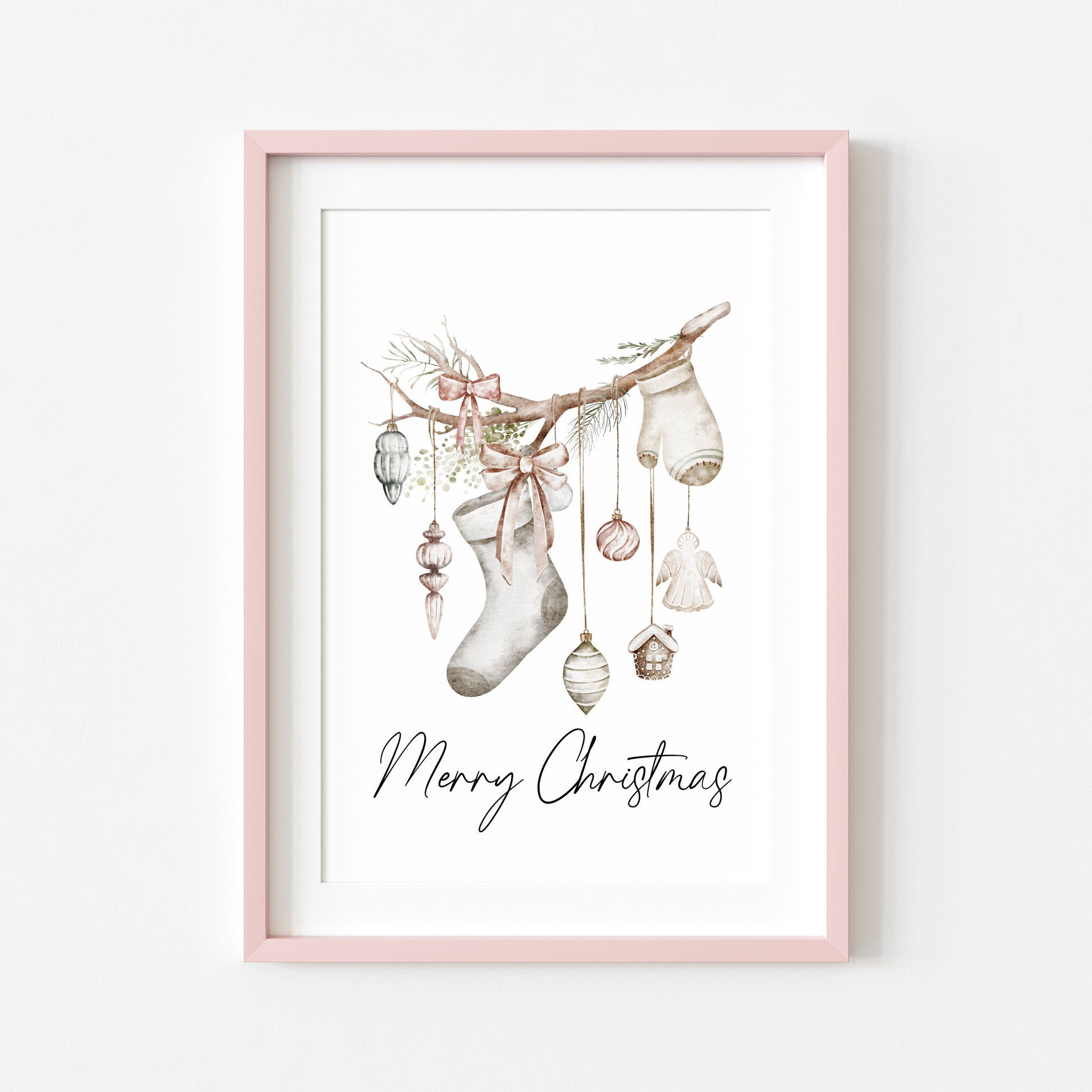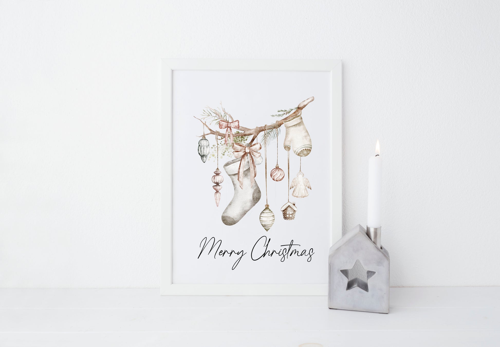 Christmas Print Watercolour Beige white red hanging decorations Wall Art (unframed)