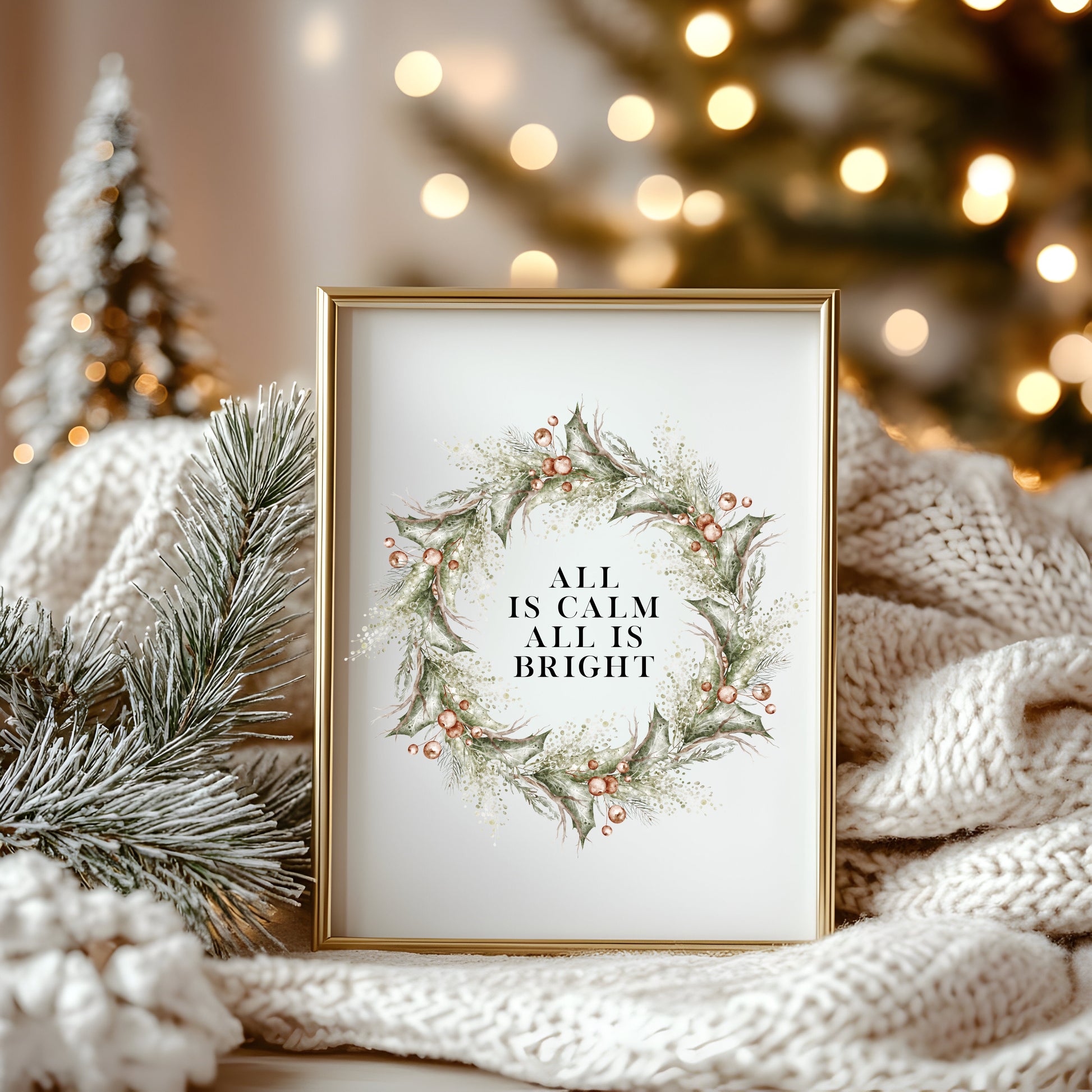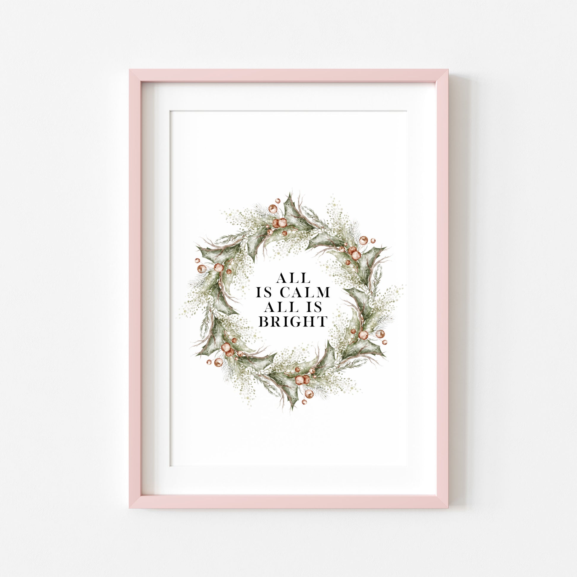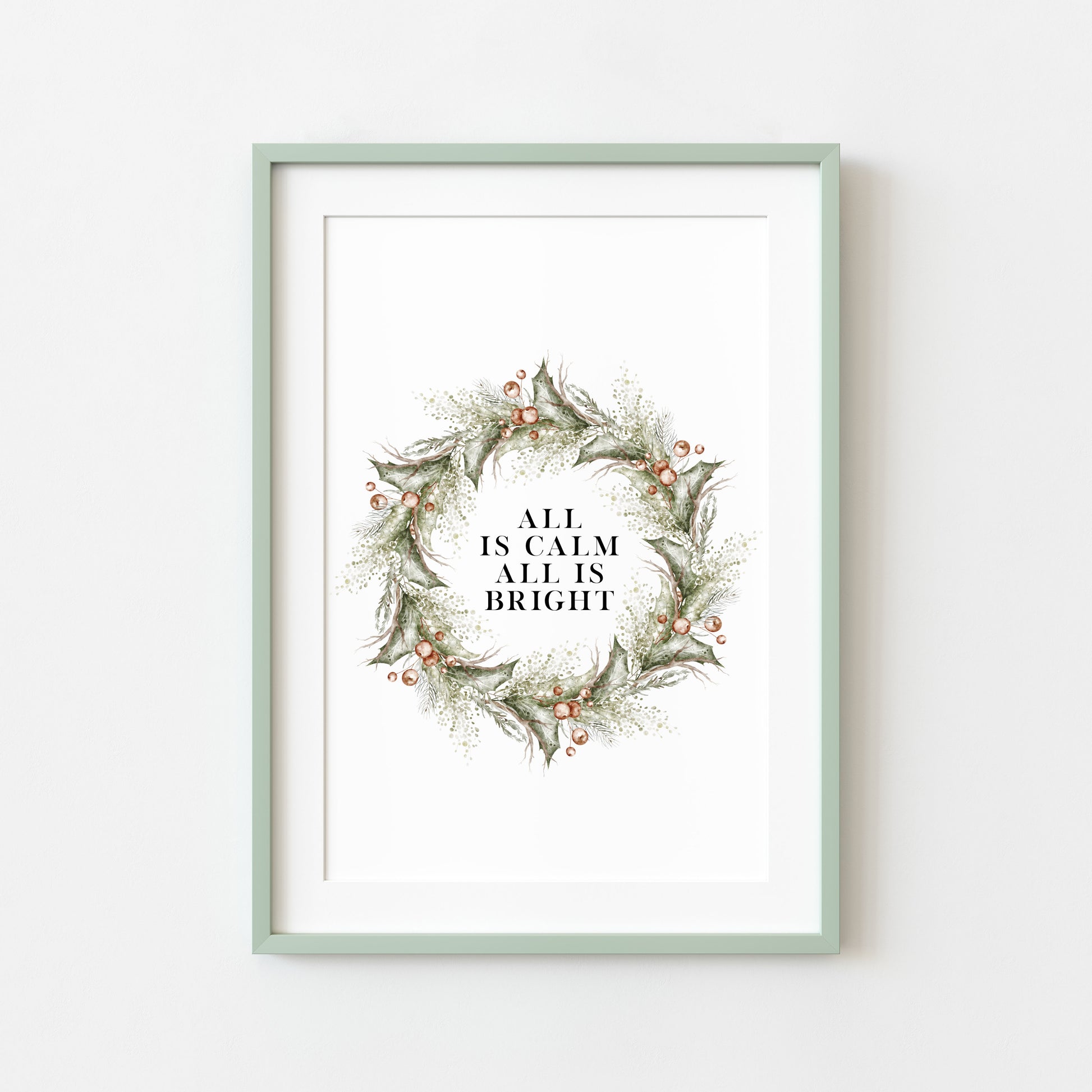 Christmas Print Watercolour Green red wreath all is calm winter Wall Art (unframed)