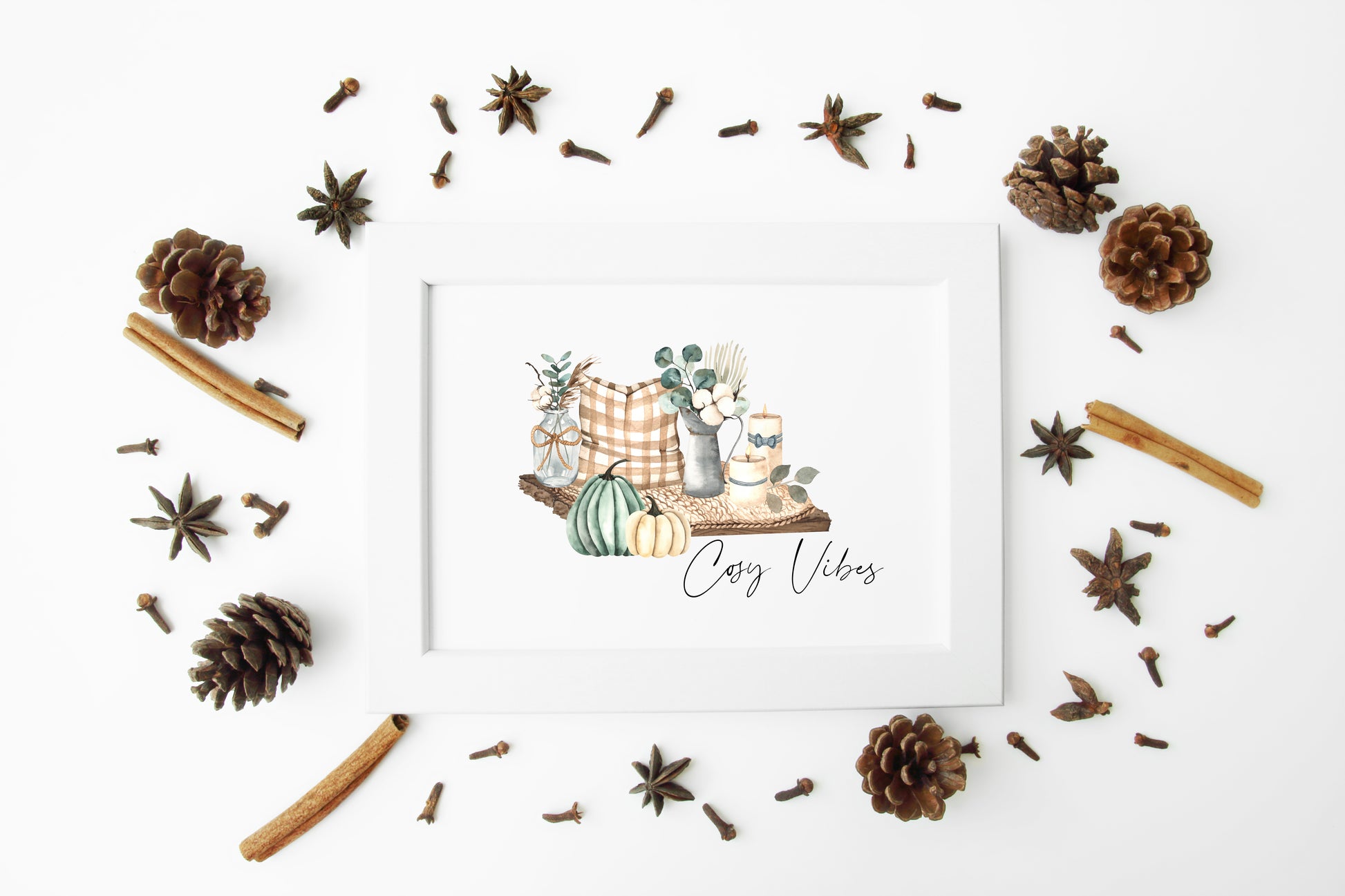 Cosy Vibes, home scene teal autumn watercolour seasonal landscape fall hallway unframed wall art poster print