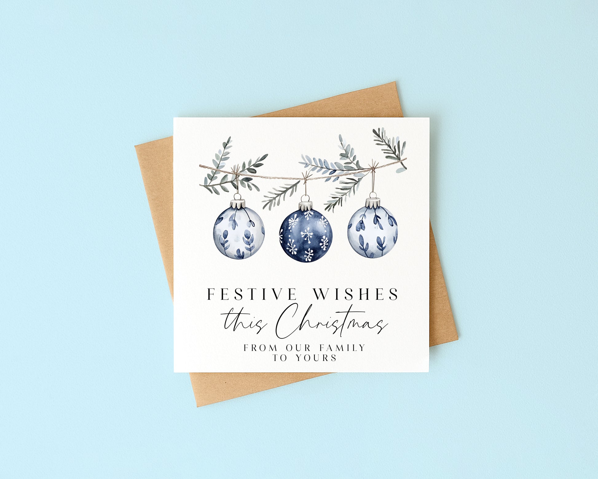 Festive wishes blue hanging decoration from our family to yours Christmas Card (with Envelope) Makes the perfect card to add a special seasonal touch to their Christmas!