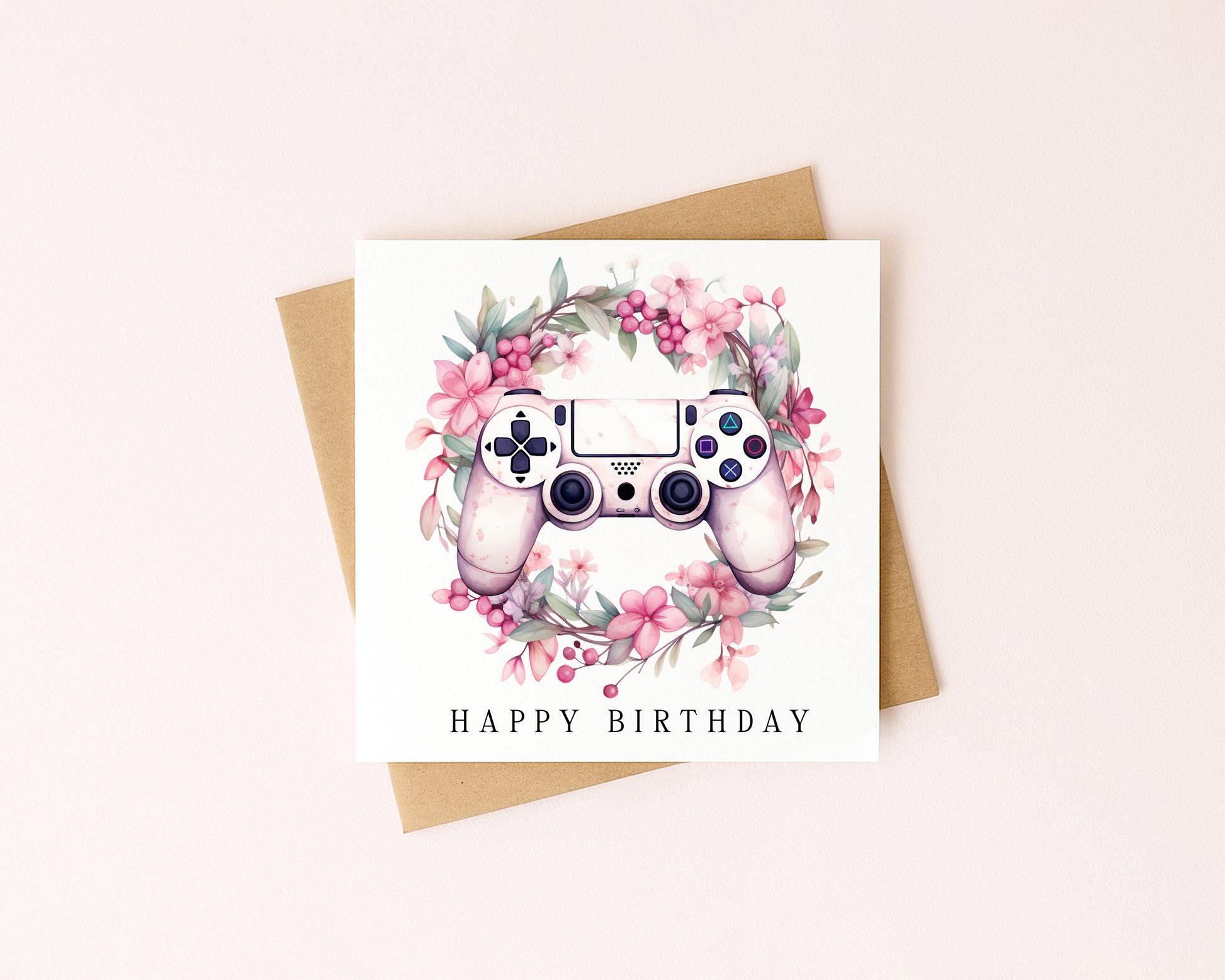 Gaming Birthday Card girls pink floral girl gamer bday Design with Envelope. Makes the perfect unique card to add a special touch to your gaming friends or families birthday!