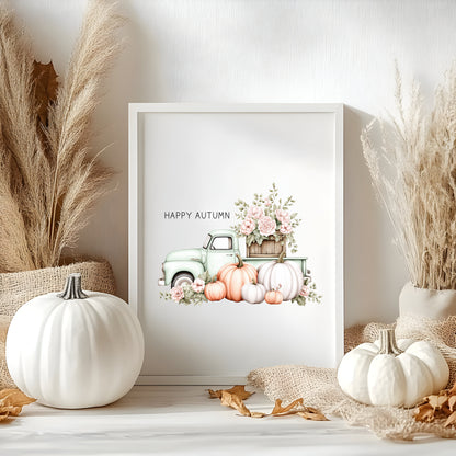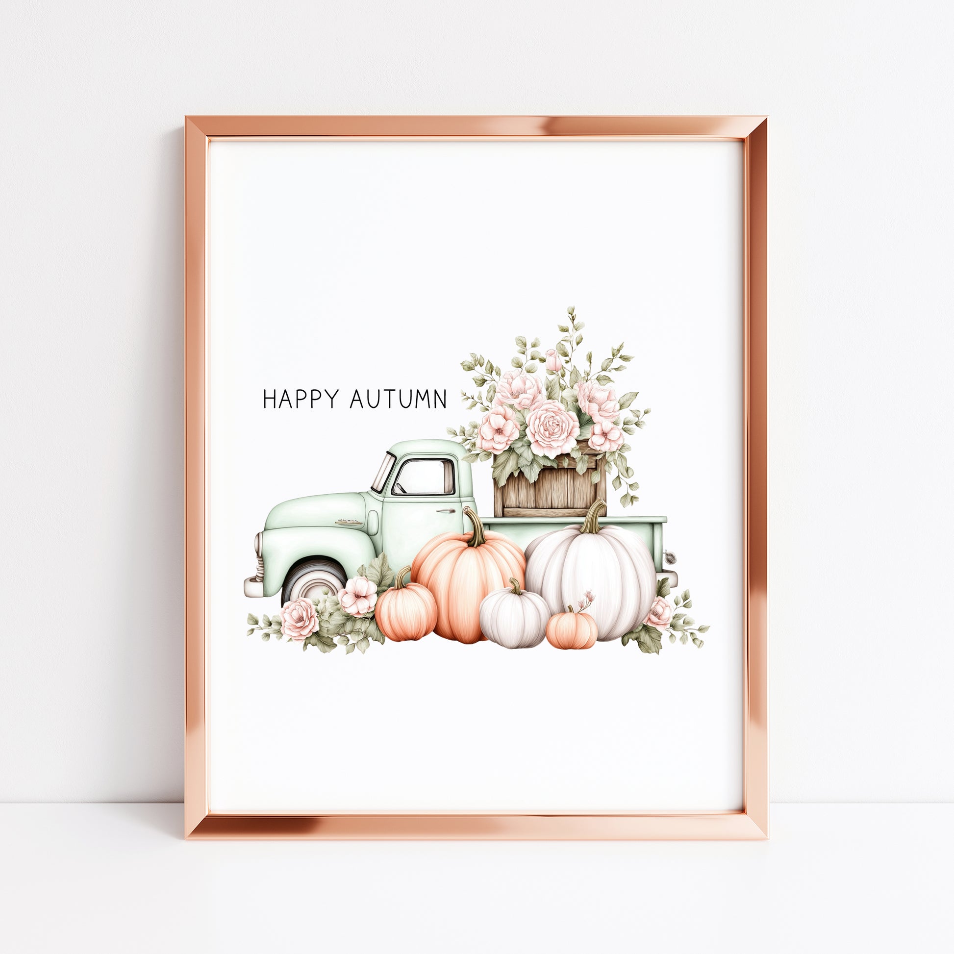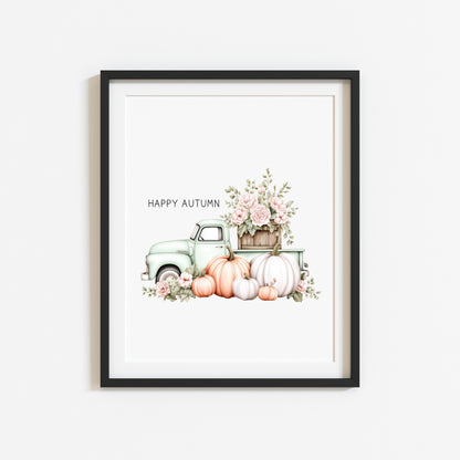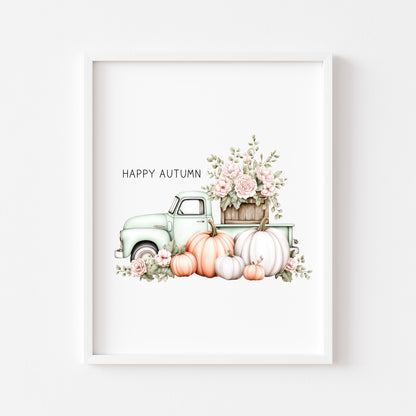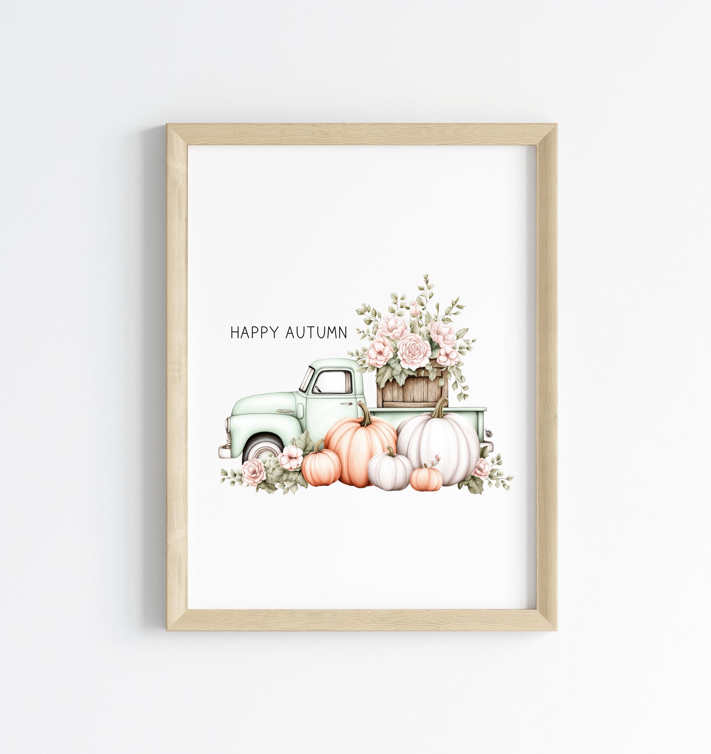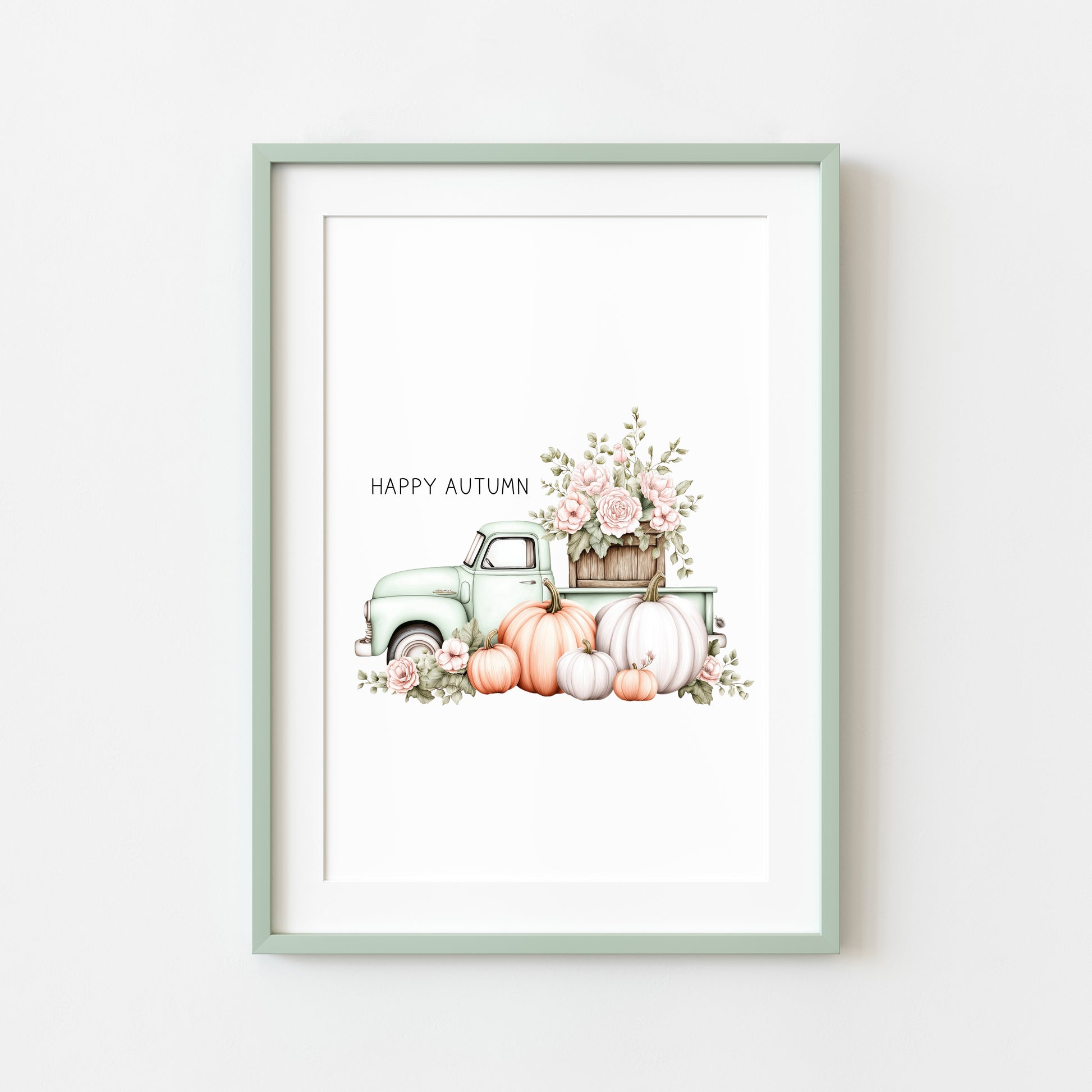 Happy Autumn fall mint truck seasonal floral pumpkins pumpkin truck unframed wall art poster print, autumn home decor autumn decor, fall art