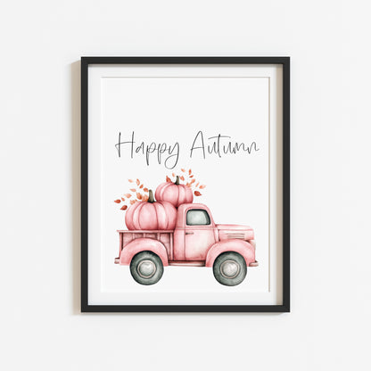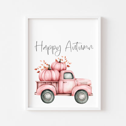 Happy Autumn pink pumpkin truck seasonal fall watercolour unframed wall art poster print