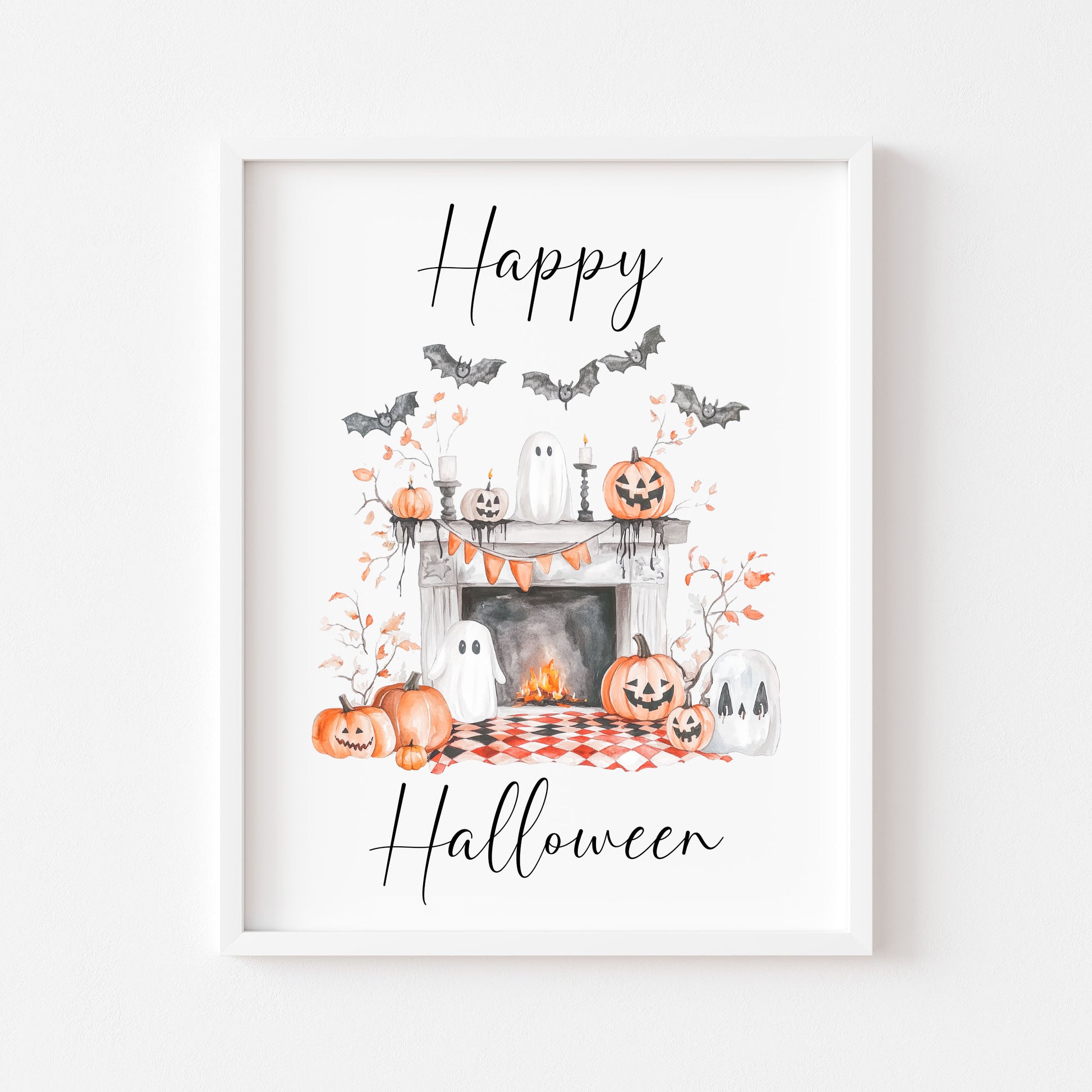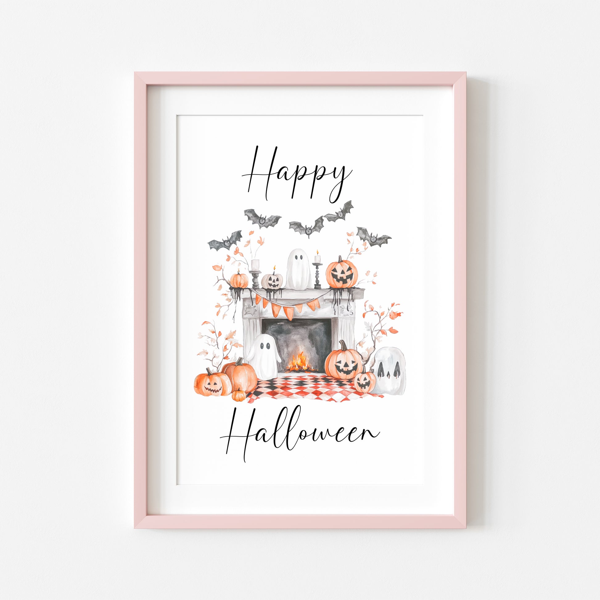 Happy Halloween home fireplace pumpkins orange white watercolour spooky unframed wall art poster print