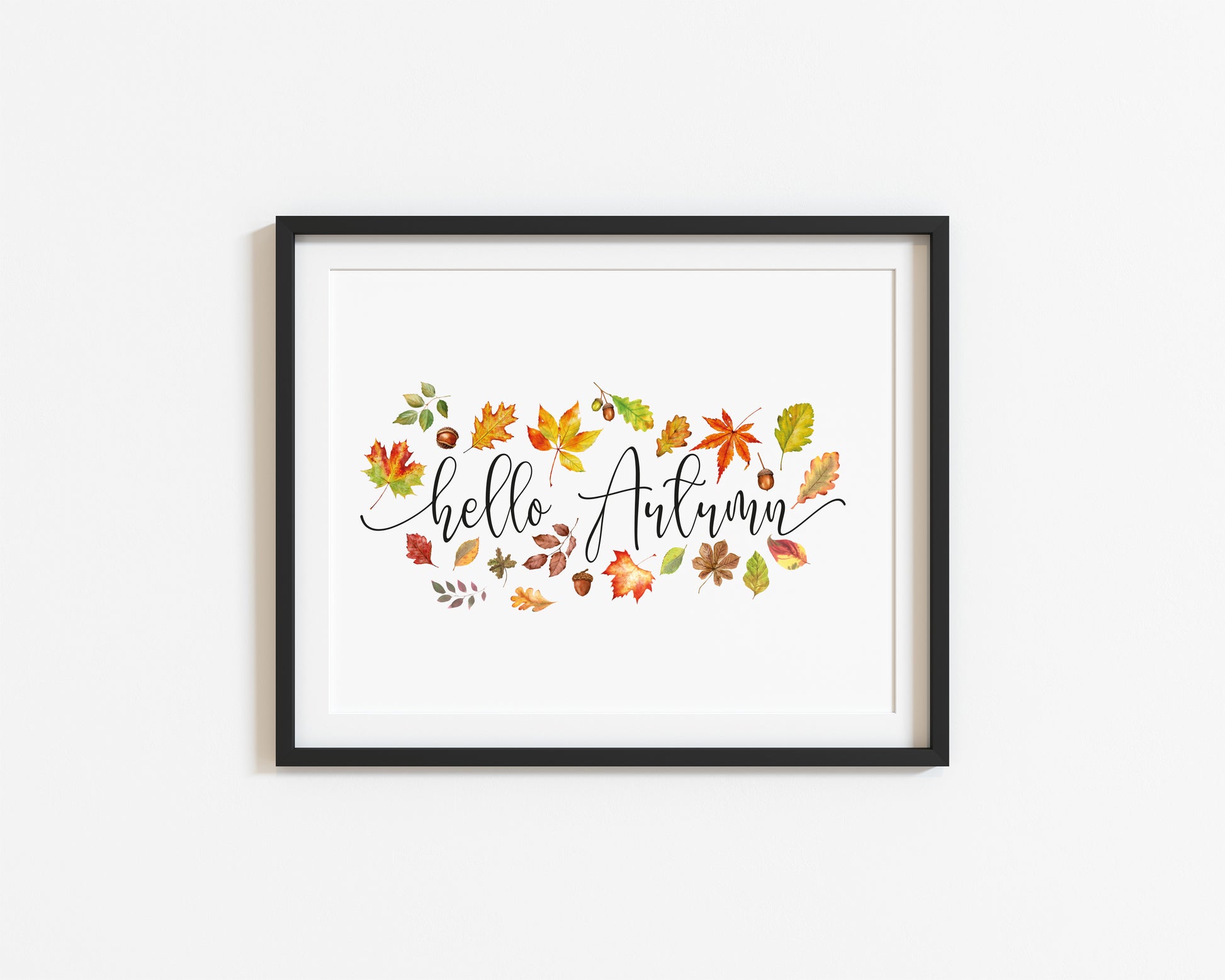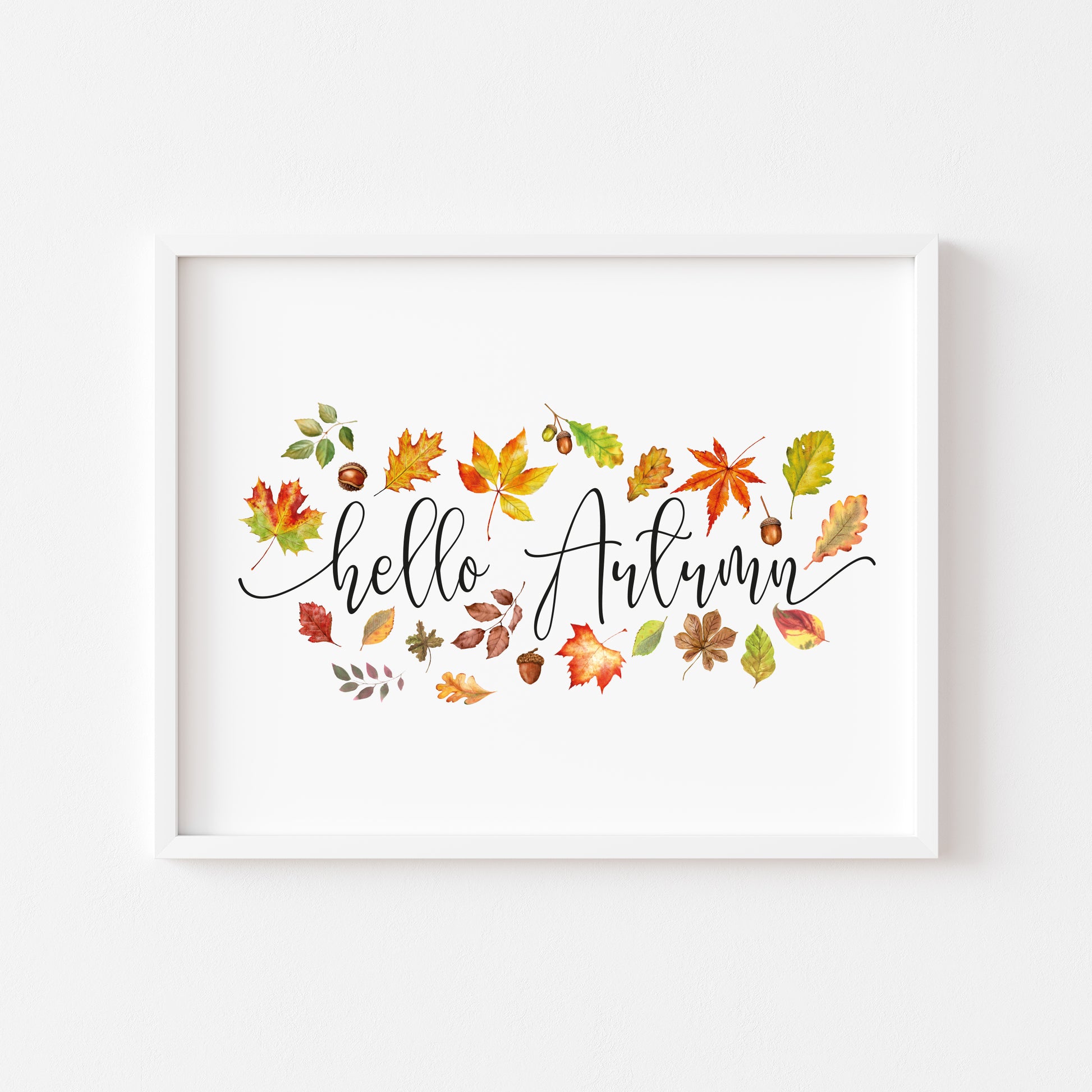 Hello Autumn, leaves, acorns, foliage autumn watercolour seasonal unframed wall art poster print