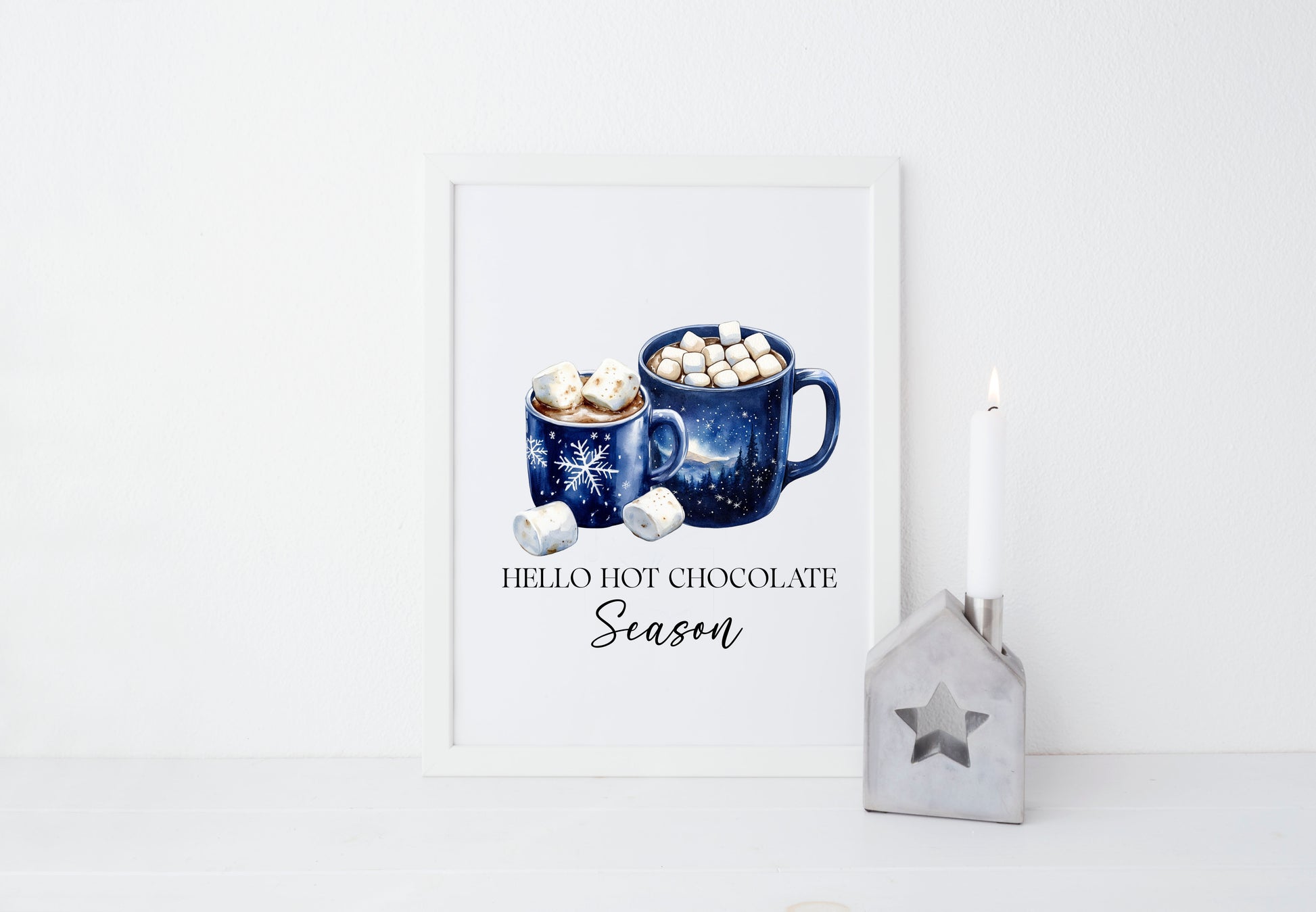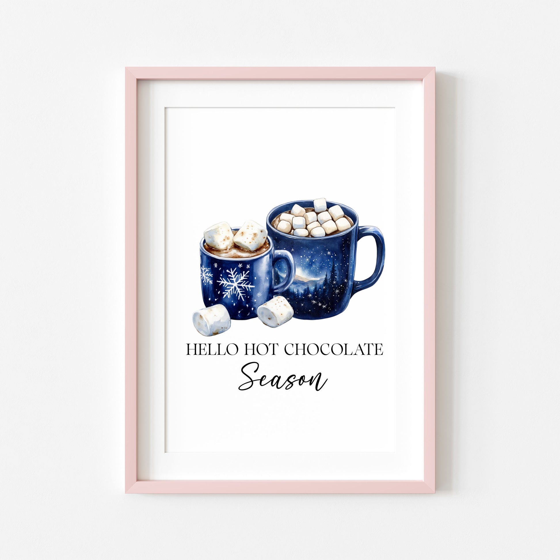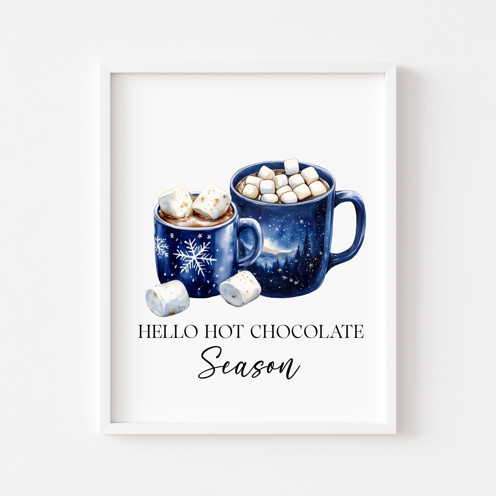 Hot Chocolate Christmas Blue Mugs Watercolour Kitchen unframed wall art poster print