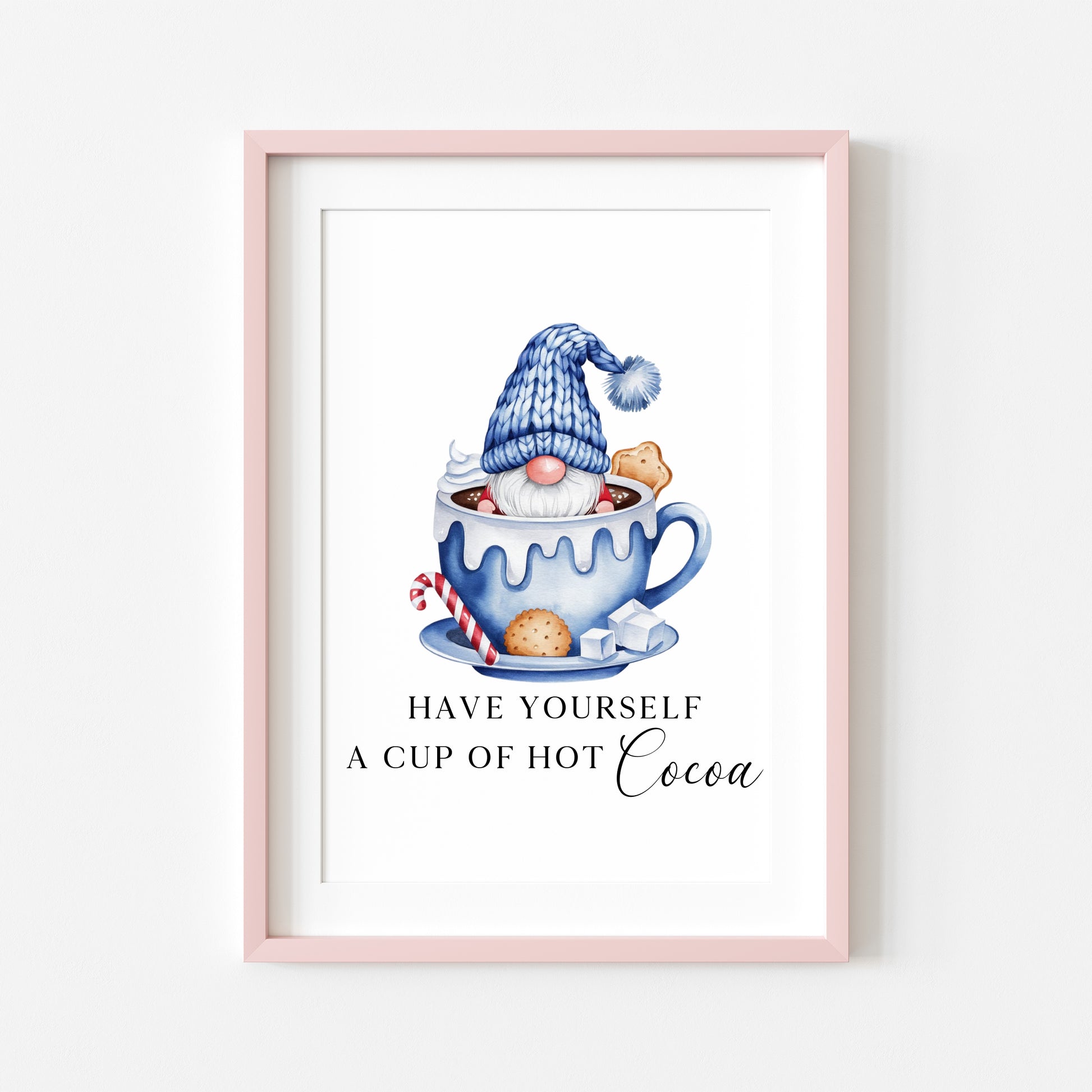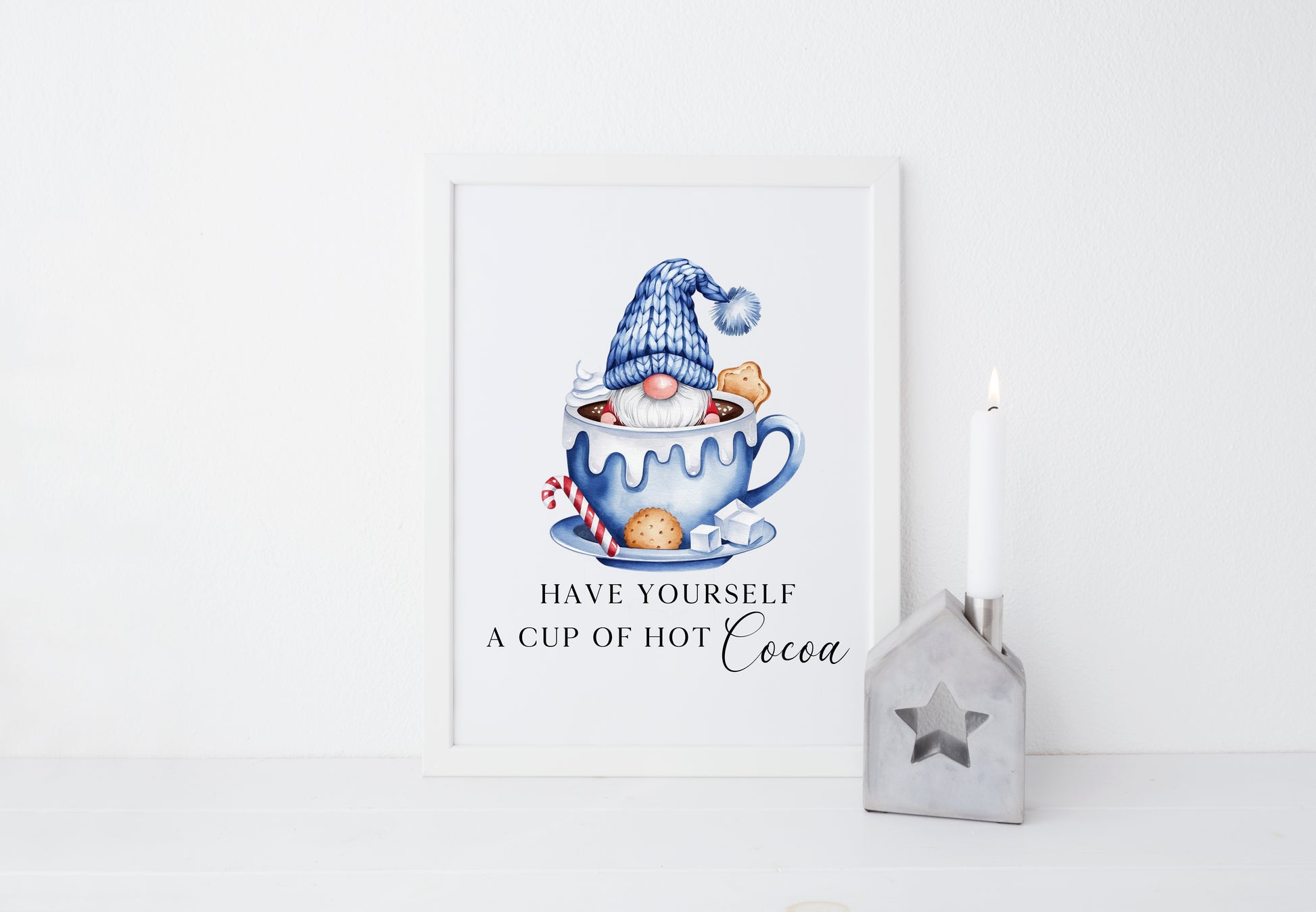 Hot chocolate print, Christmas Gonk gnome blue cup of cocoa festive unframed wall art