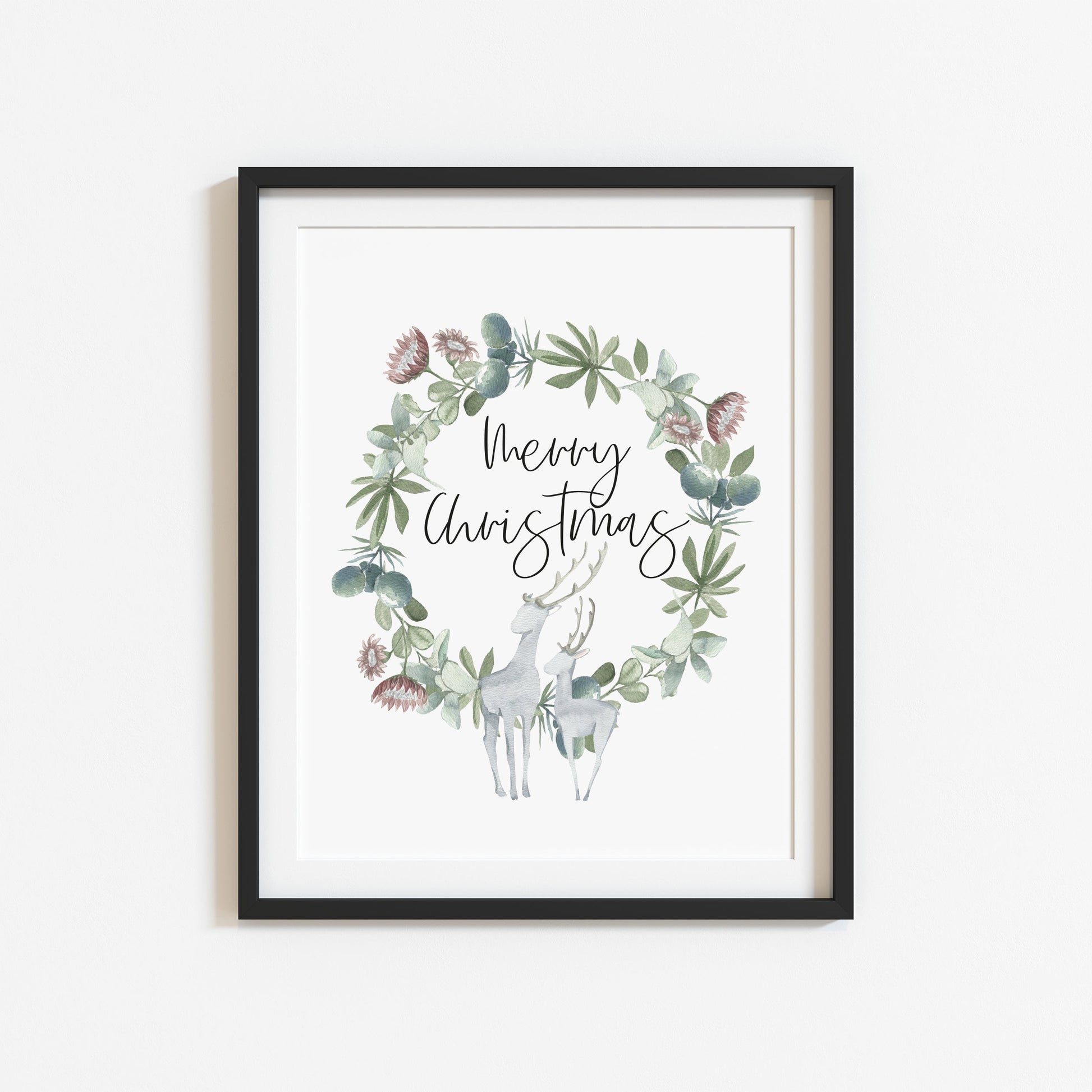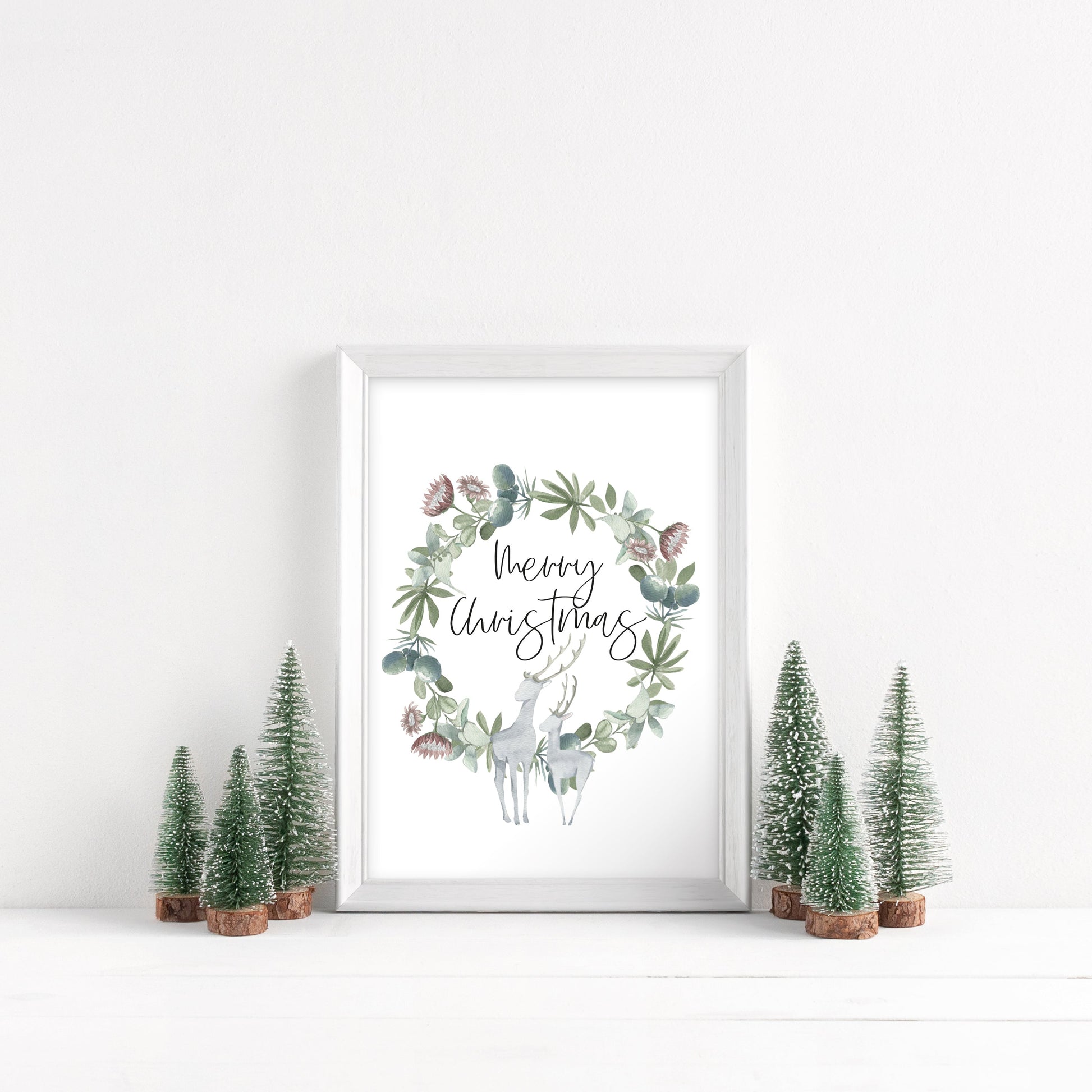 Merry Christmas grey and green reindeer watercolour seasonal unframed wall art poster print
