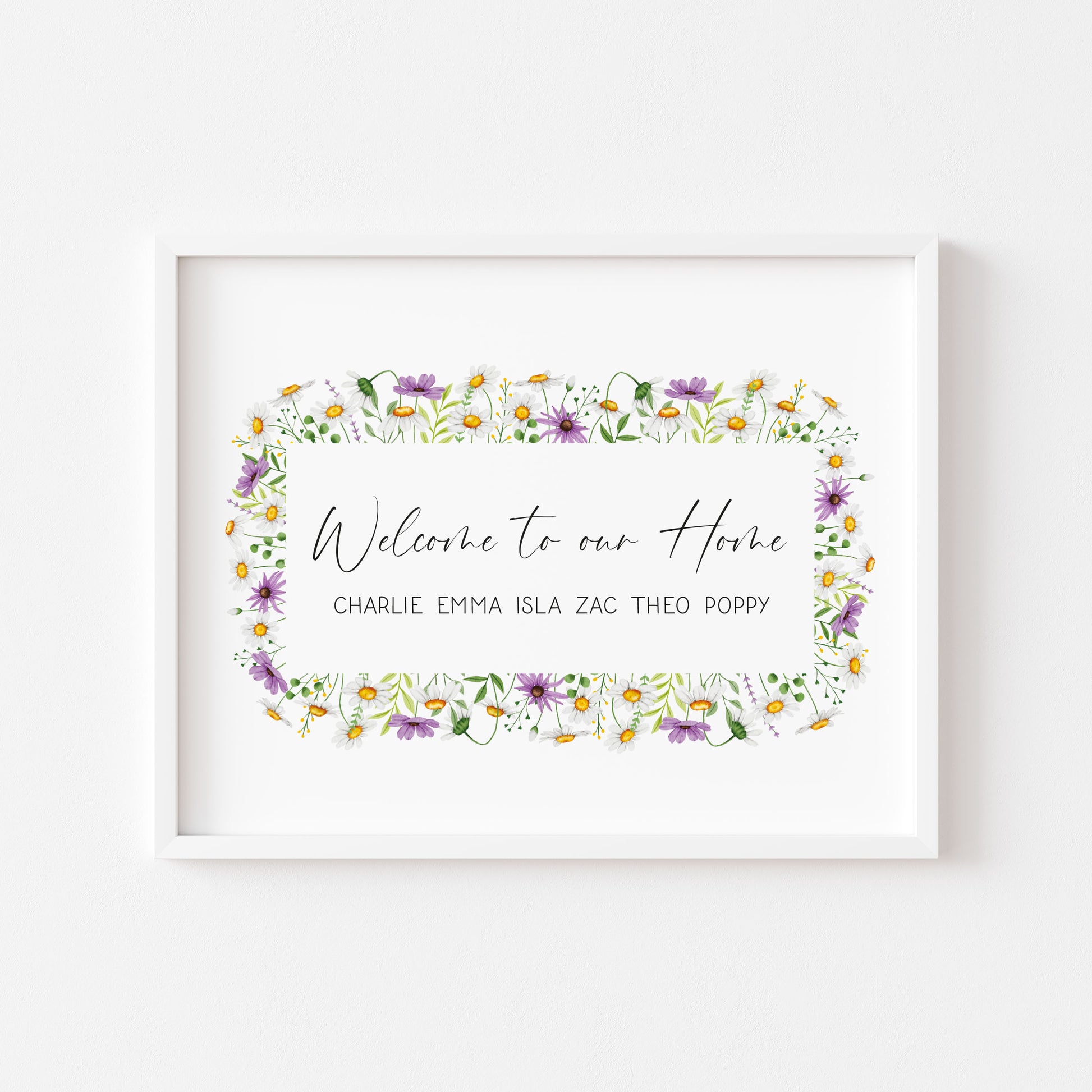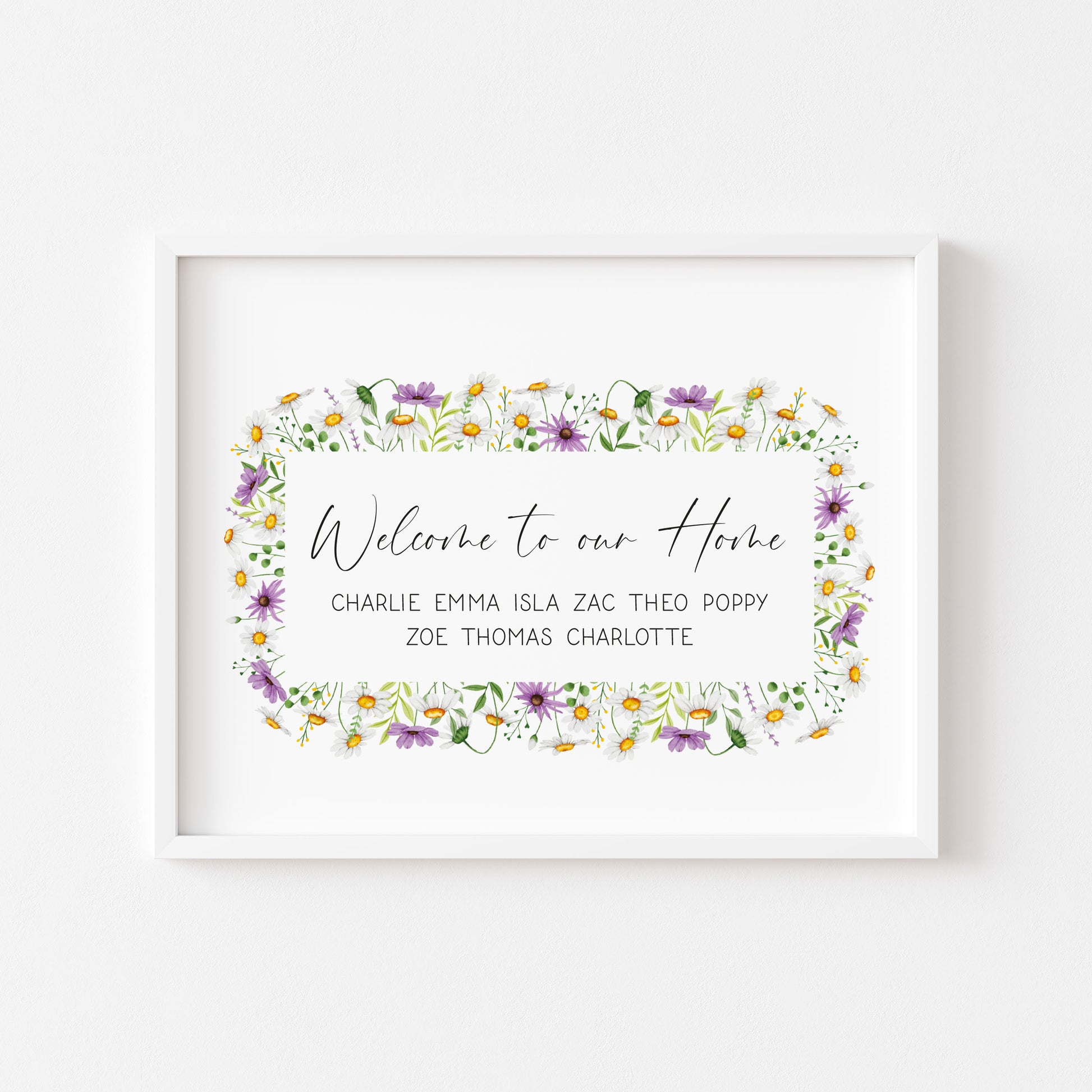 Personalised Family welcome to our home purple daises personalised with names wreath unframed Wall Art