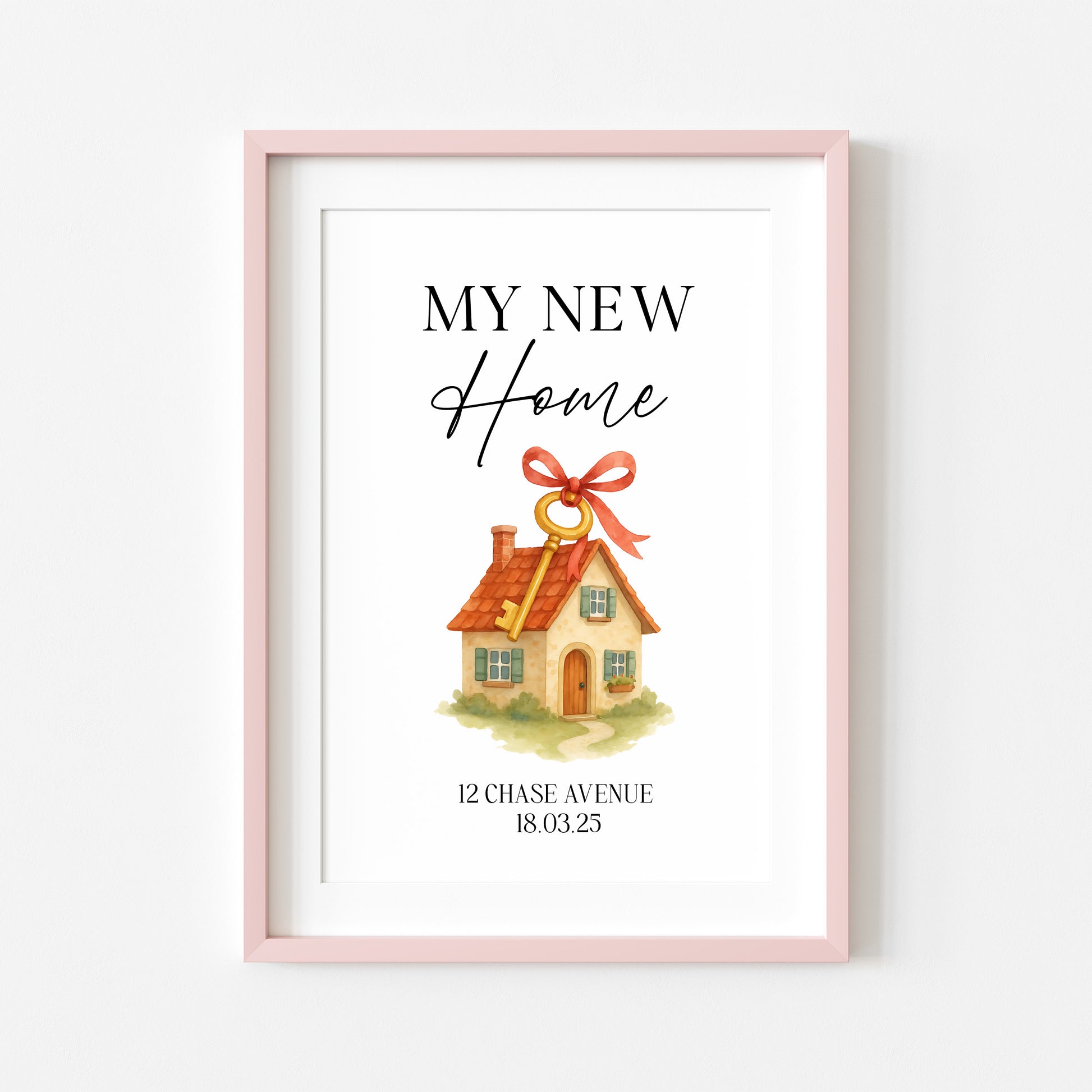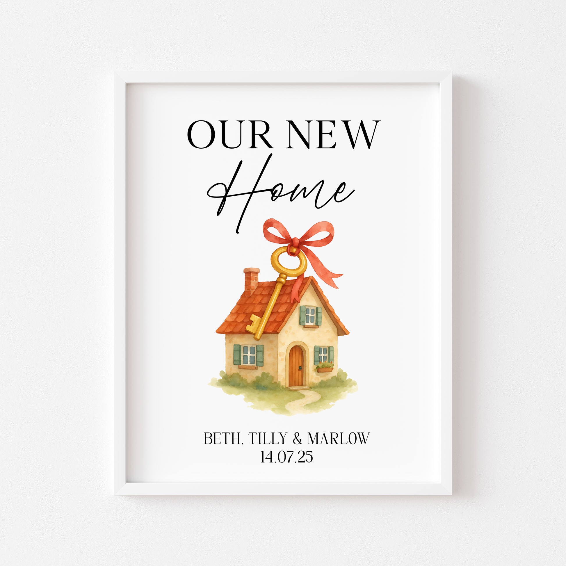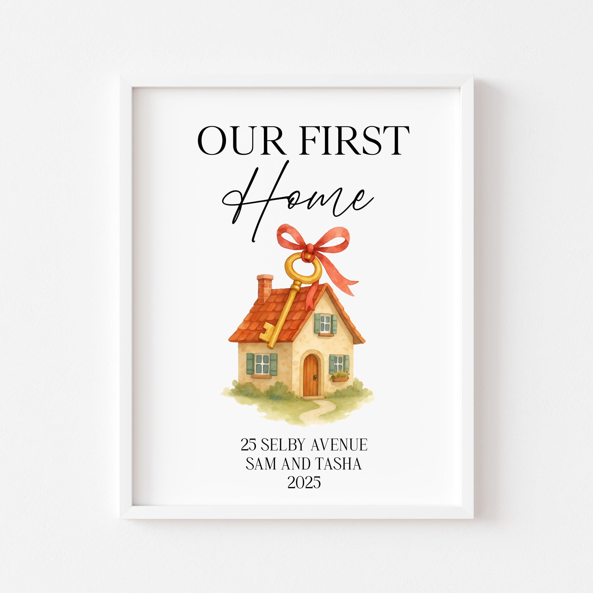 Personalised First / New Home Print red ribbon key New House Gift, Wall Art (unframed)