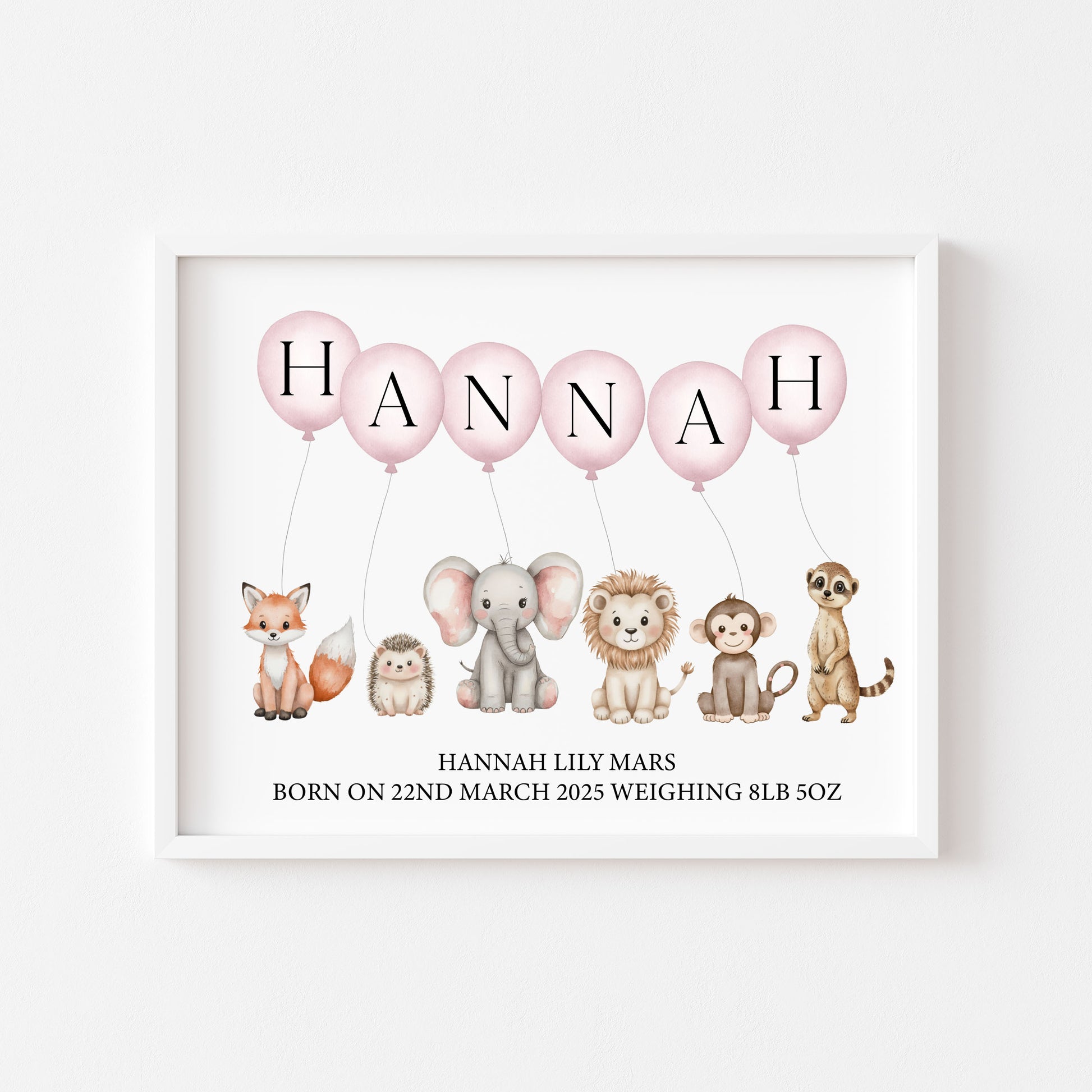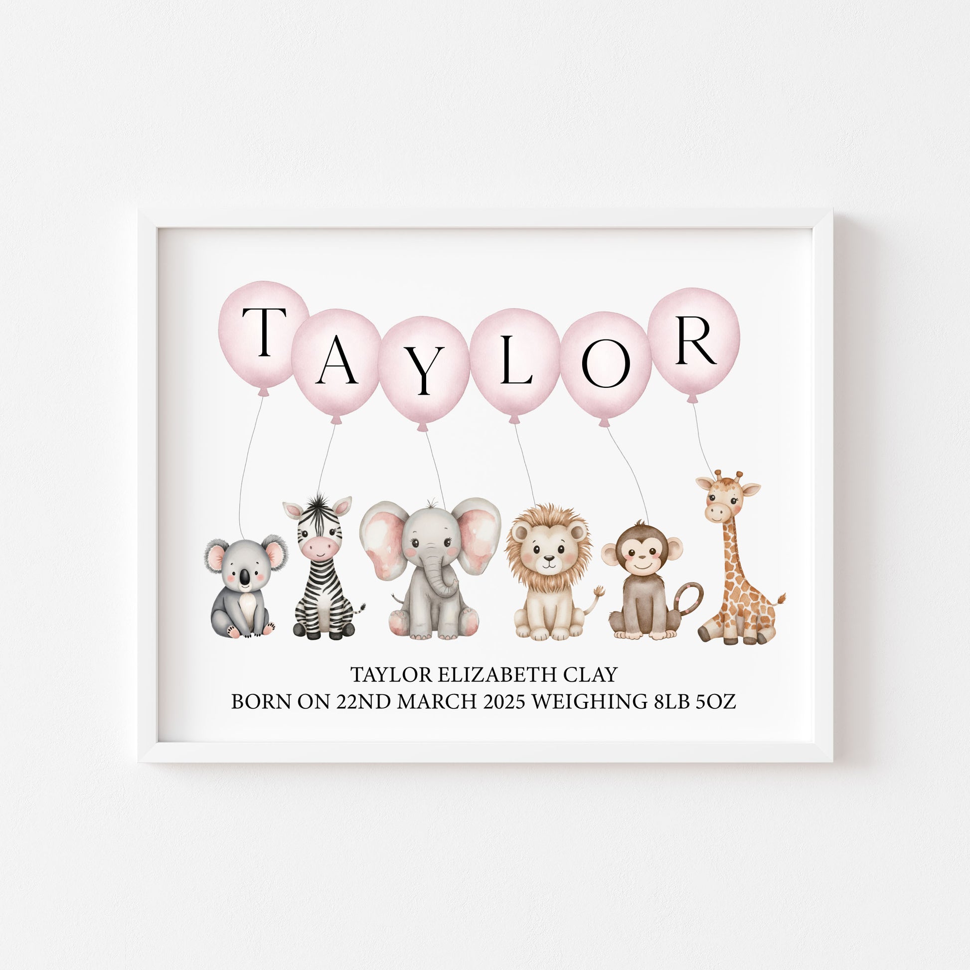 Personalised Safari Animals Nursery Print Pink Balloons, Birth Details unframed wall art poster print. Nursery wall art poster print including name, date of birth, weight and 14 different animals to choose from!