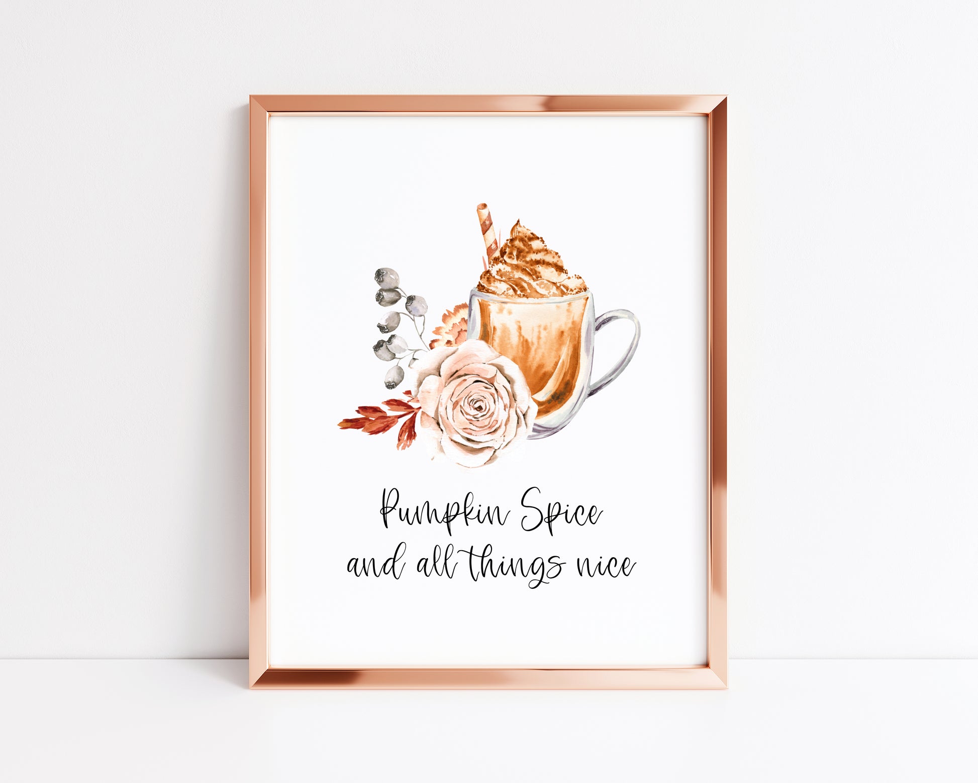 Pumpkin spice and all things nice latte coffee floral autumn watercolour seasonal unframed wall art poster print