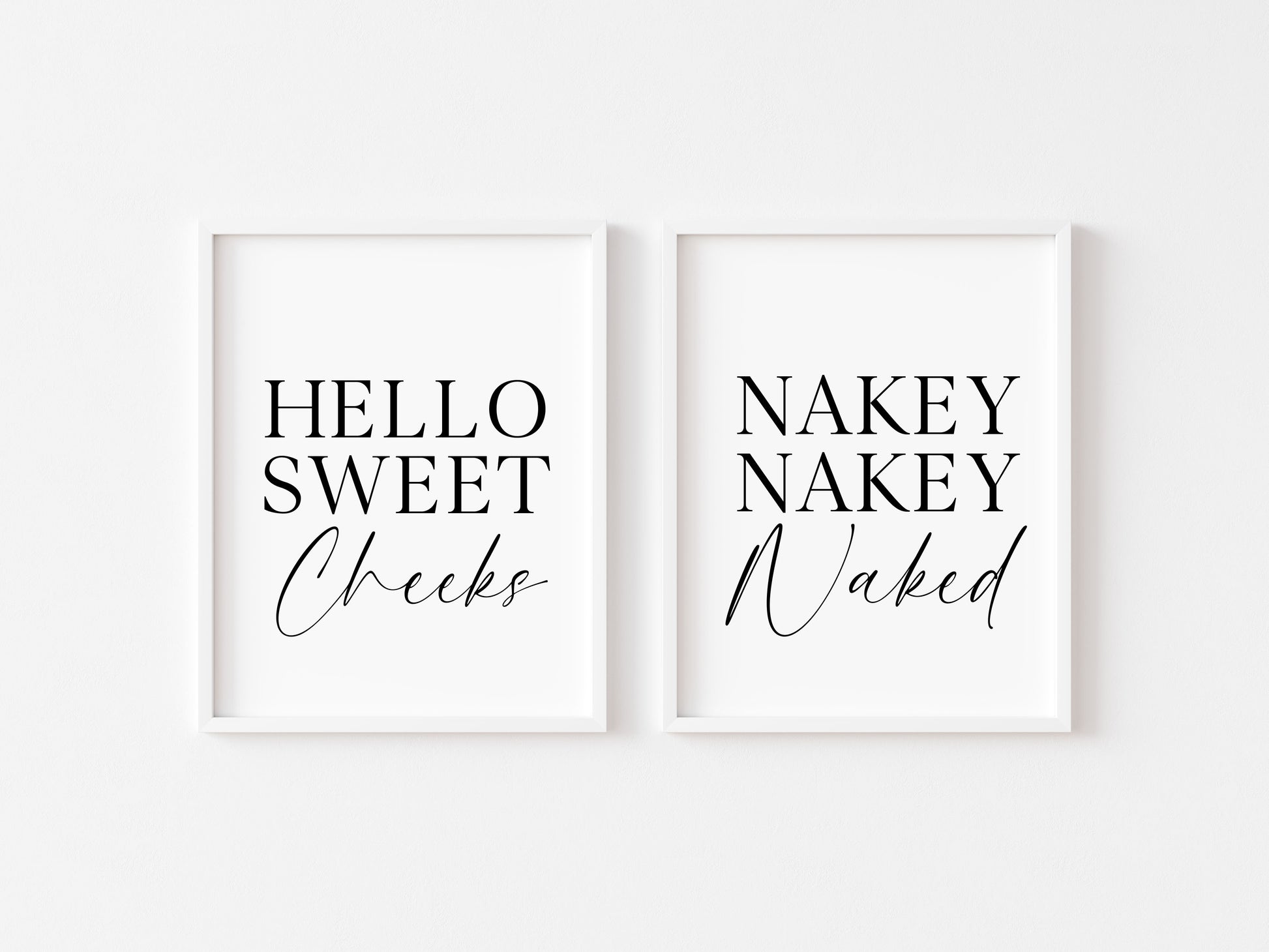Set of 2 bathroom prints, Hello sweet cheeks, nakey nakey nakey set of bathroom unframed wall art poster prints, set of bathroom wall art