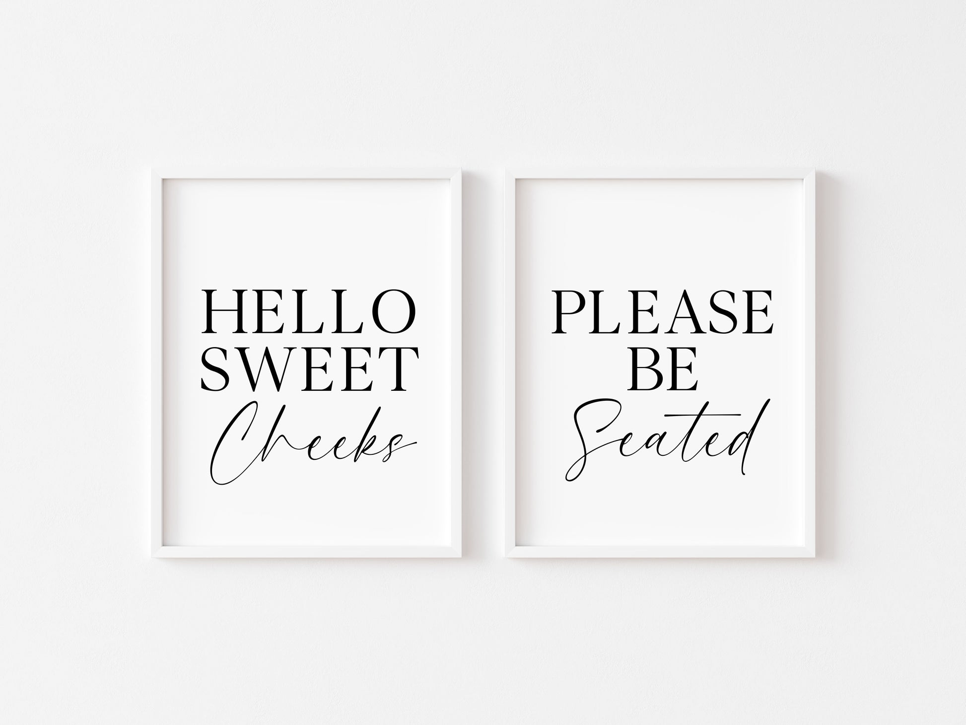 Set of 2 bathroom prints, Hello sweet cheeks, Please be seated set of bathroom unframed wall art poster prints, set of bathroom wall art