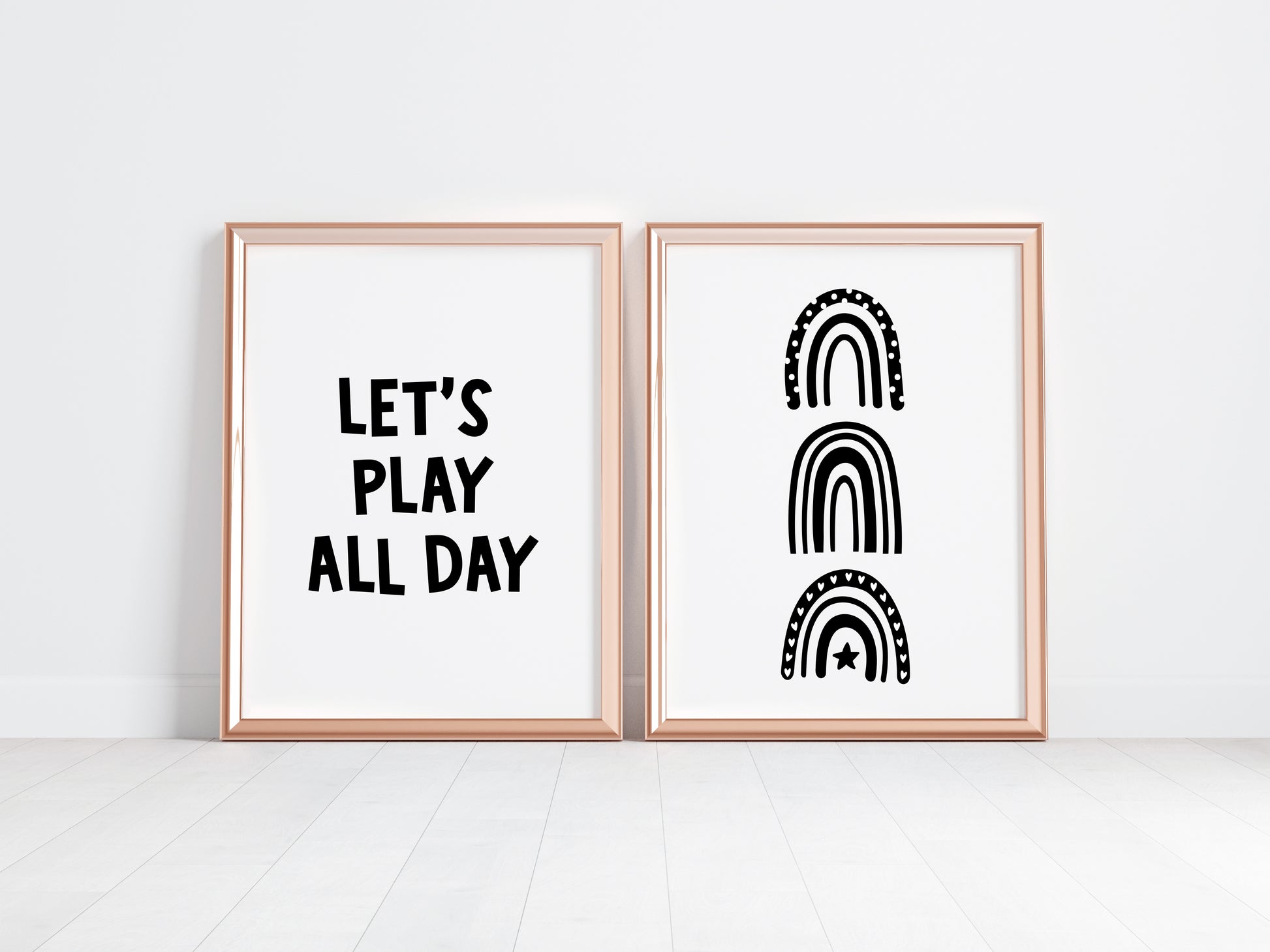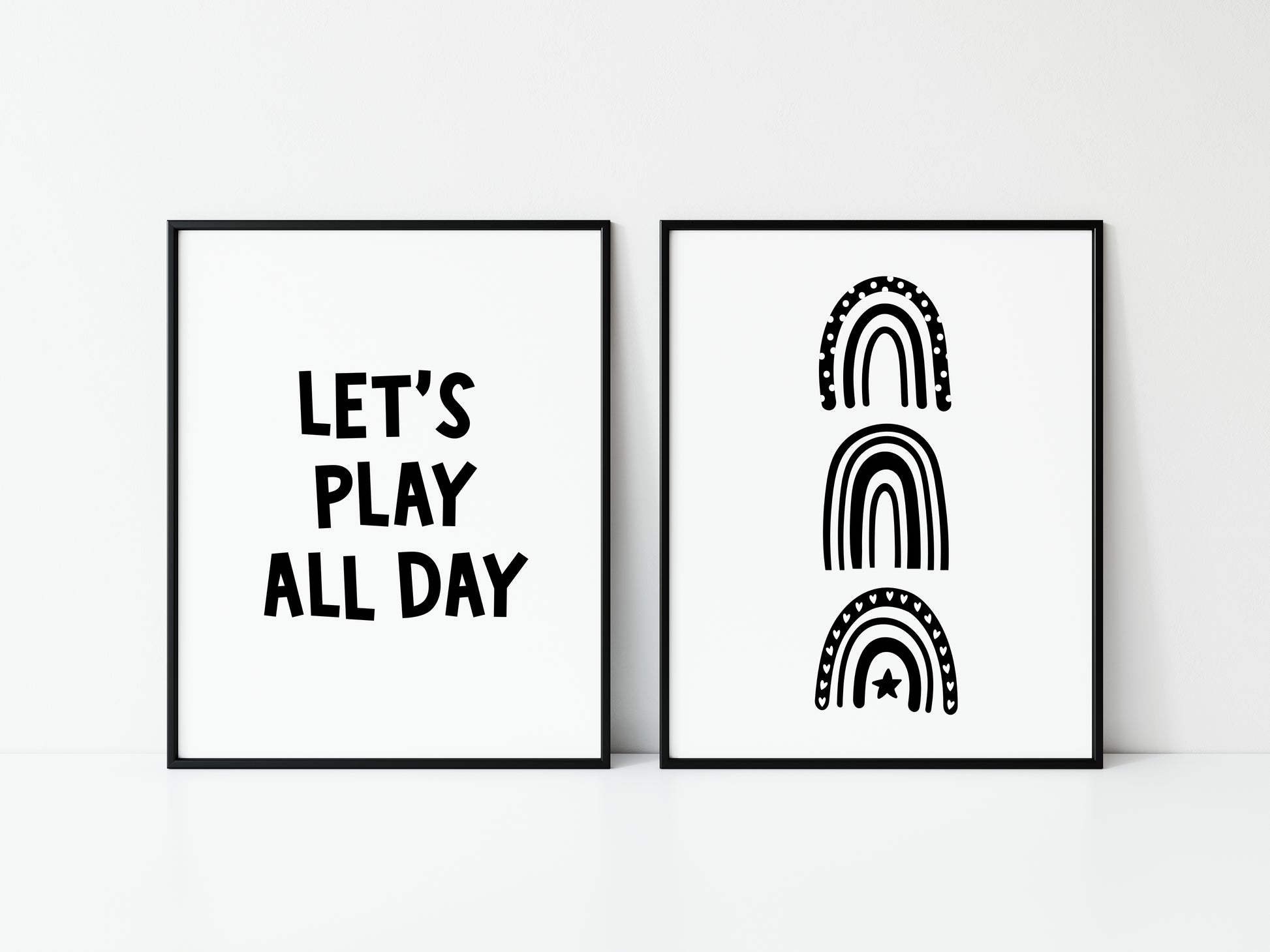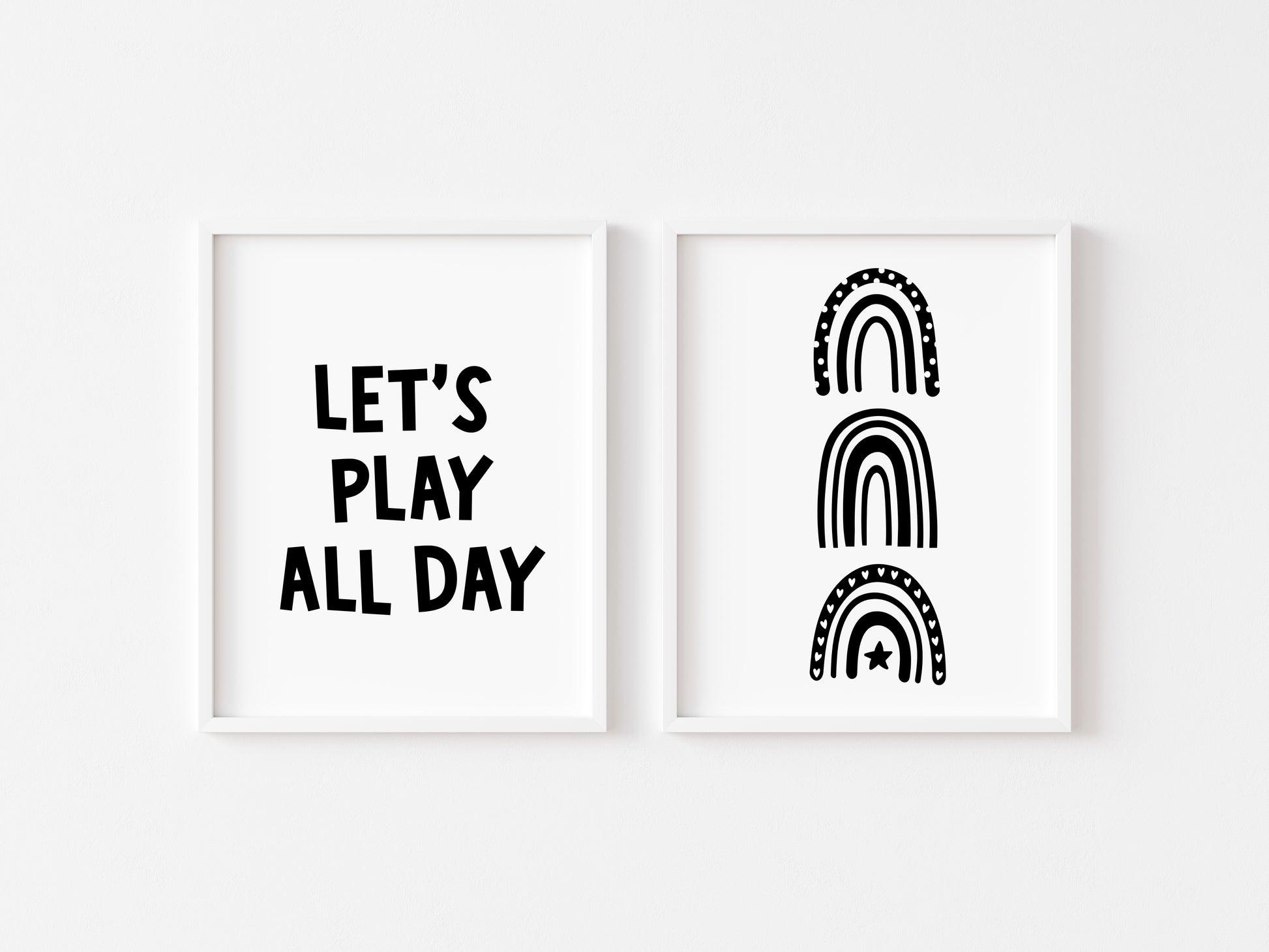 Set of 2 nursery bedroom prints, let's play all day black and white monochrome rainbows unframed wall art poster prints