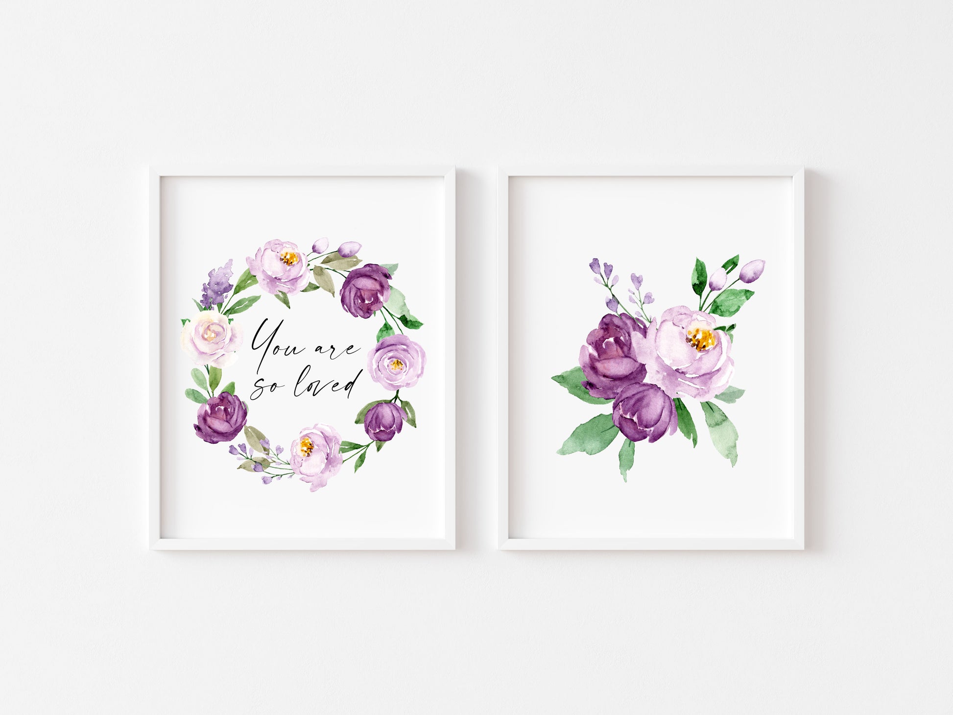 Set of 2 prints, you are so loved purple green floral watercolour girls bedroom unframed wall art poster prints