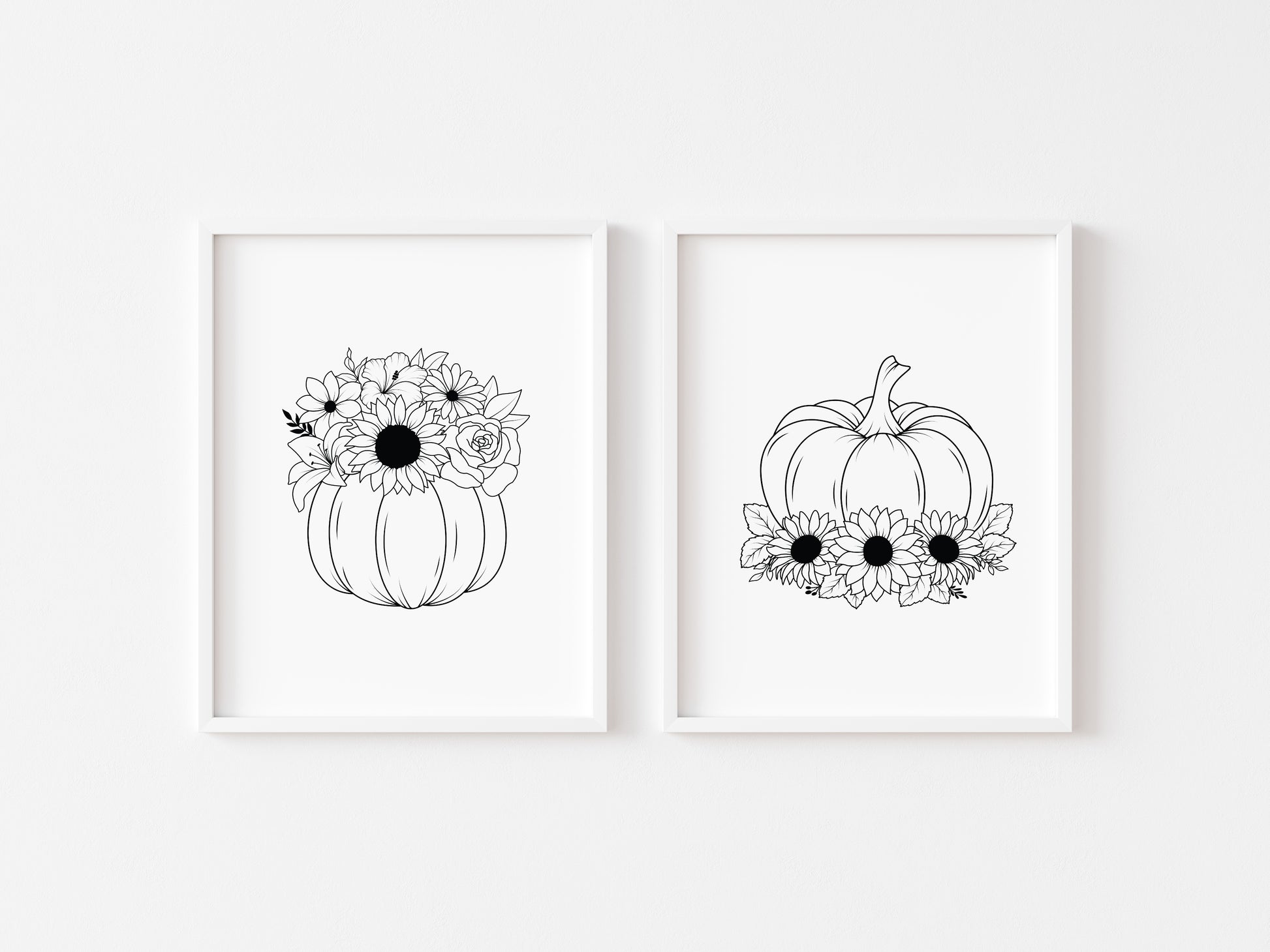 Set of 2 pumpkin sunflower illustrations unframed prints, line art, line art drawing, halloween autumn seasonal decor, wall art print sets