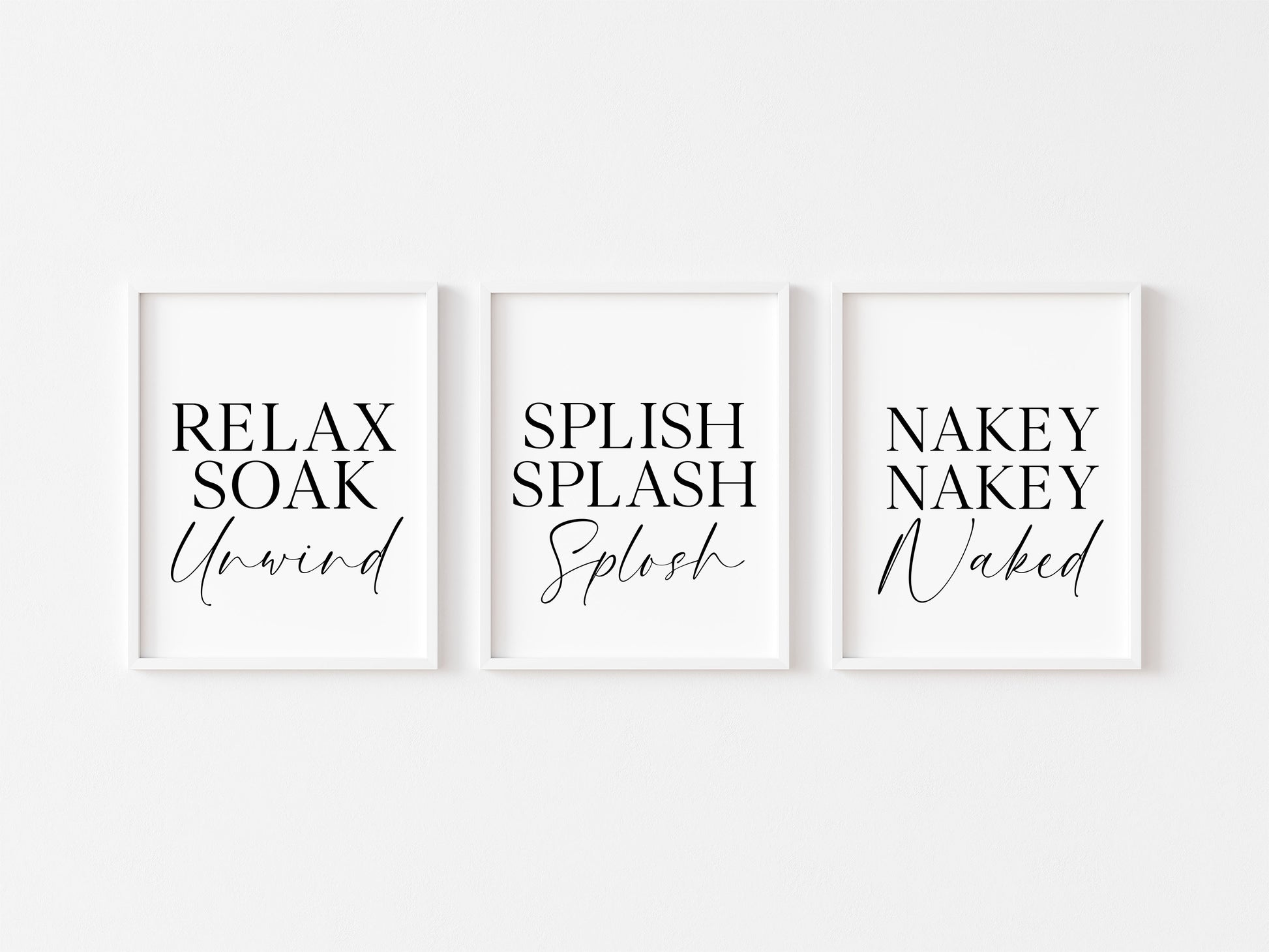 Set of 3 bathroom prints, Relax soak unwind splish splash splosh nakey nakey naked set of bathroom signs unframed wall art bathroom prints