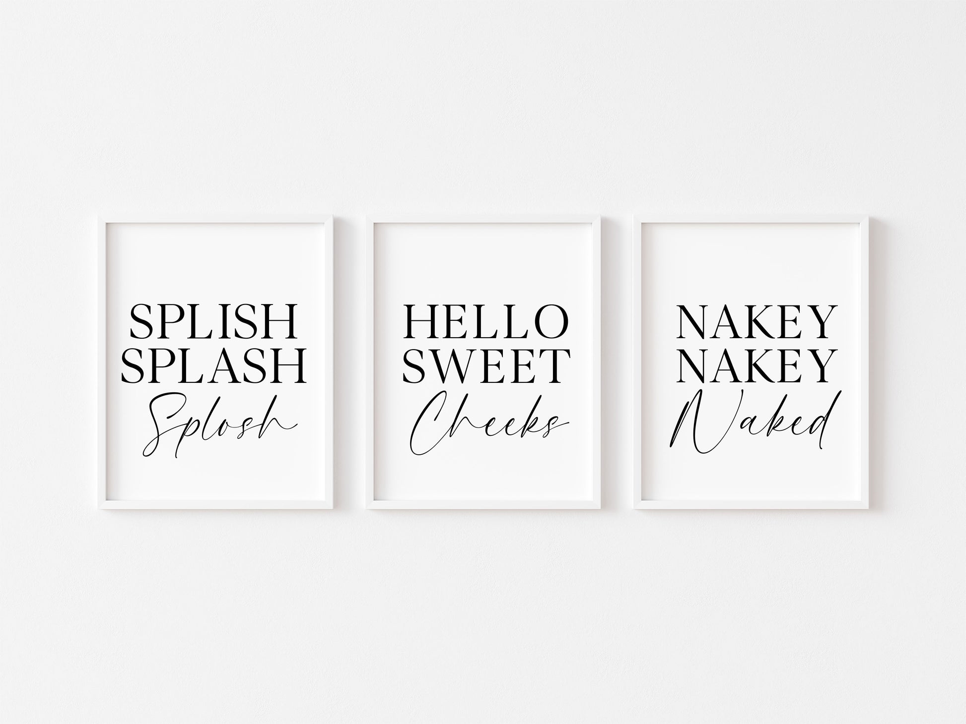 Set of 3 bathroom prints, splish splash splosh hello sweet cheeks nakey nakey naked set of bathroom signs unframed wall art bathroom prints