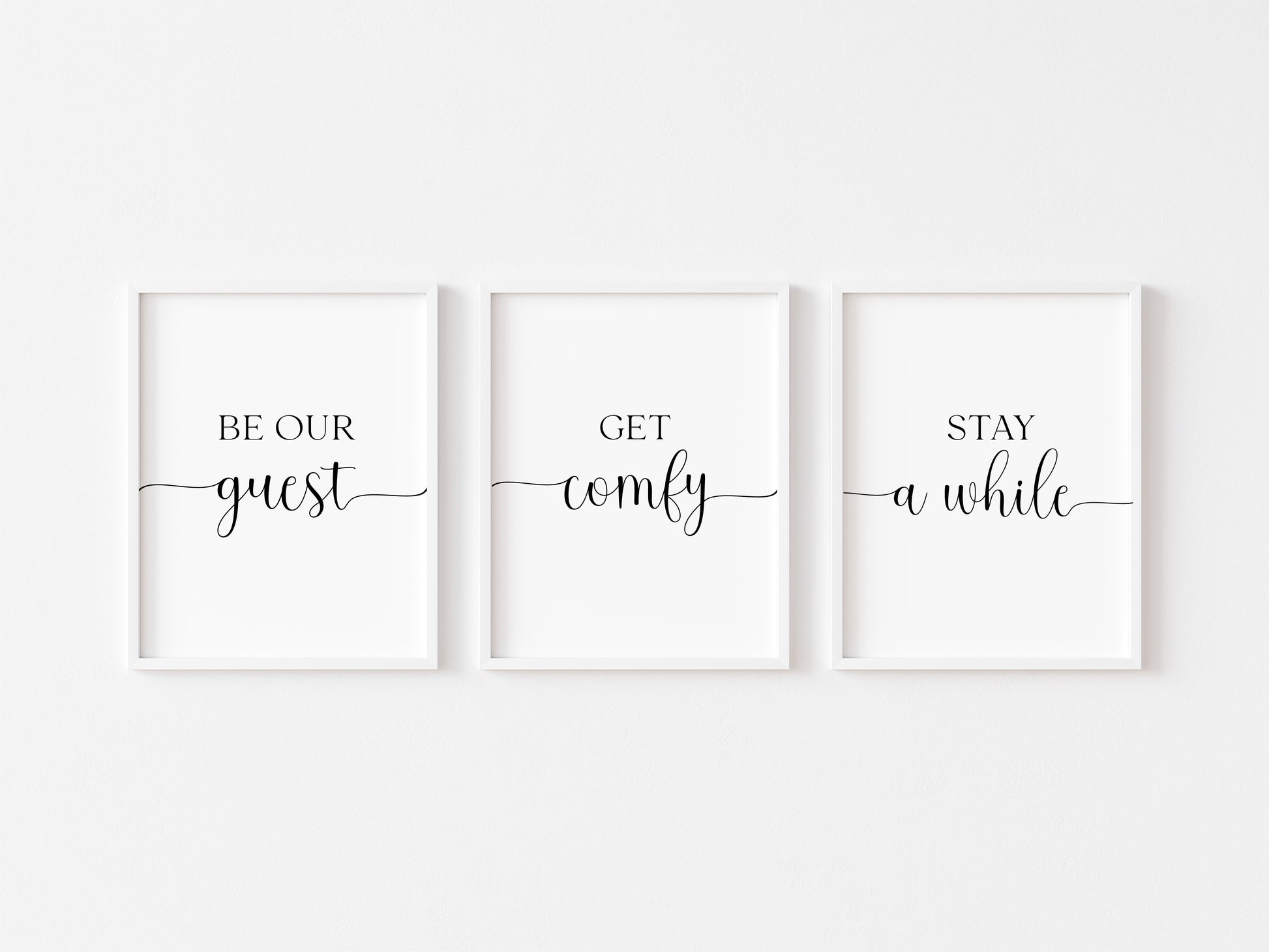 Set of 3 home guest bedroom, get comfy, be our guest, stay a while swirly borderless unframed wall art prints