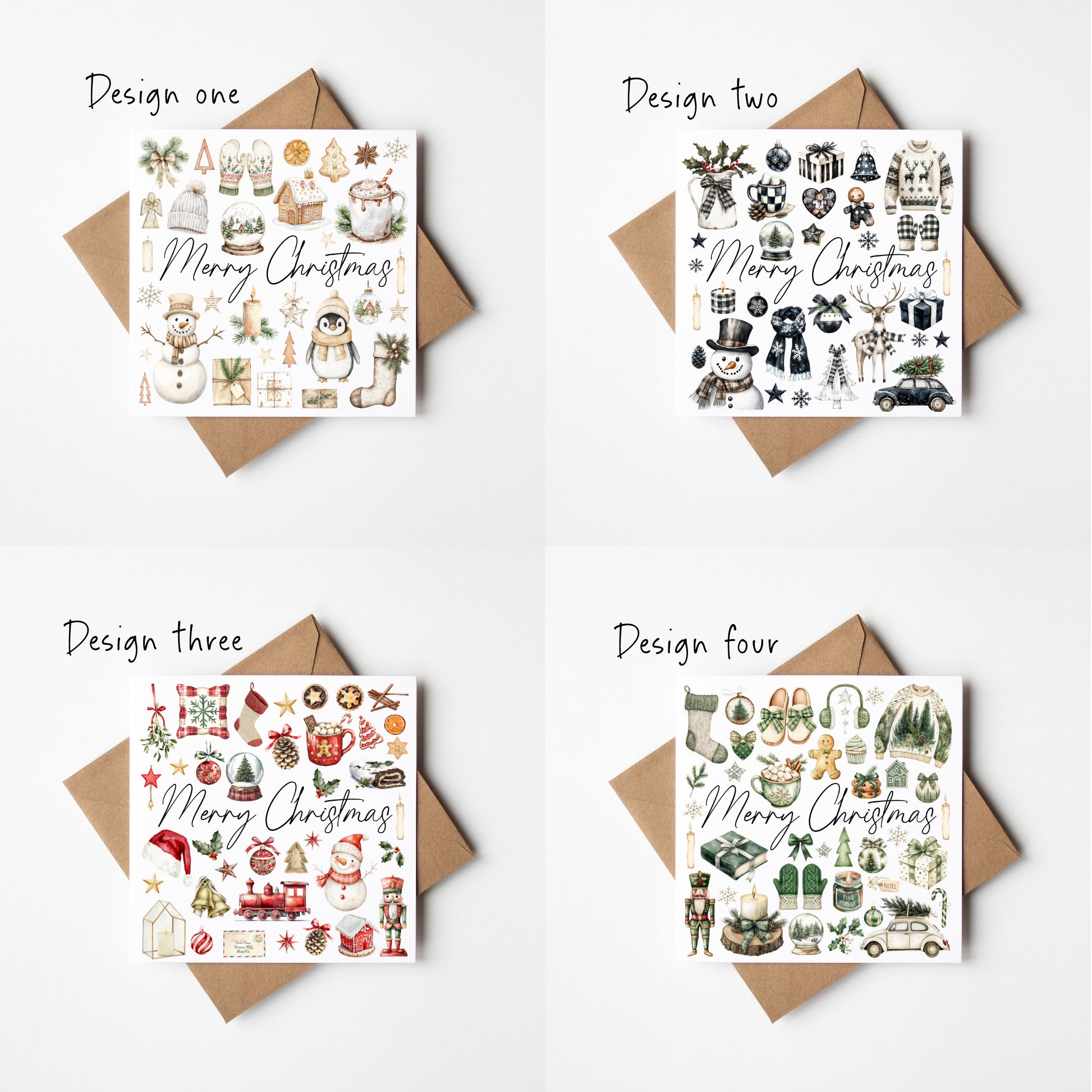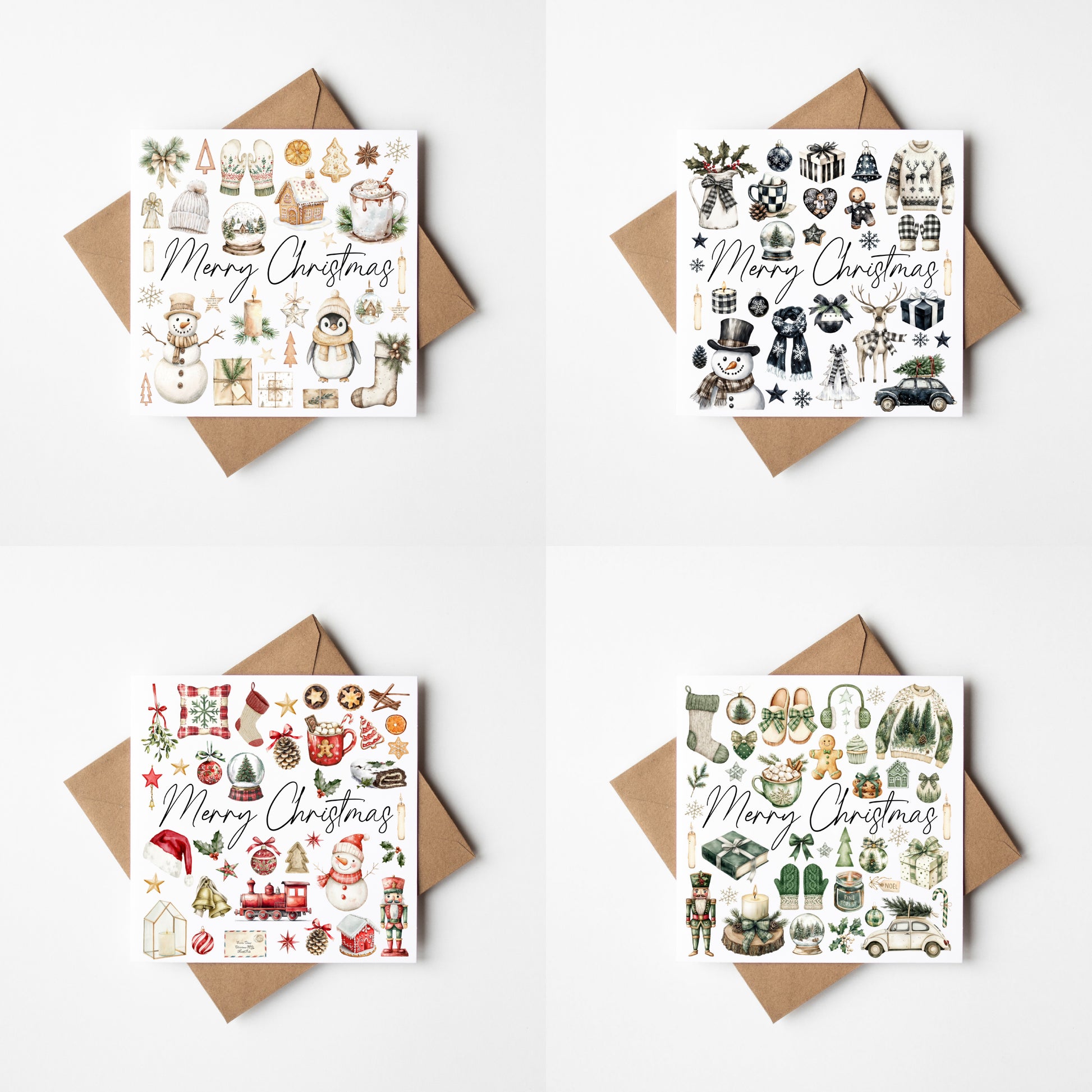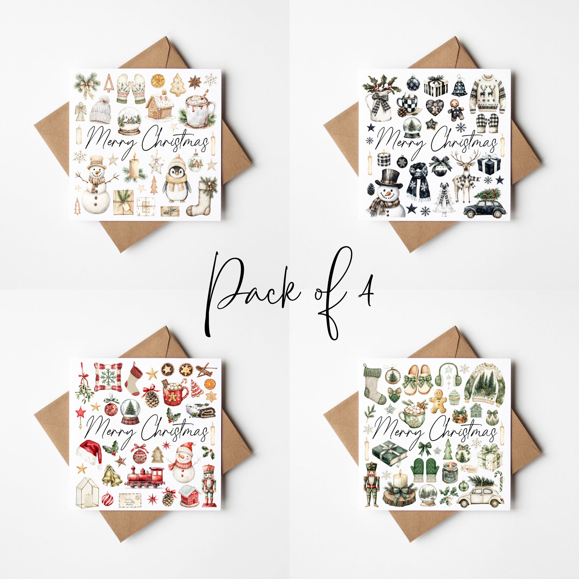 Christmas cards Festive red green beige and monochrome xmas cards - Pack of 4 with envelopes
