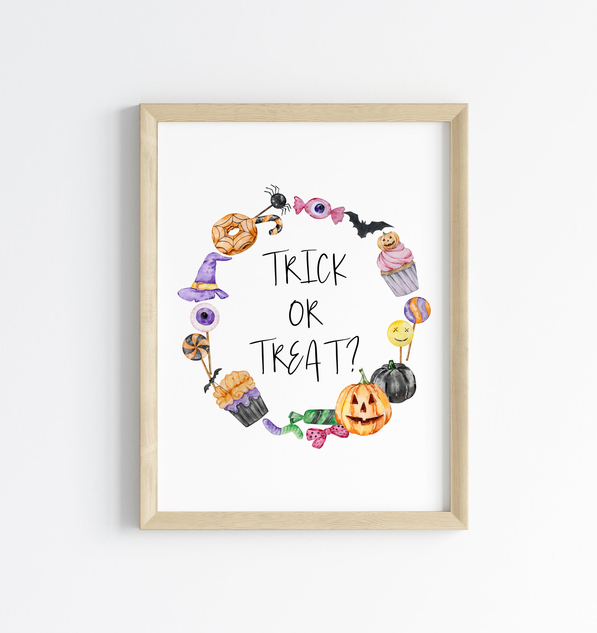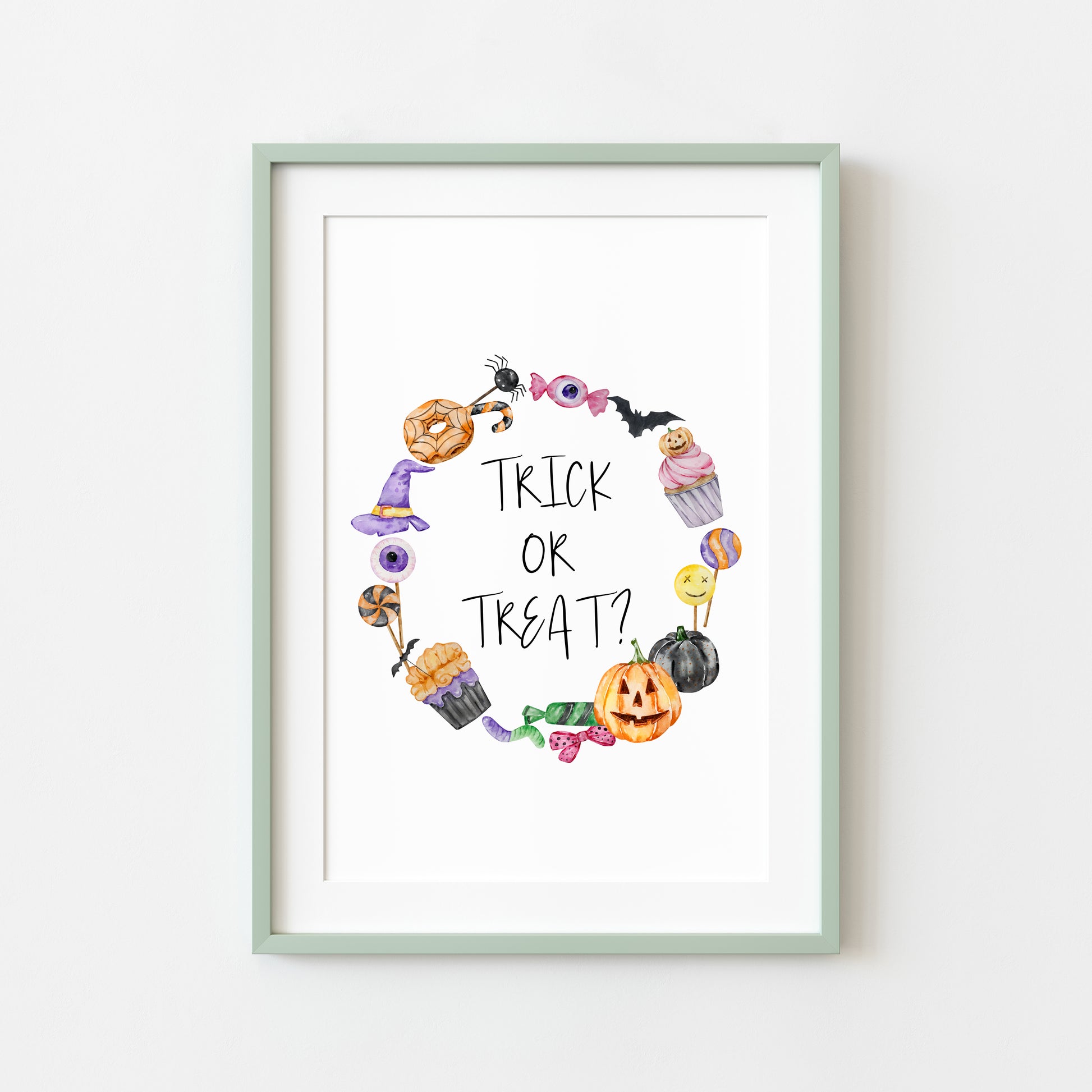 Trick or treat, watercolour wreath halloween sweet treat spooky trick or treat sign unframed wall art poster print