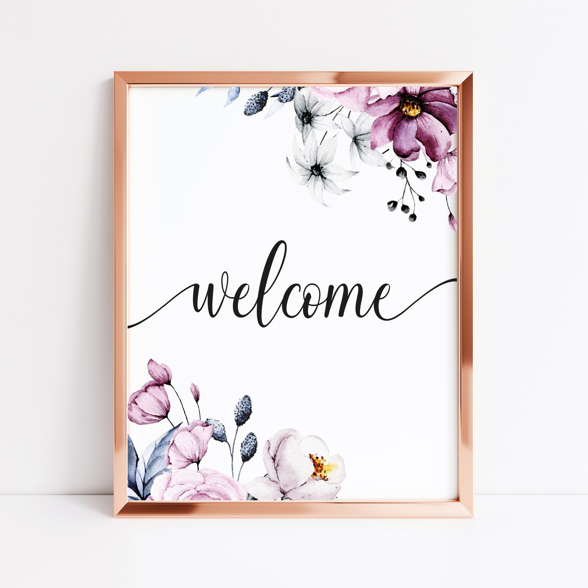 Welcome purple blue floral border home hallway welcome sign unframed wall art poster print