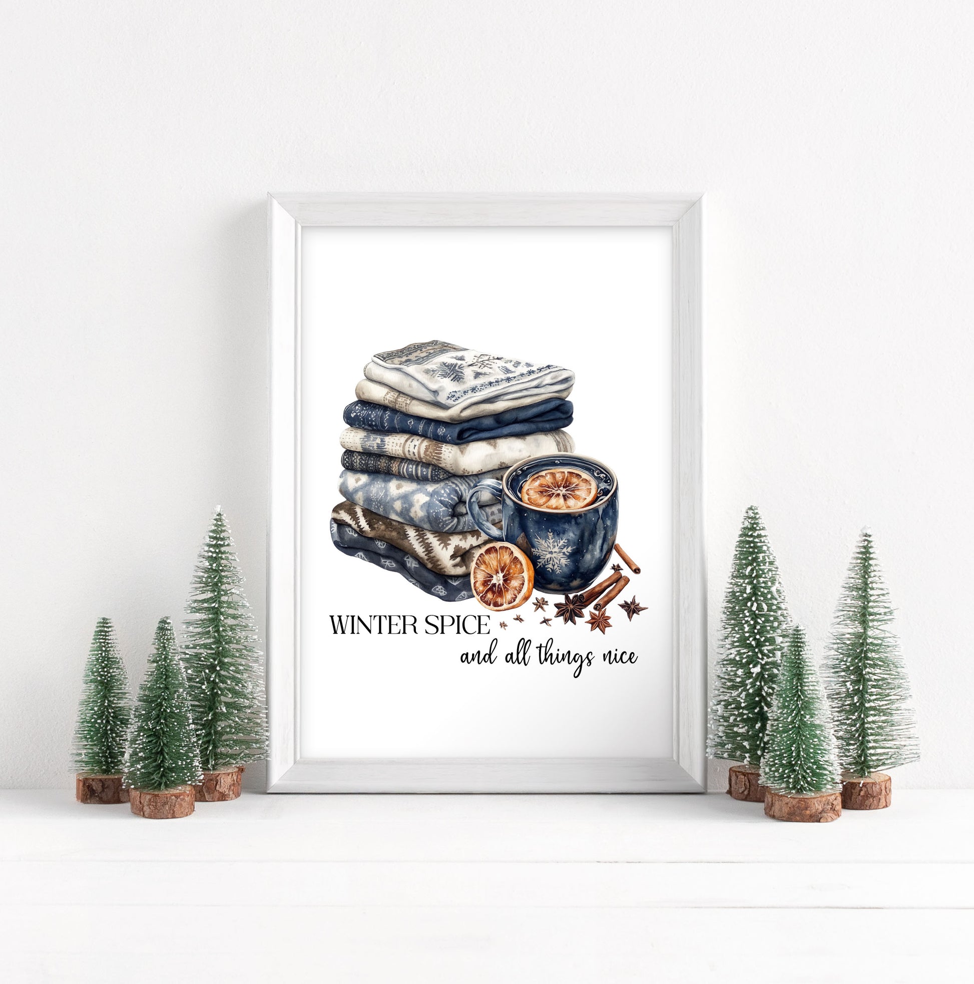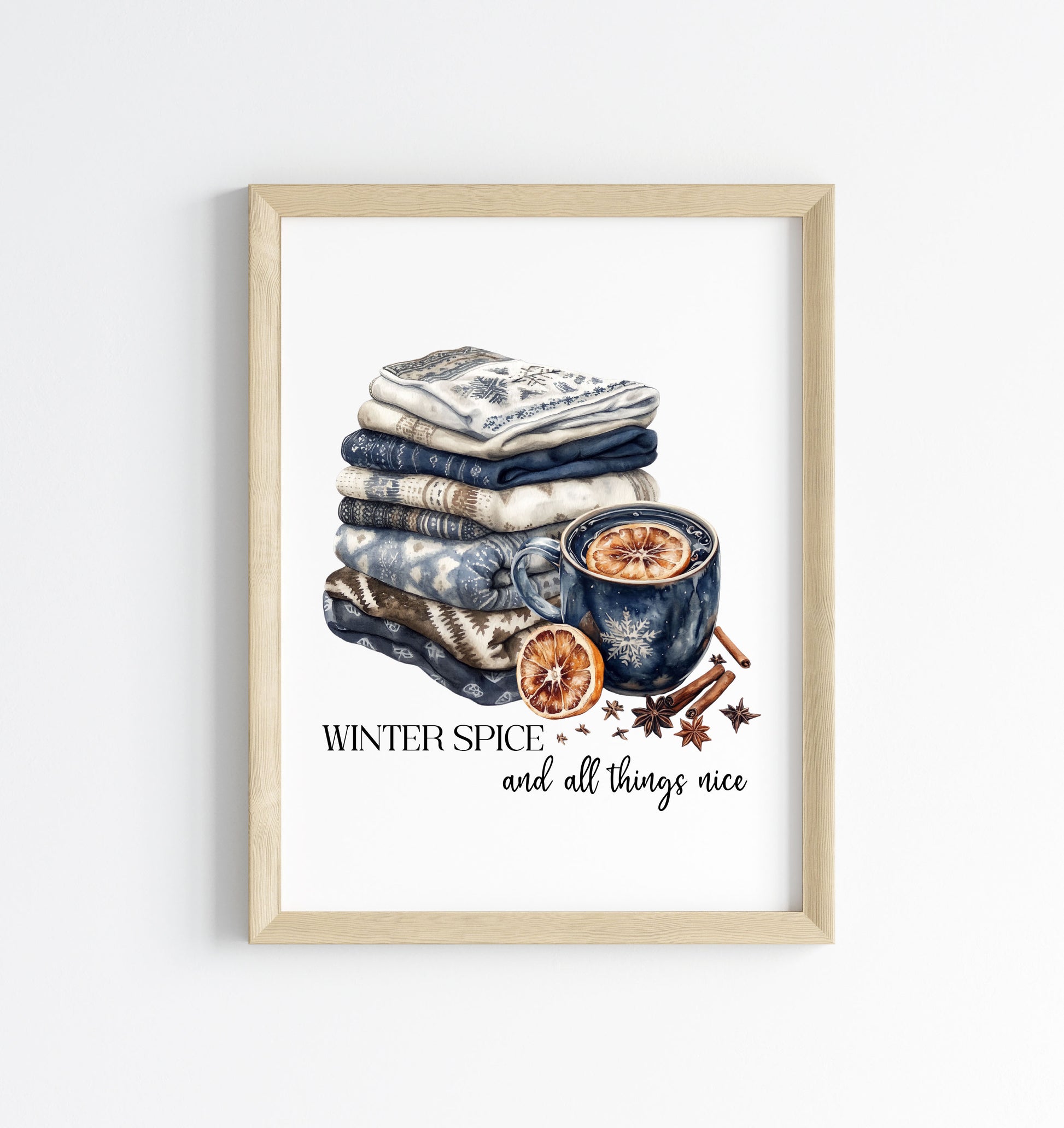 Winter spice art Christmas Blue cosy knit Watercolour seasonal unframed wall art poster print